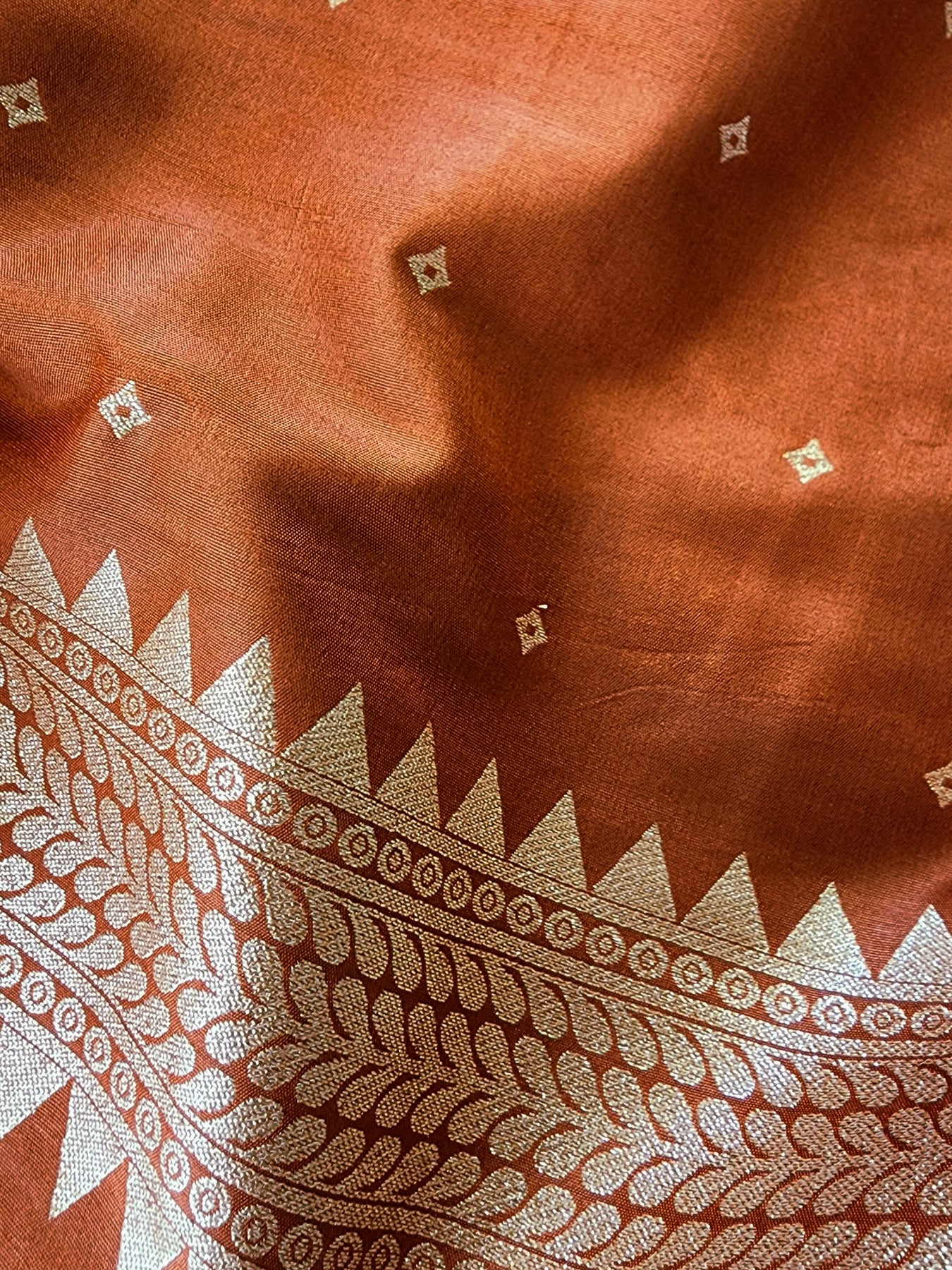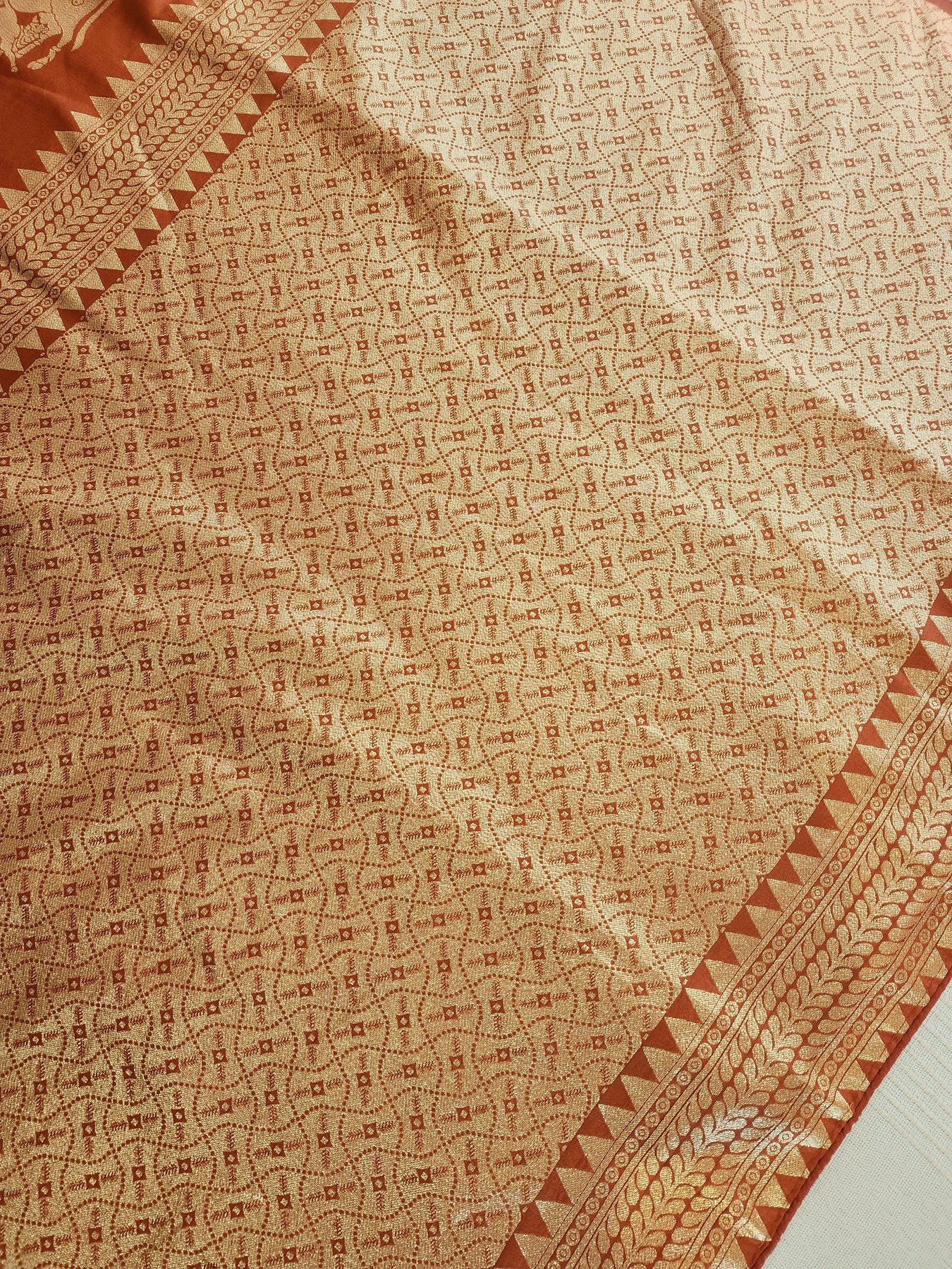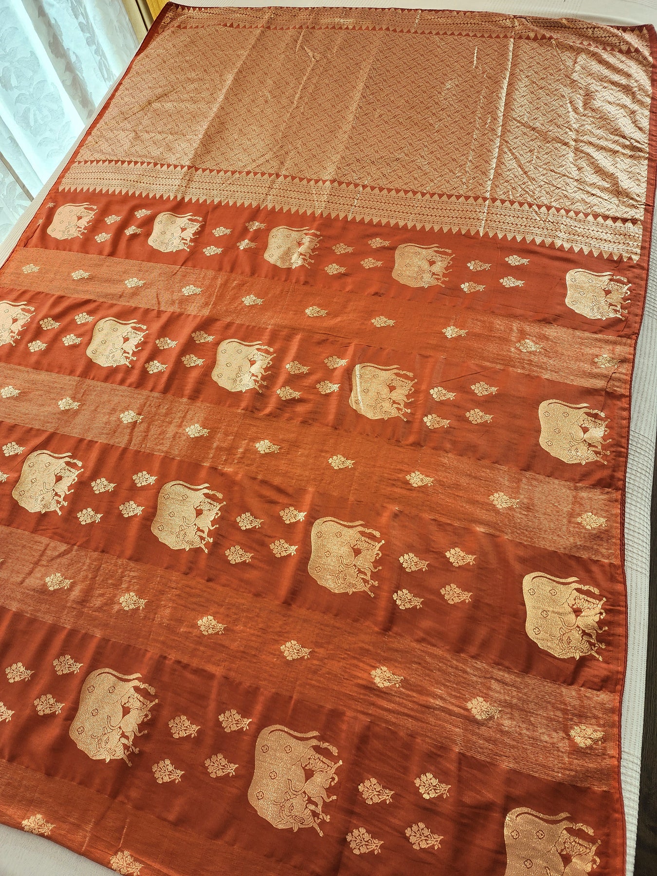 An elegant Burnt Orange Tissue Crepe Silk Saree with contrast borders