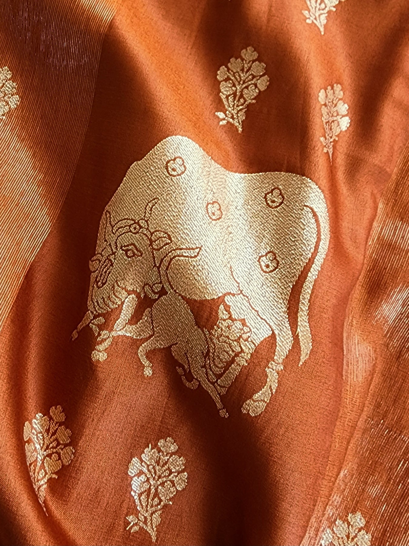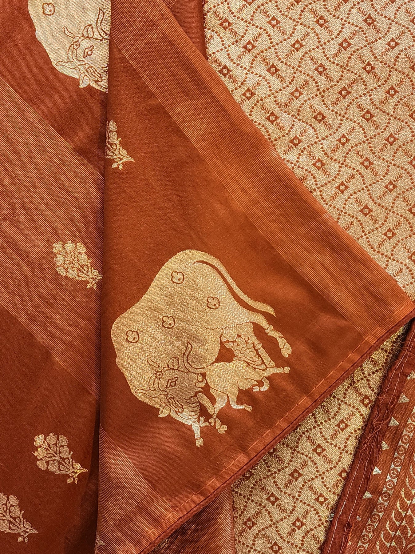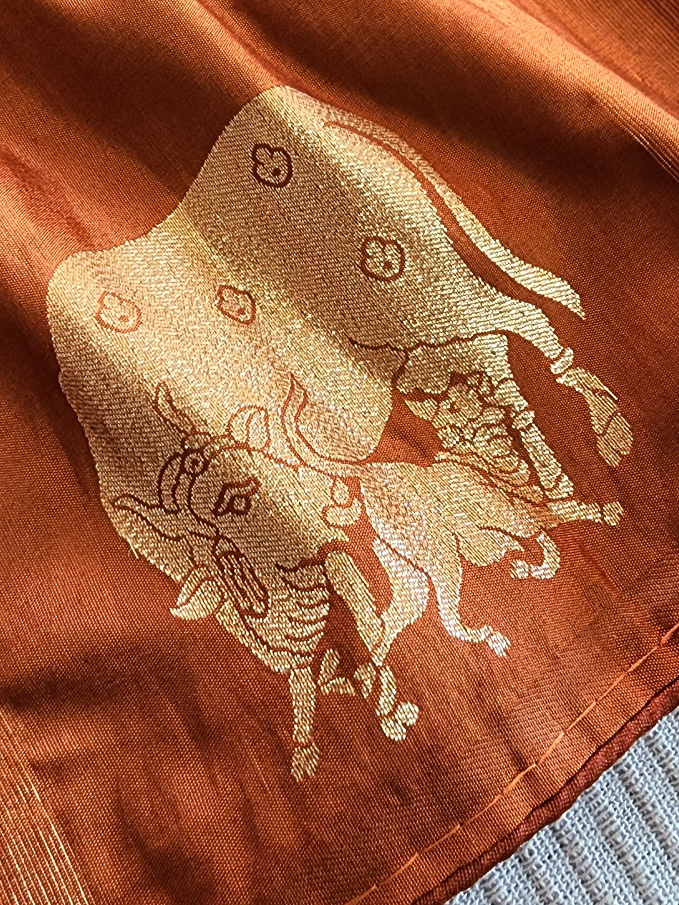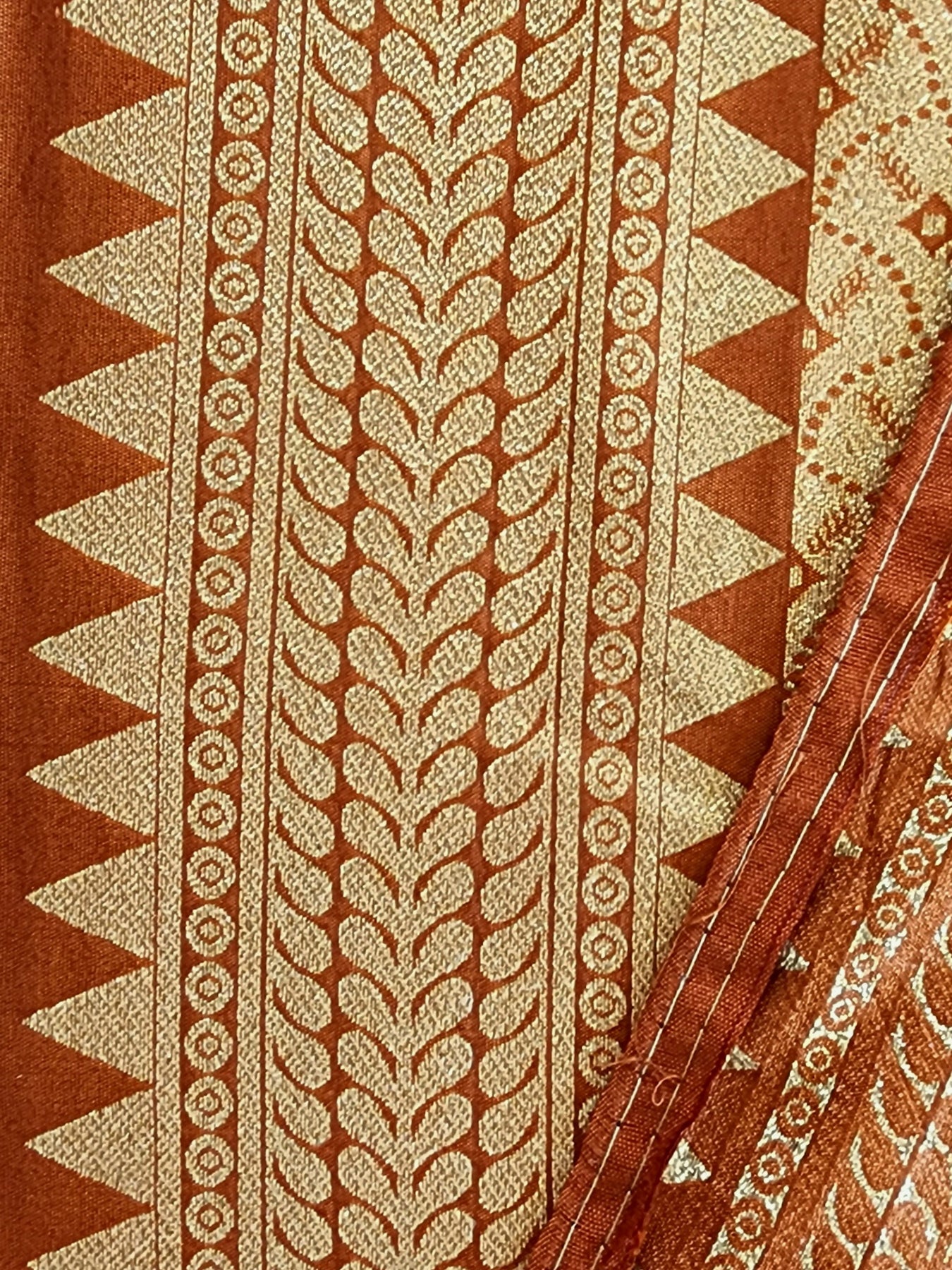 An elegant Burnt Orange Tissue Crepe Silk Saree with contrast borders