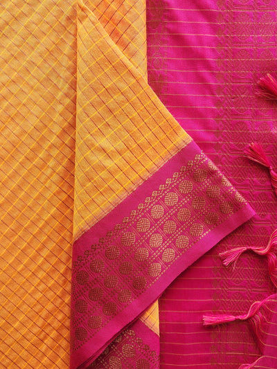 Checked Orange Silk Cotton Saree with Contrast Borders