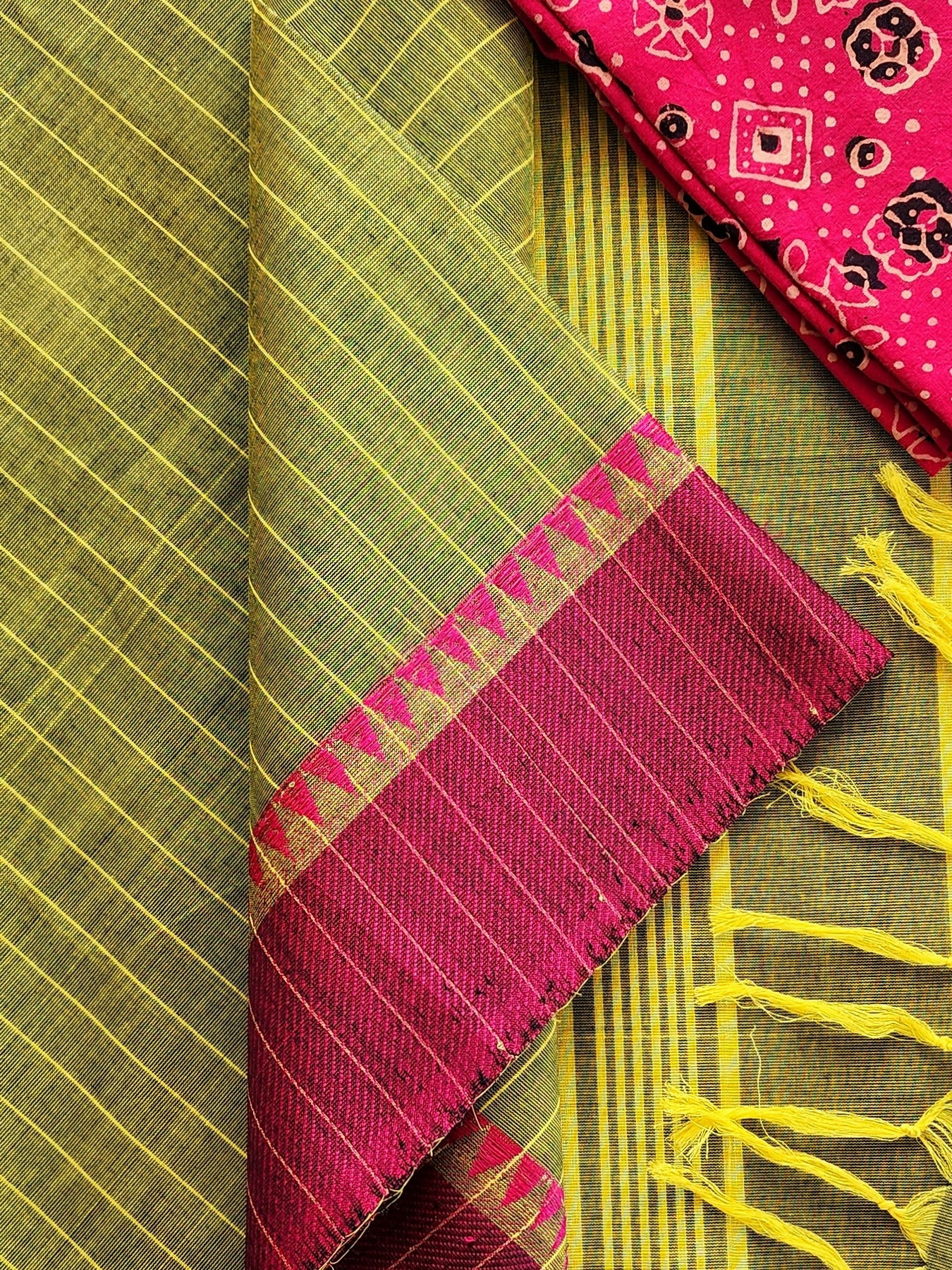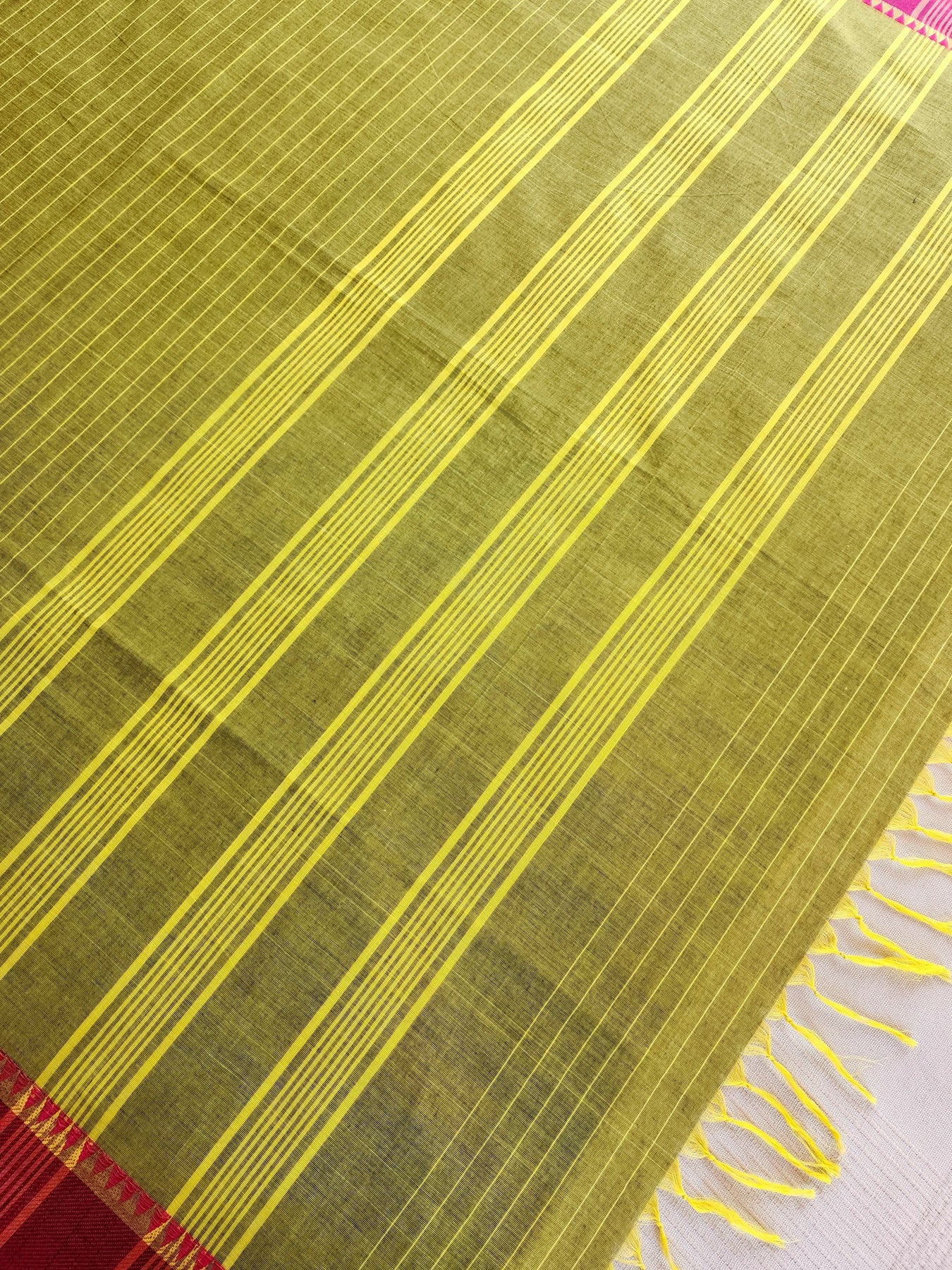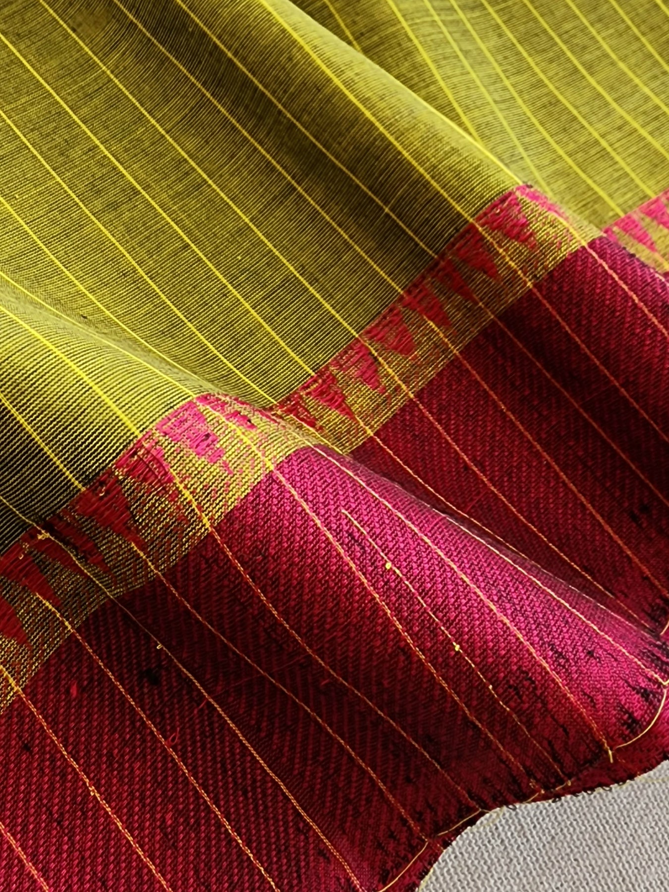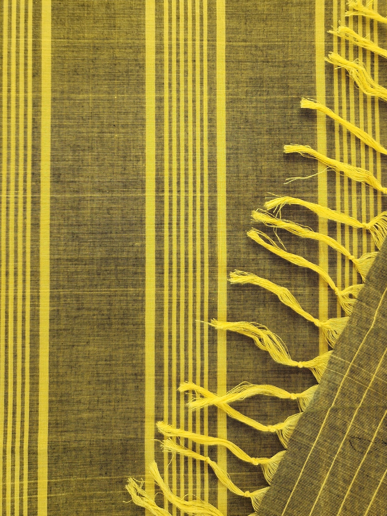 with contrast Borders and a striped pallu, beautifully finished with tassels