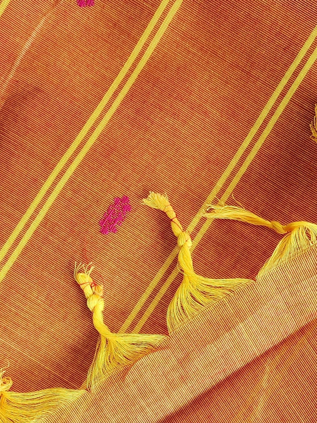with Pink Borders and a striped pallu, beautifully finished with tassels