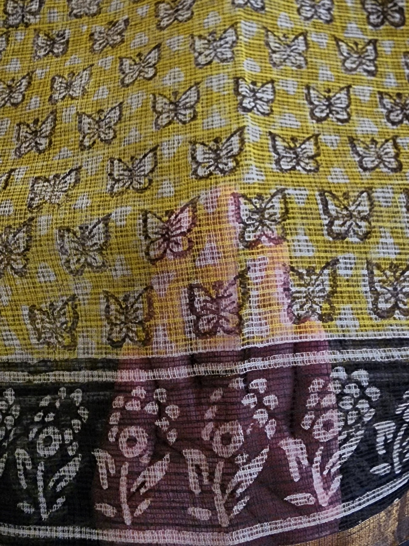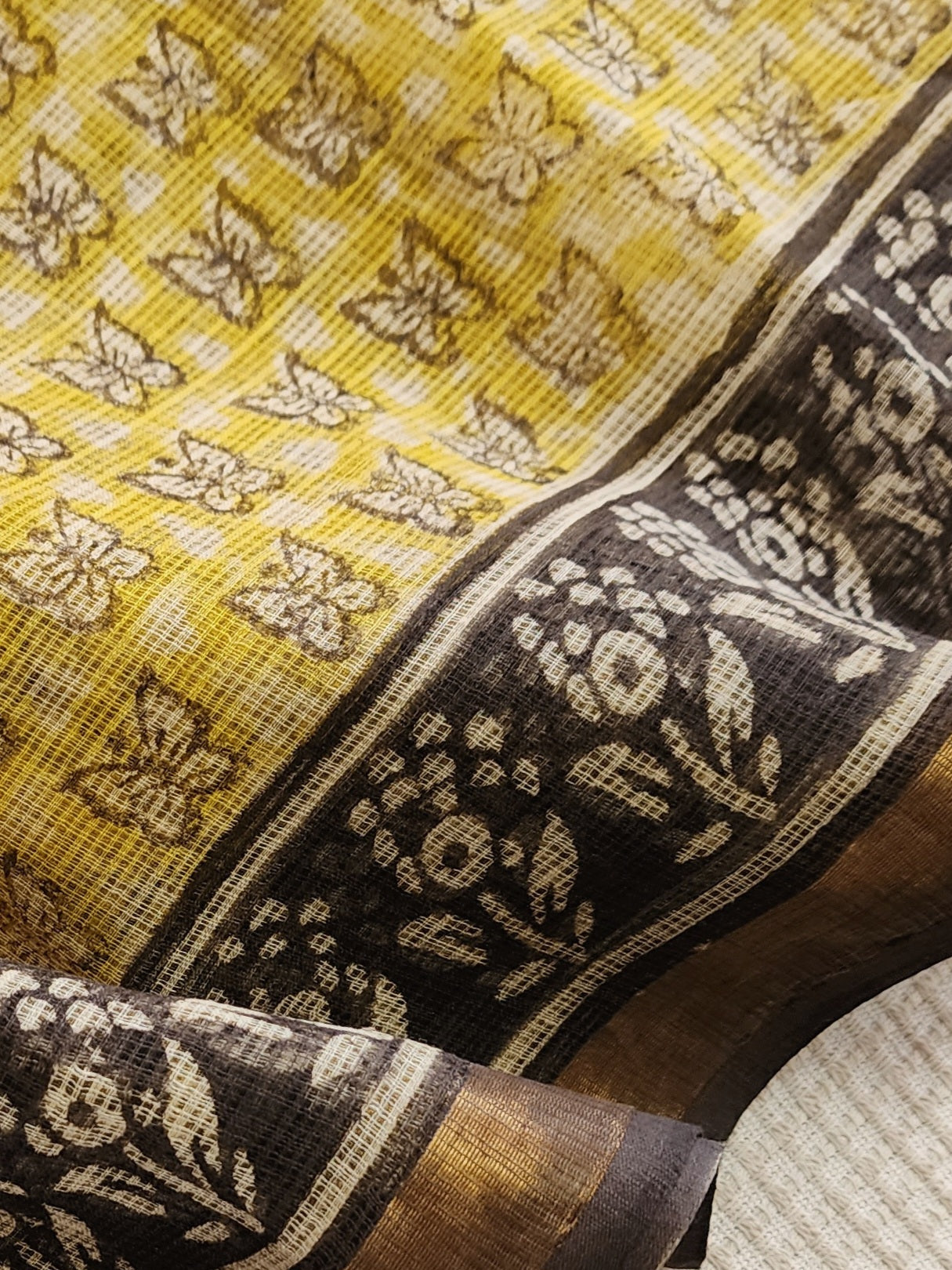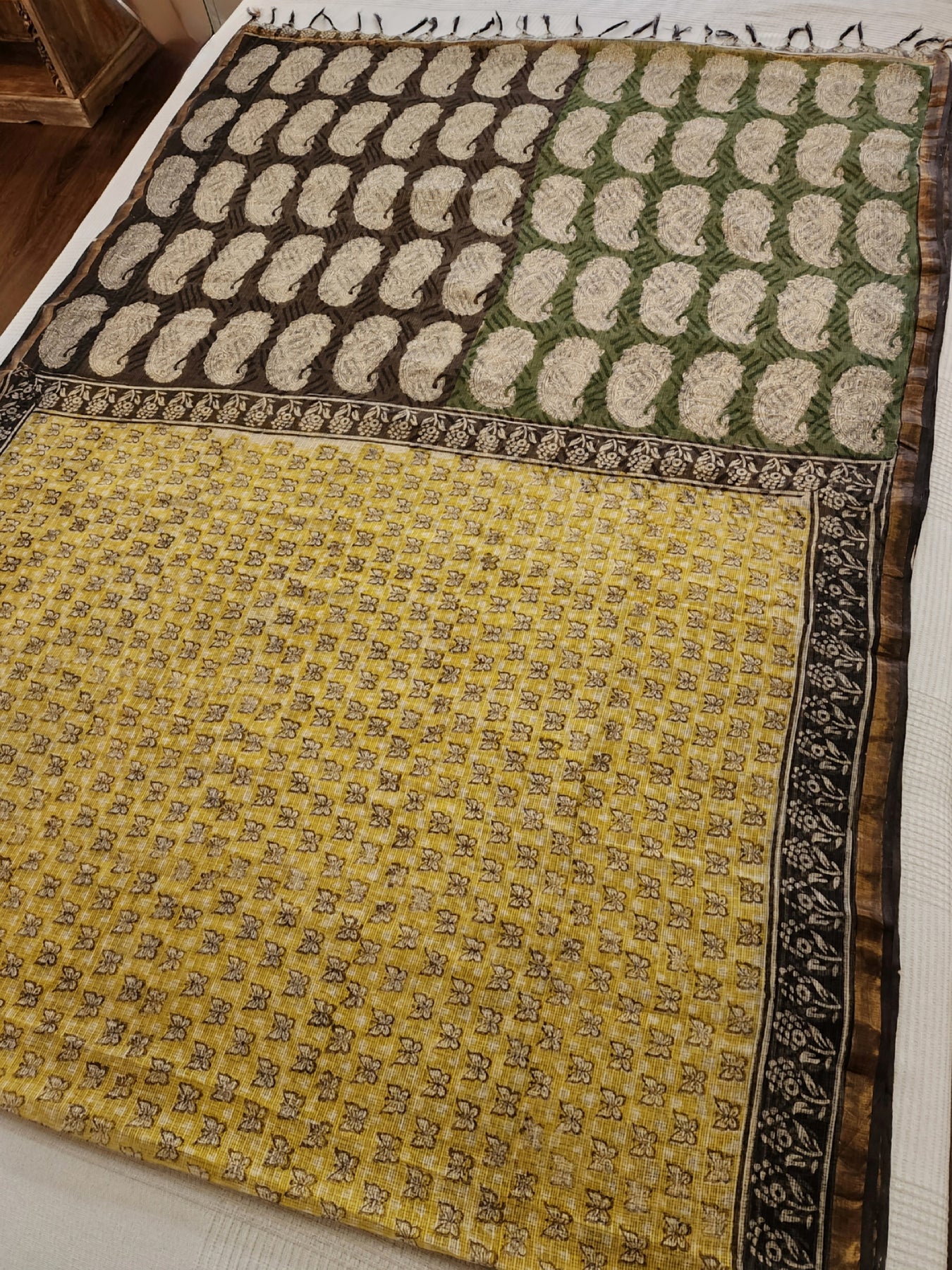 Beautiful saree with Gold borders and Block Prints on the Body & Pallu