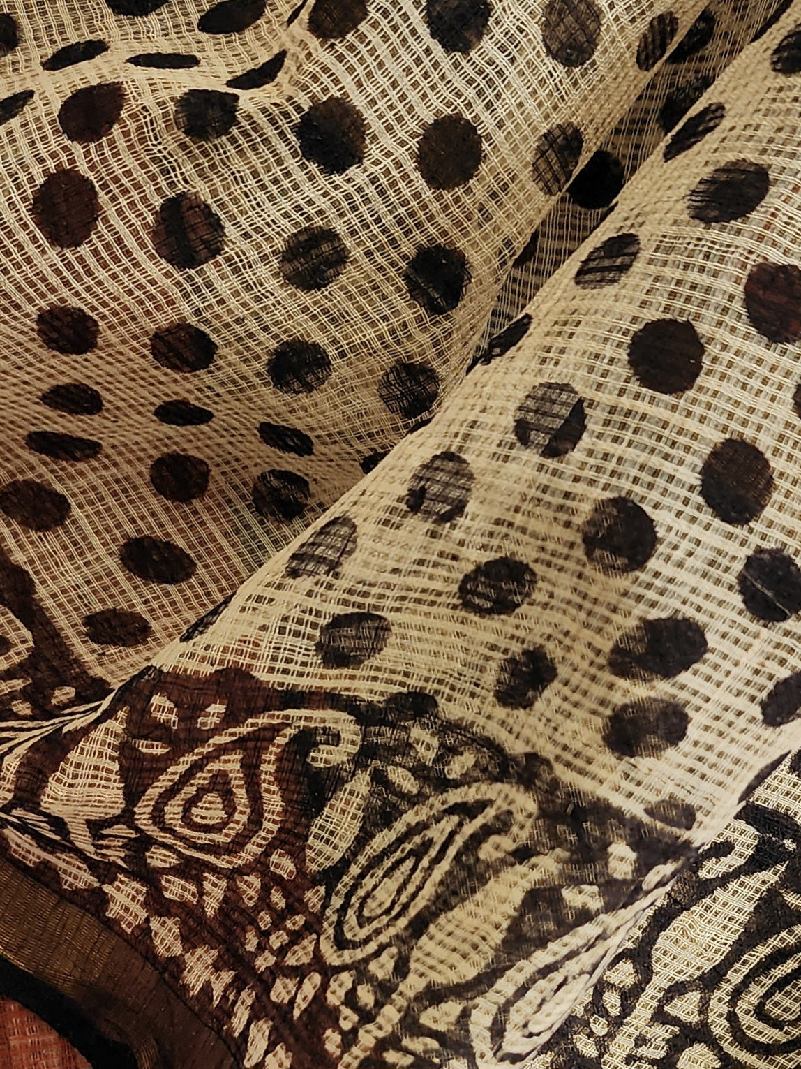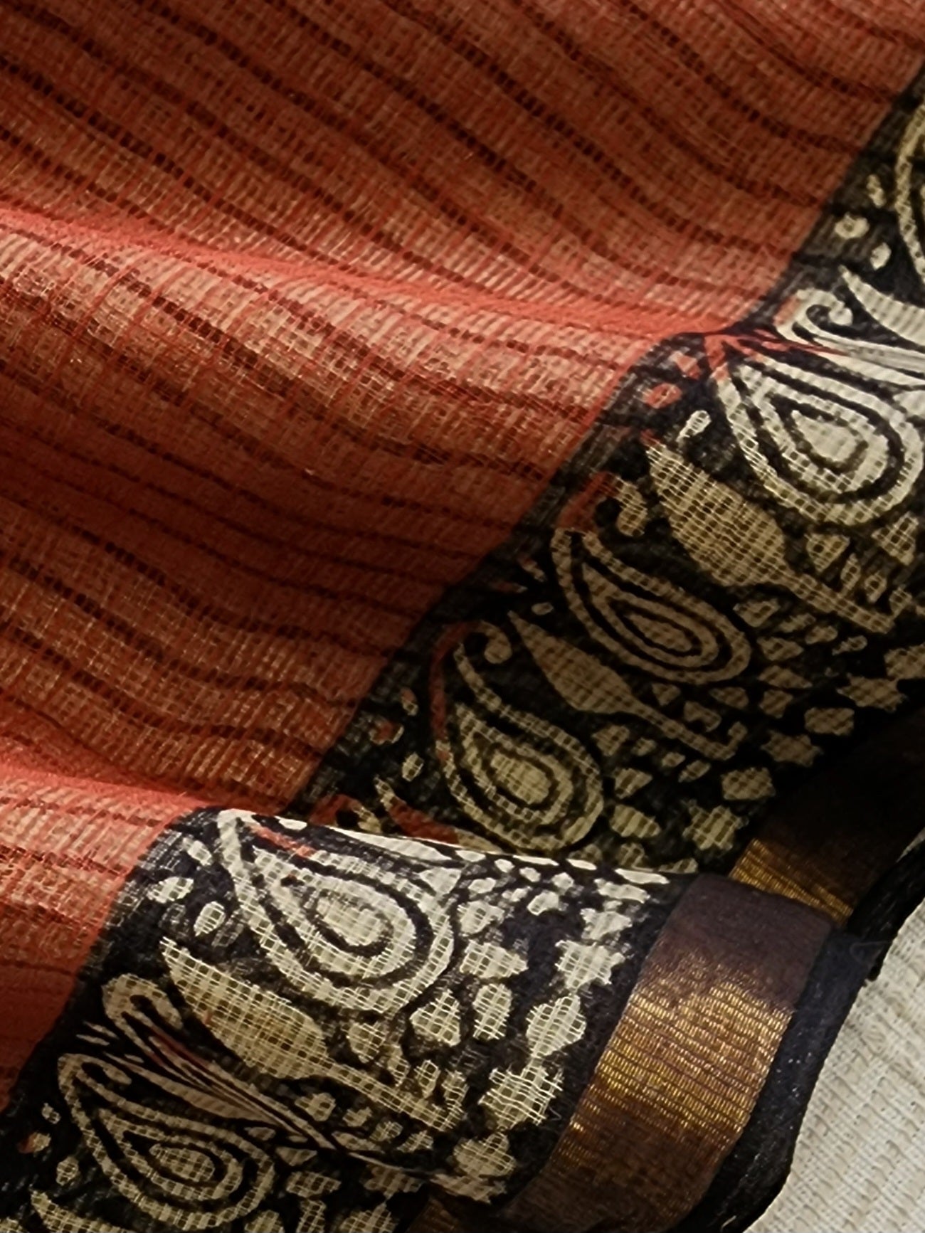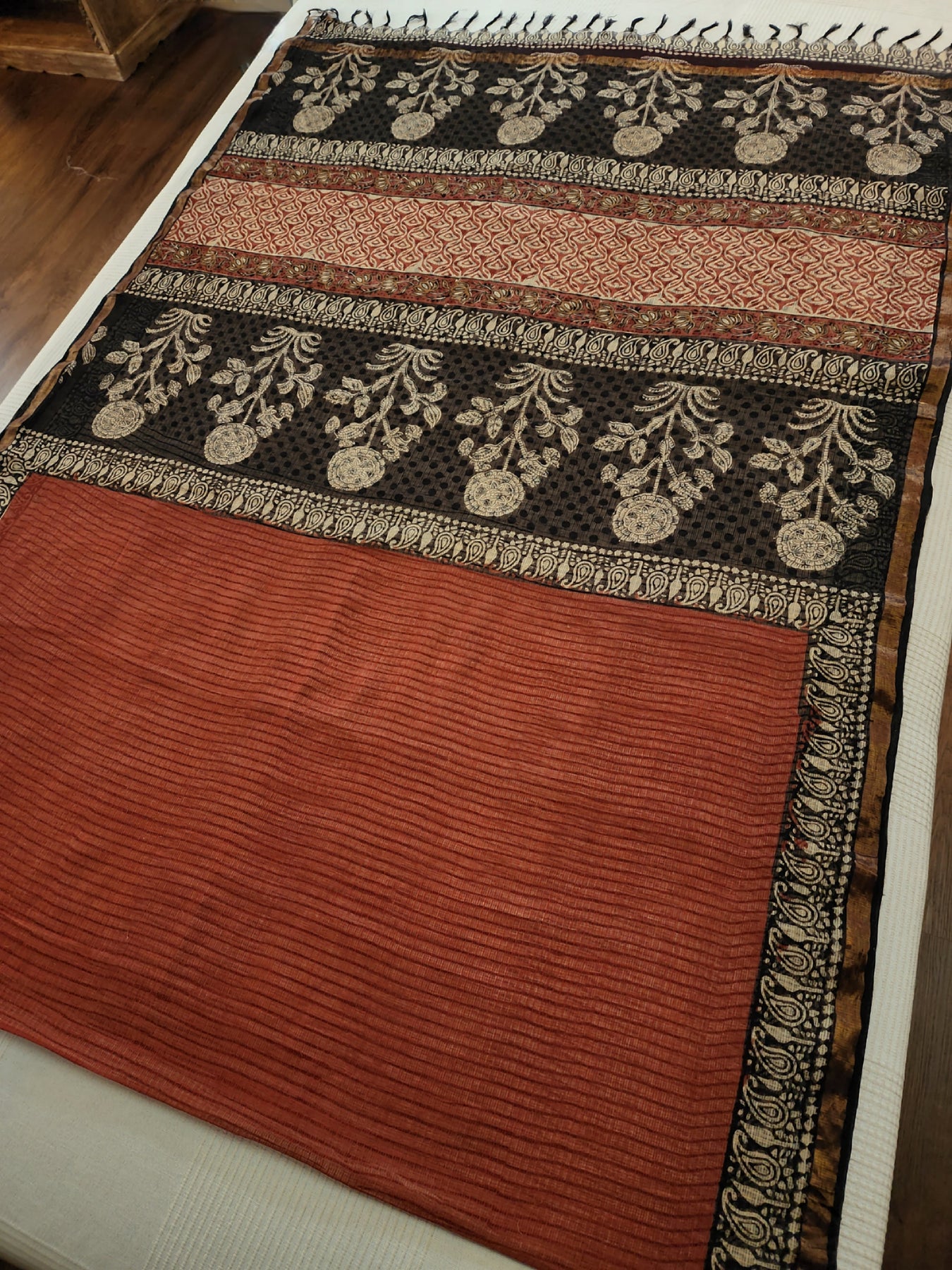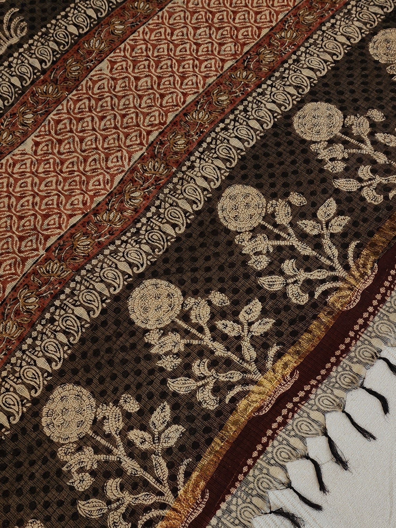 Beautiful saree with Gold borders and Block Prints on the Body & Pallu