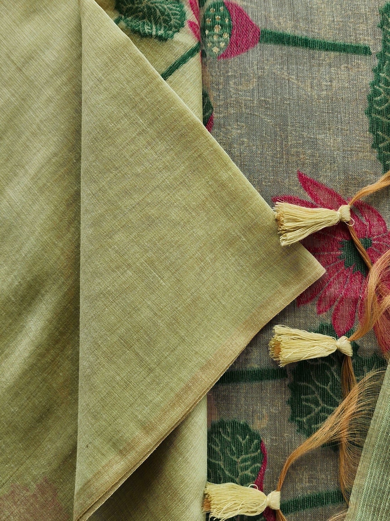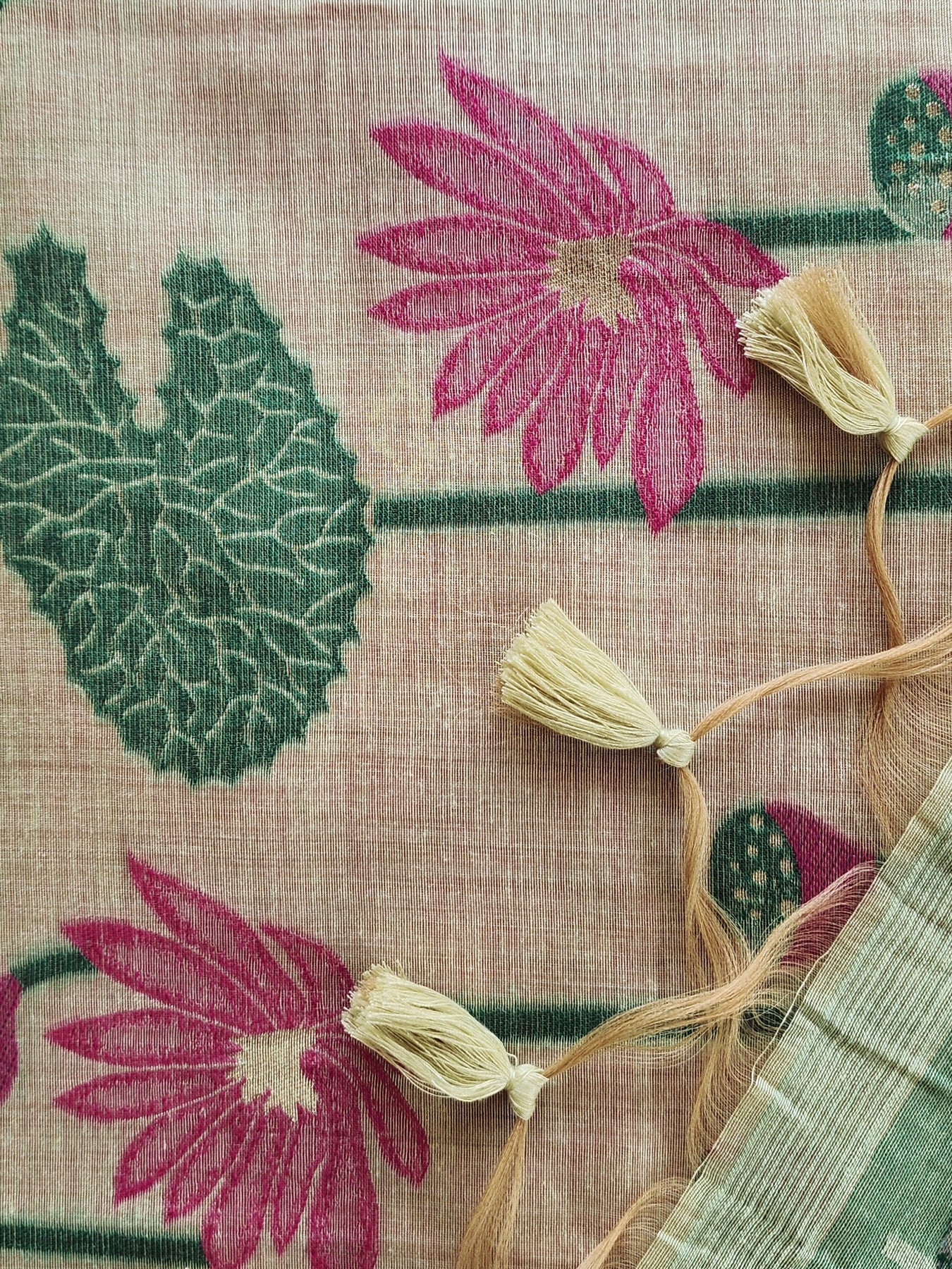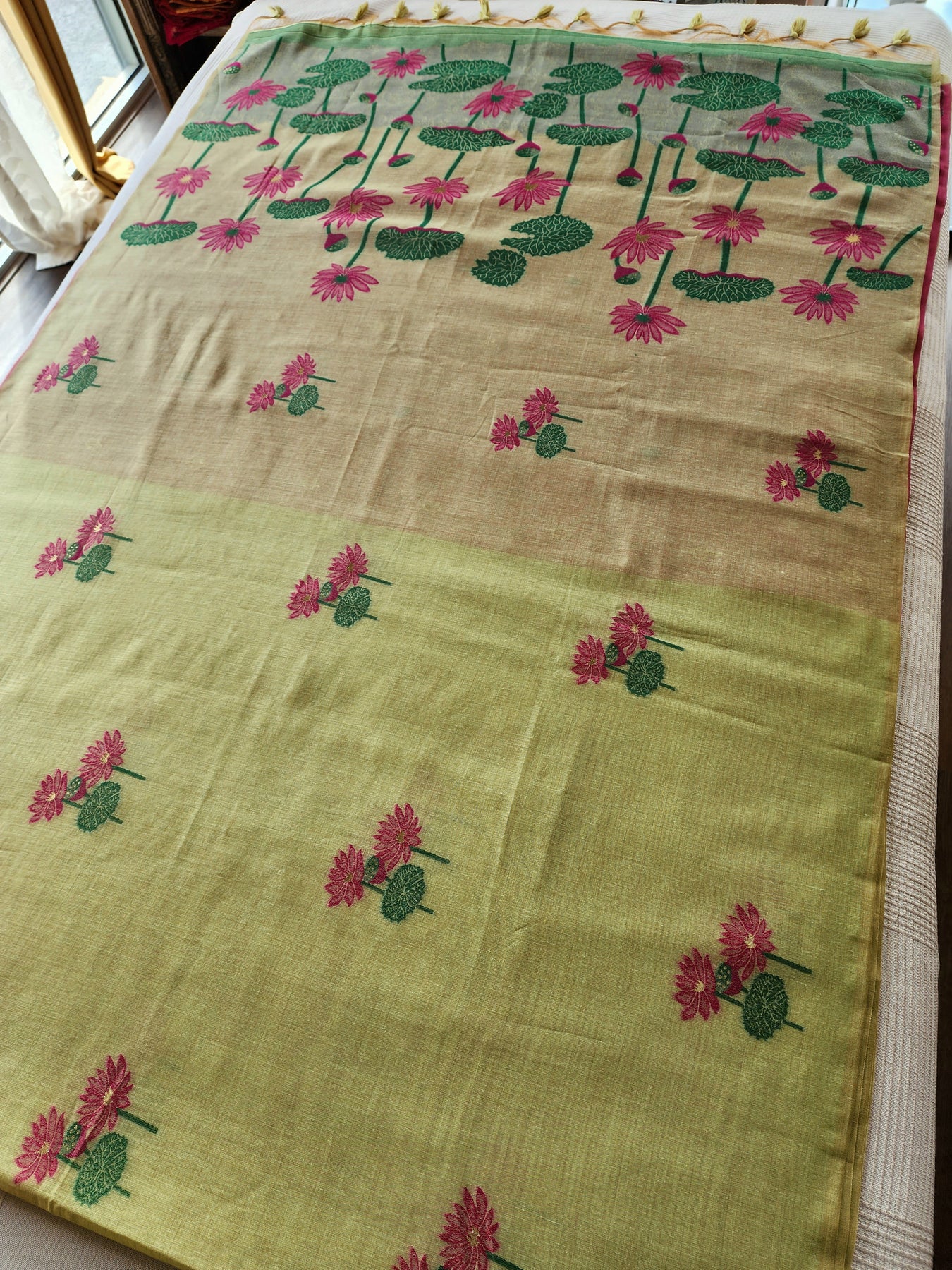 • Linen Cotton Saree, with Florals on the body and pallu, beautifully finished with tassels