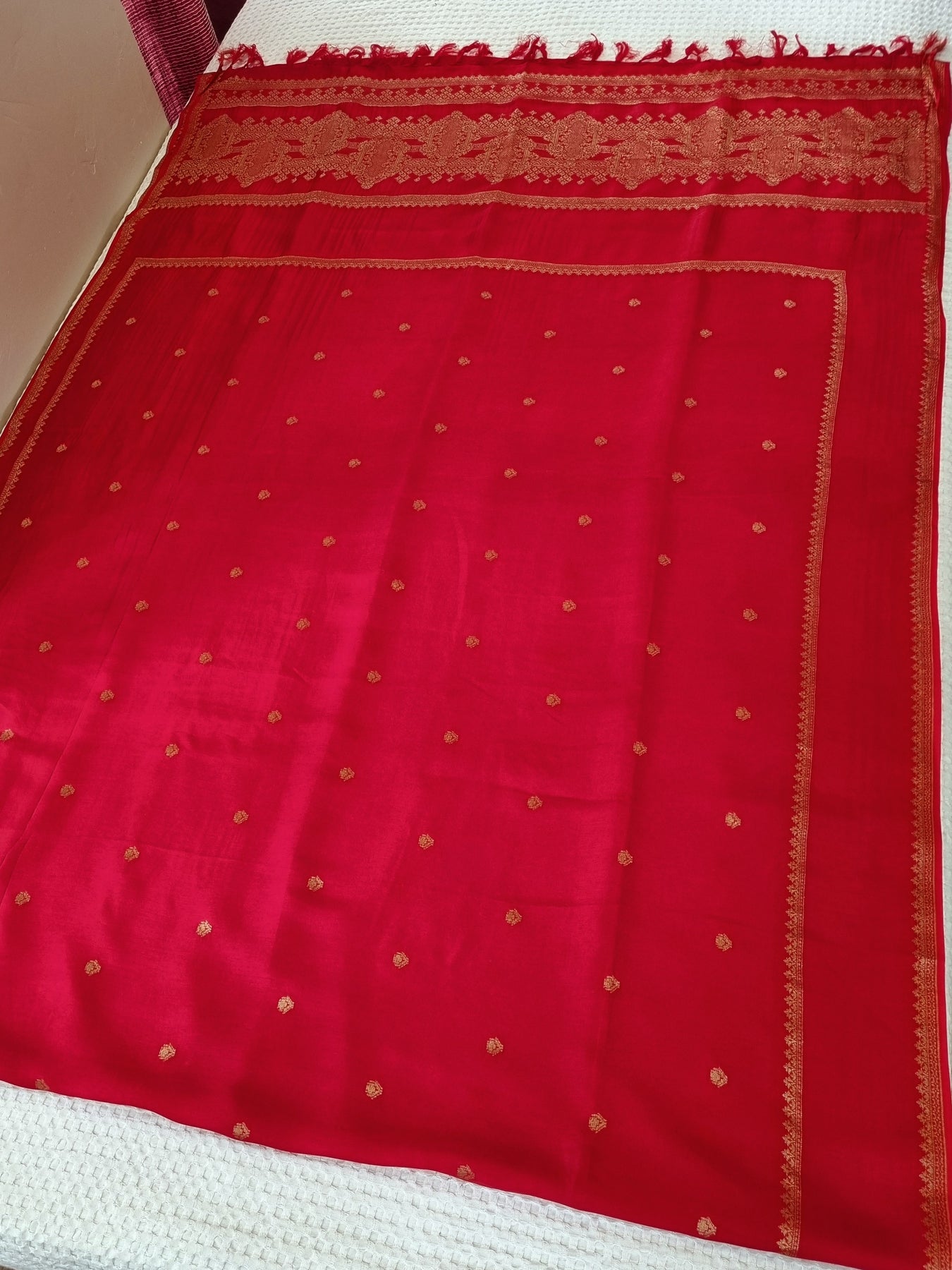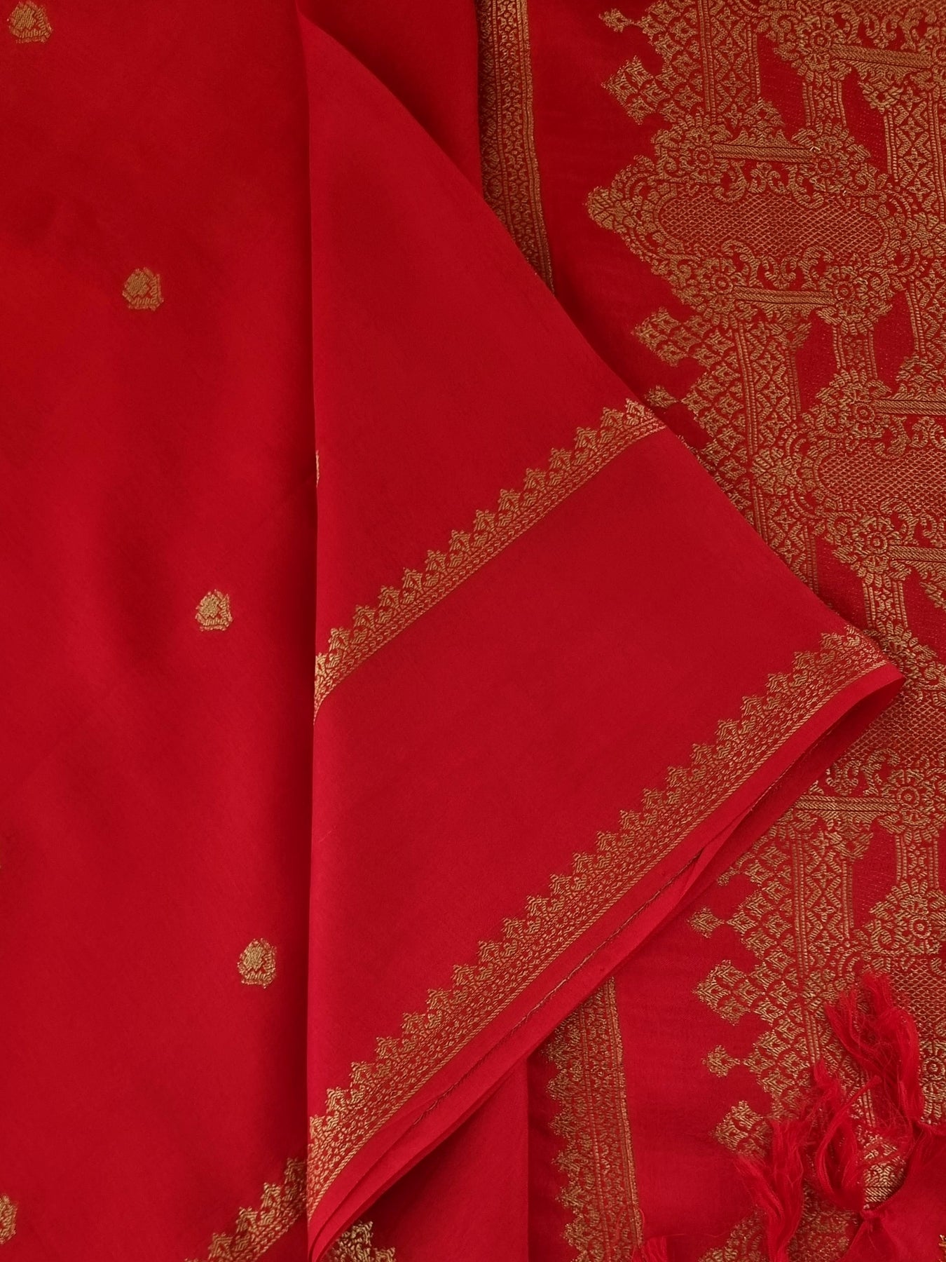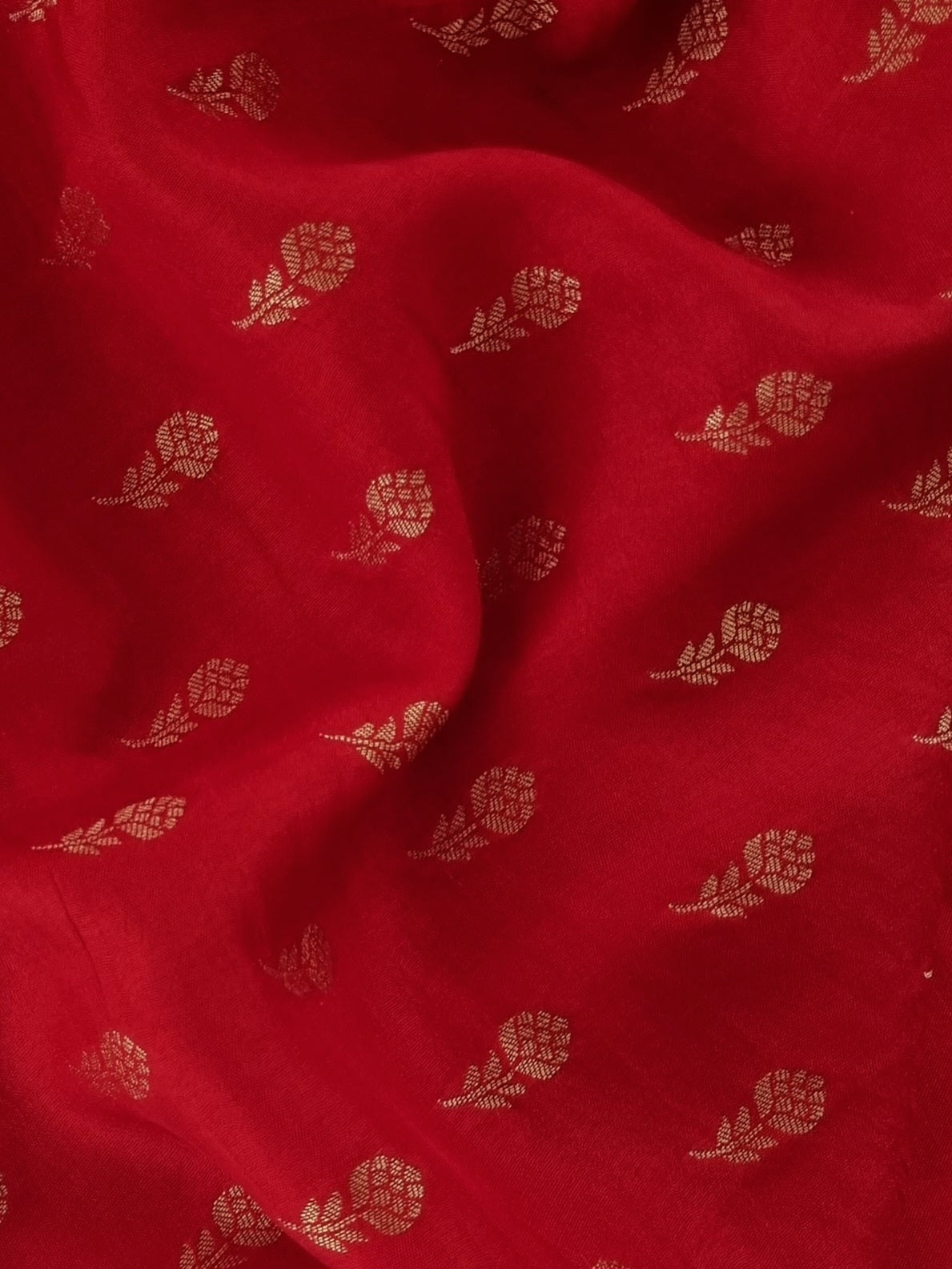Red Semi Crepe Silk Saree, with woven borders, paired with a running Blouse fabric