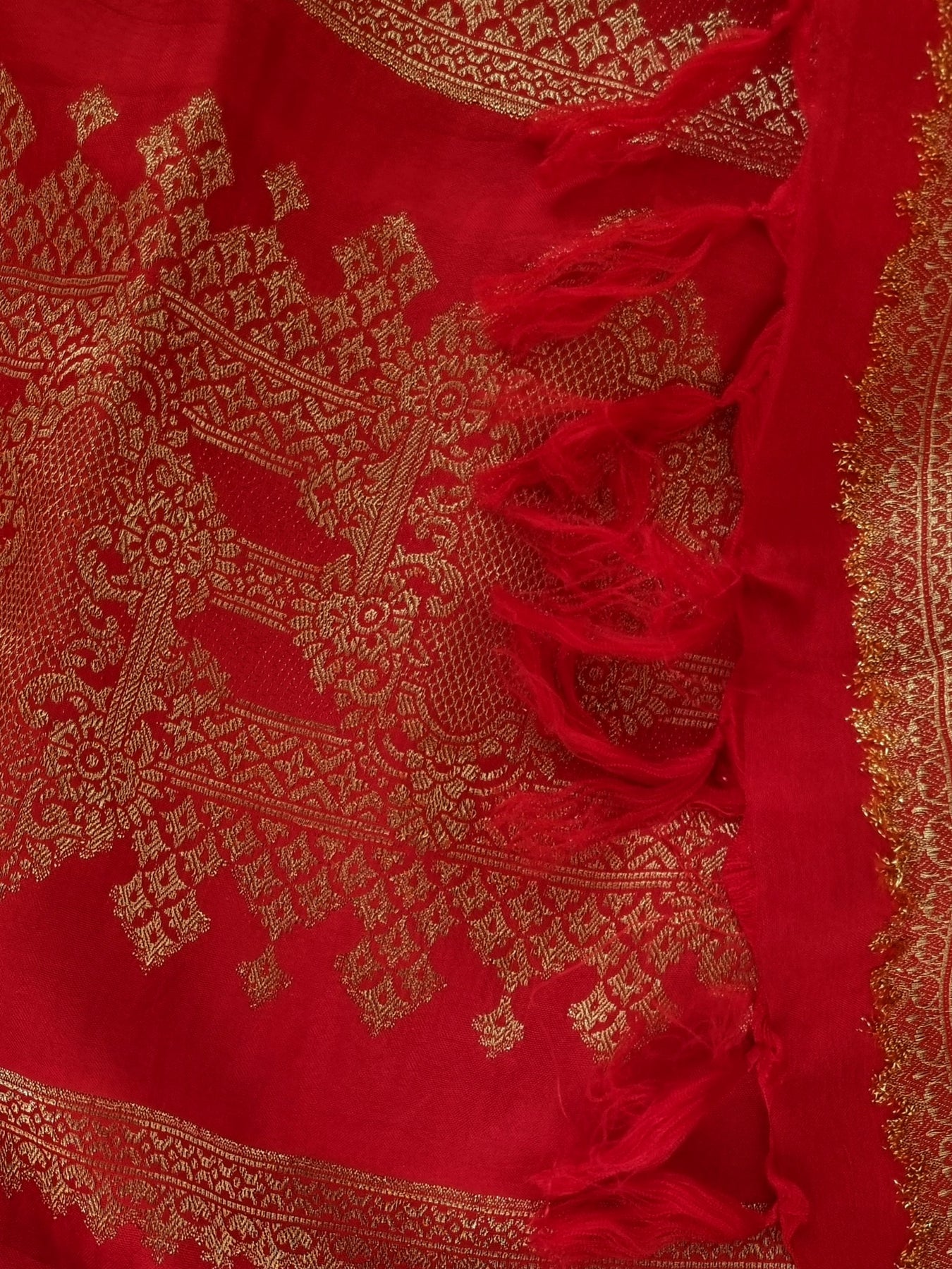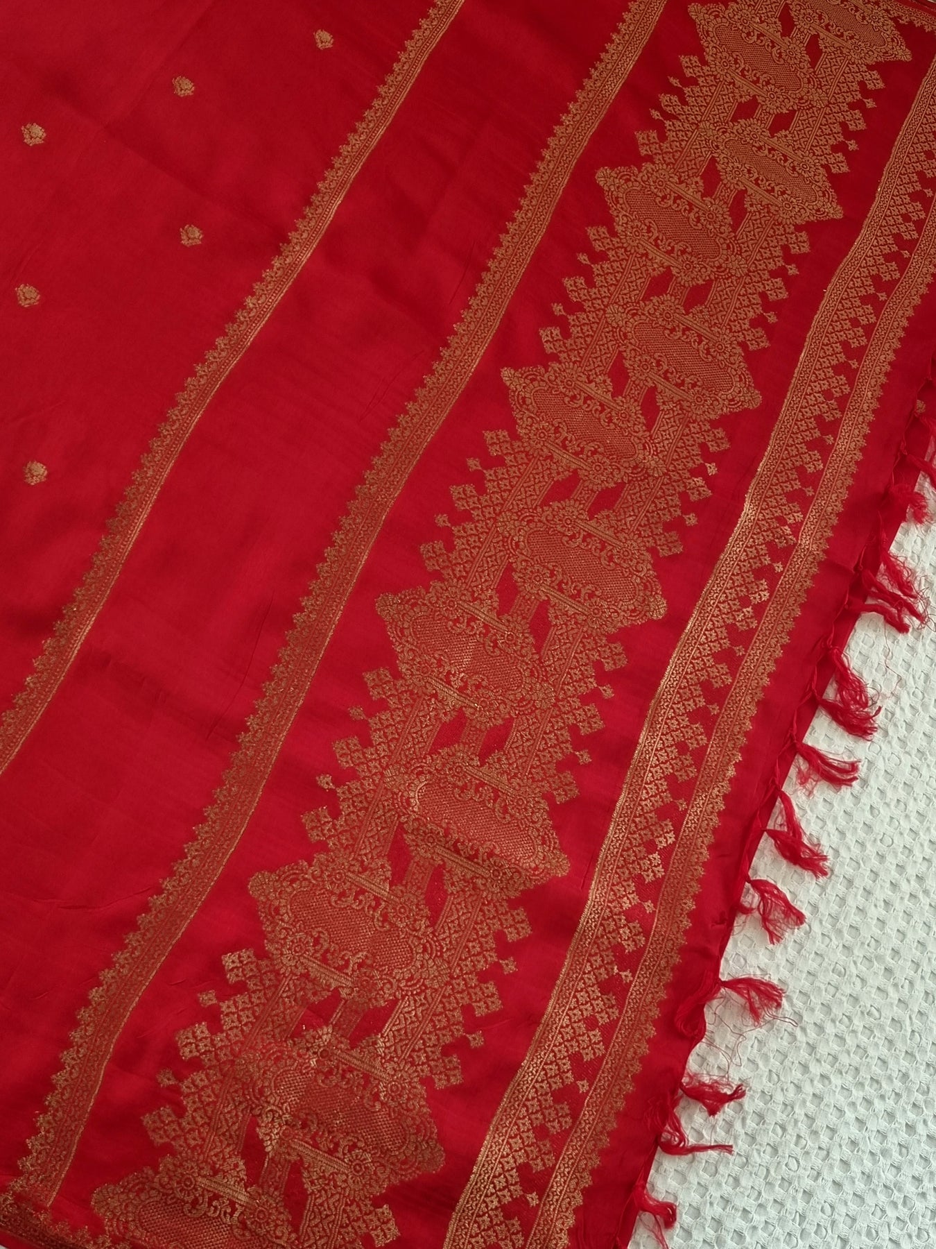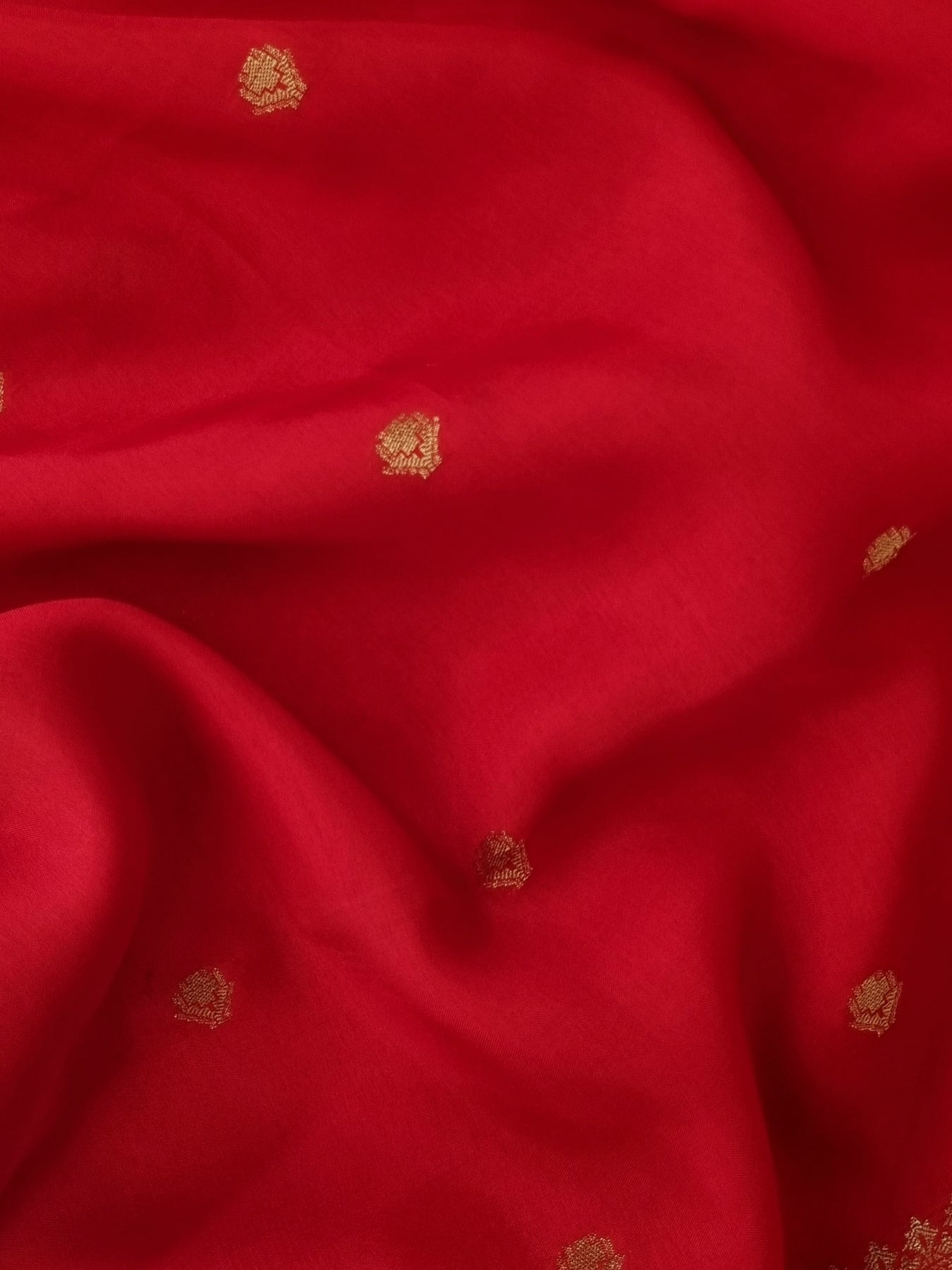 Red Semi Crepe Silk Saree, with woven borders, paired with a running Blouse fabric