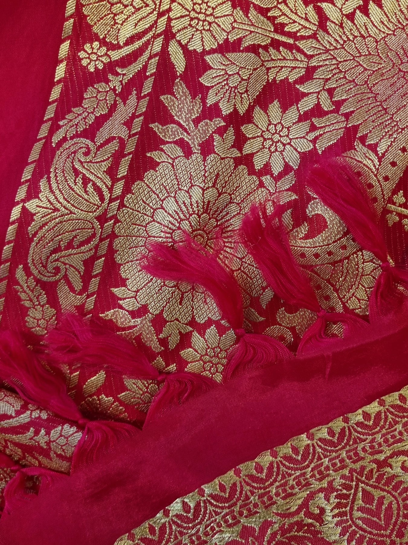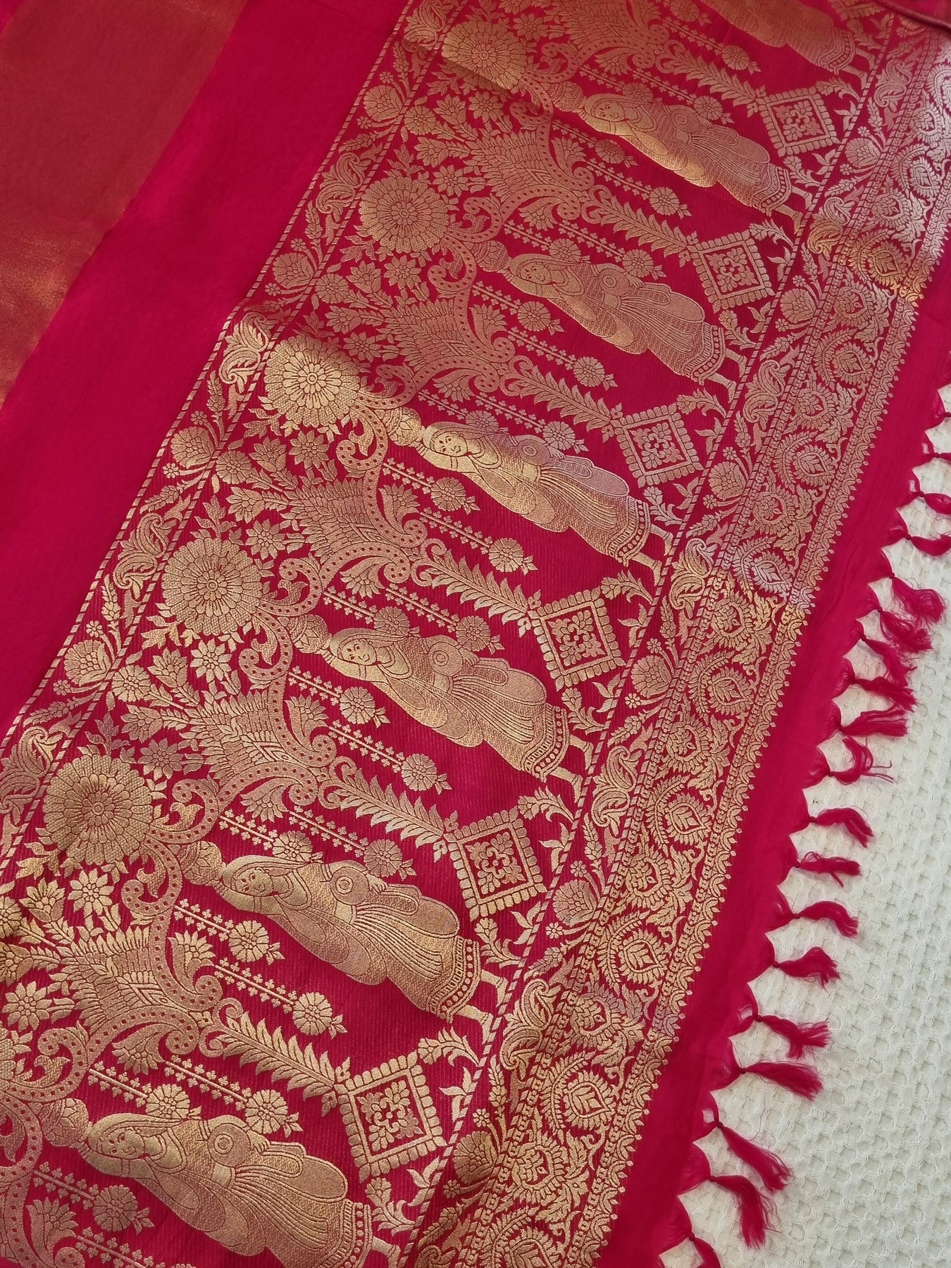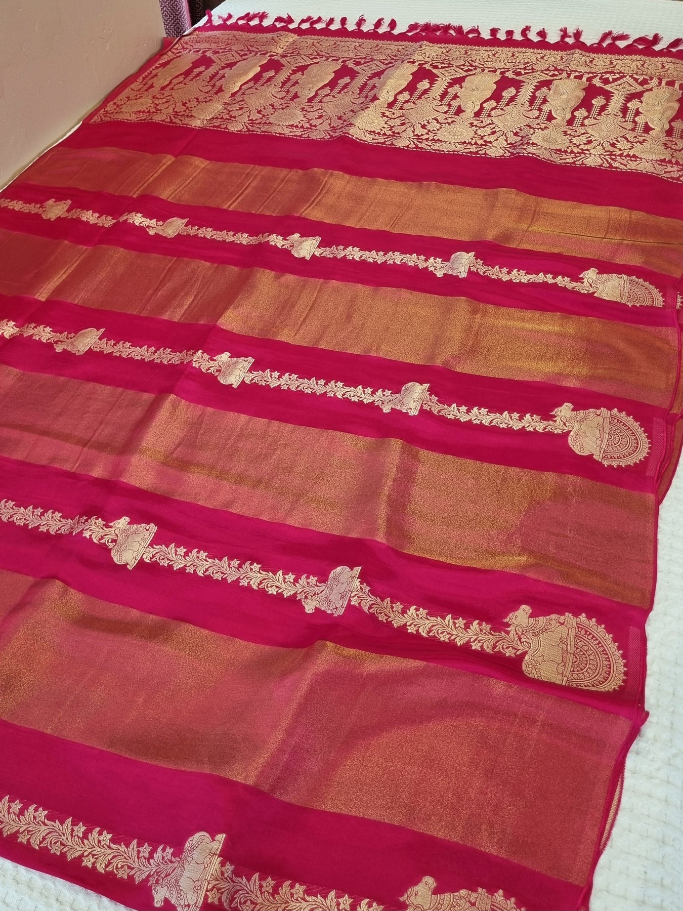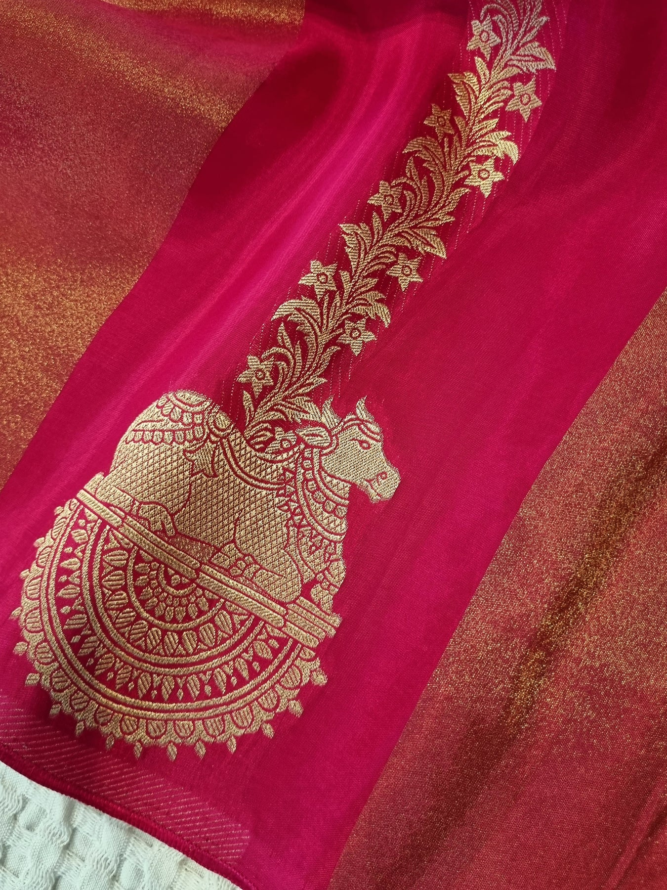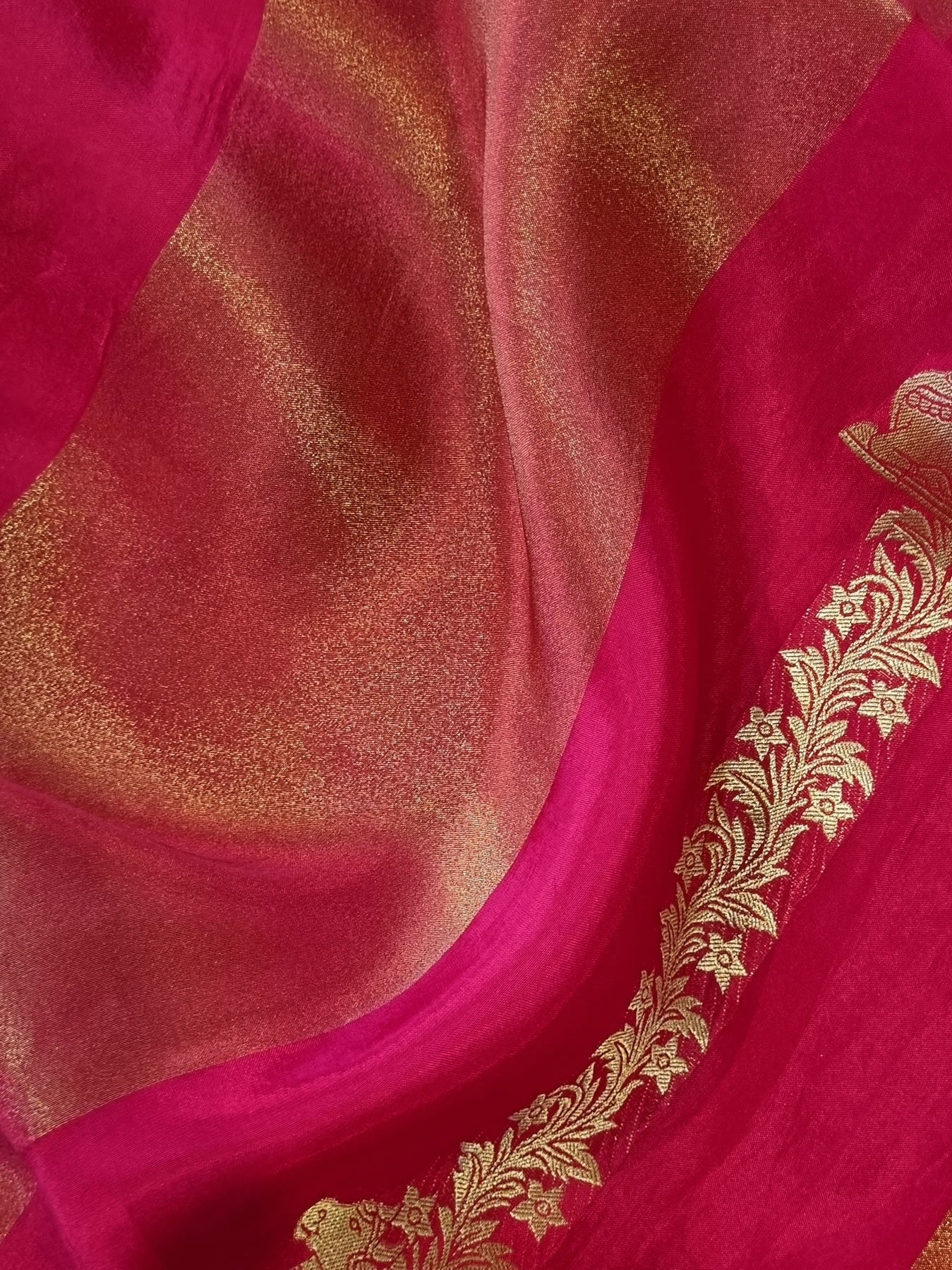 An elegant Pink Tissue Crepe Silk Saree with contrast borders