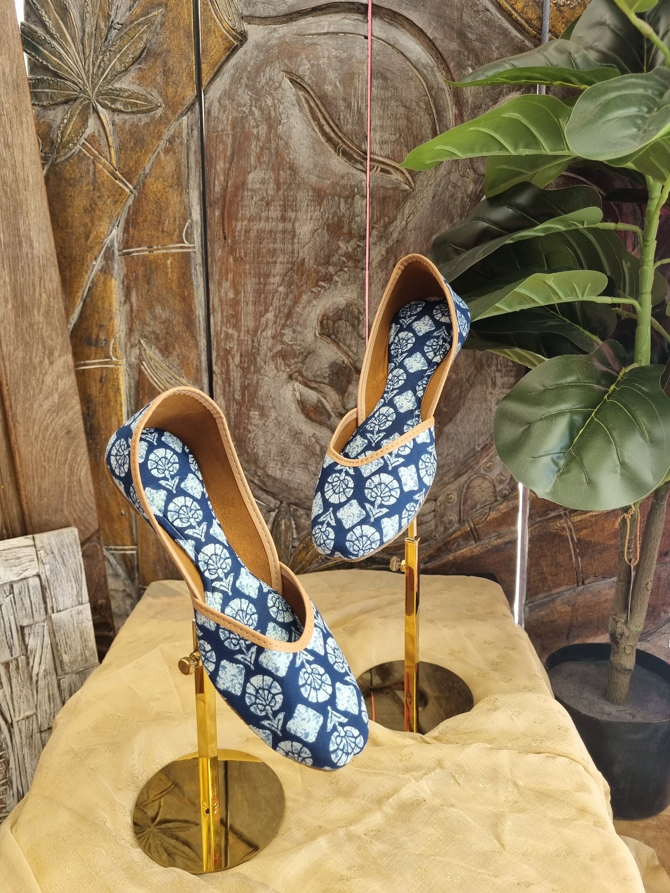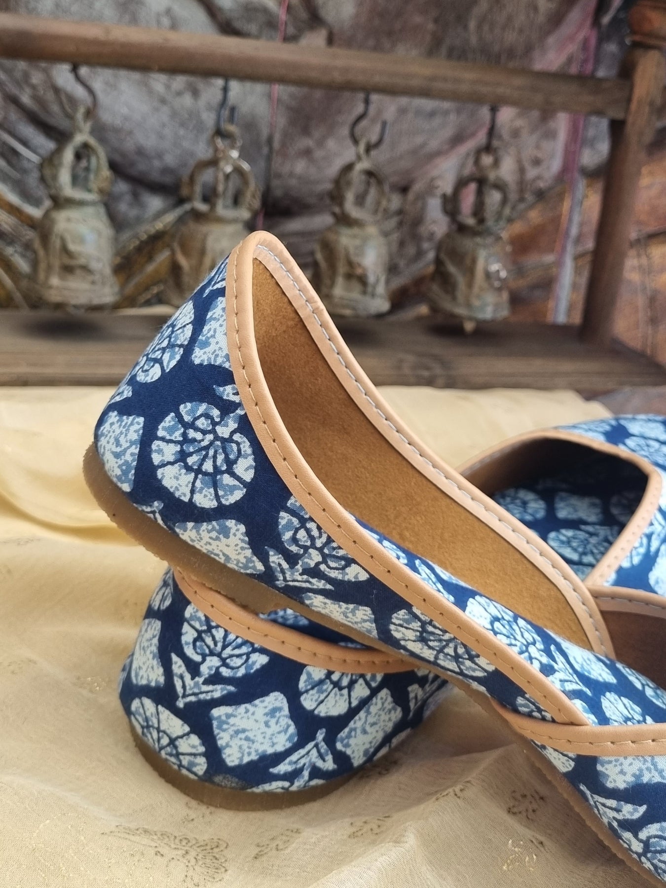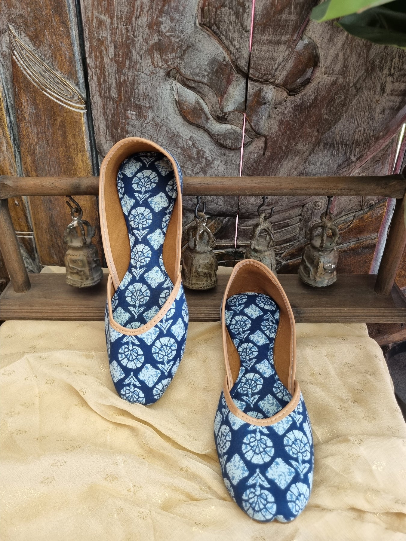 Traditional handcrafted juttis with detailed floral prints with blue and white accents