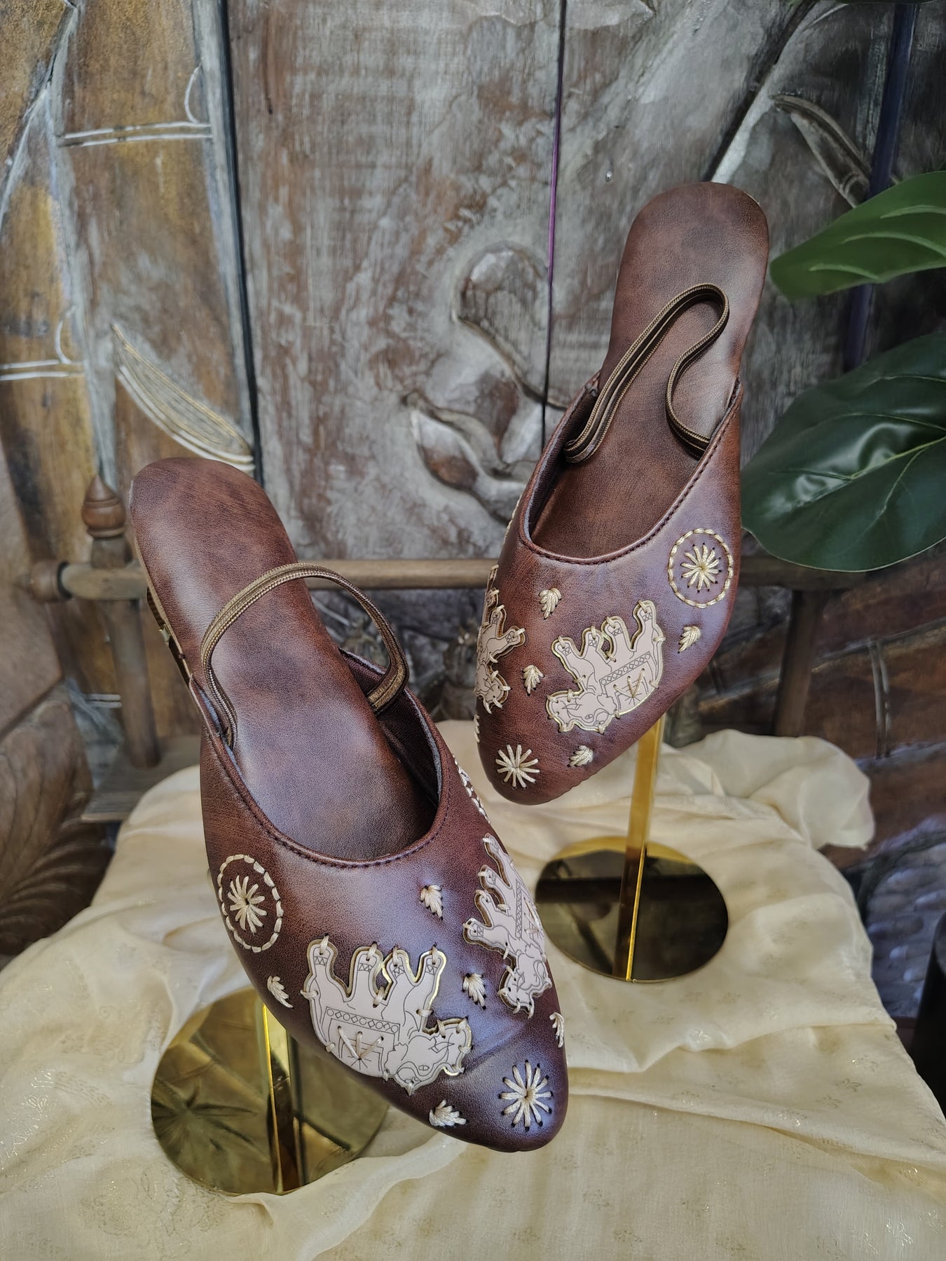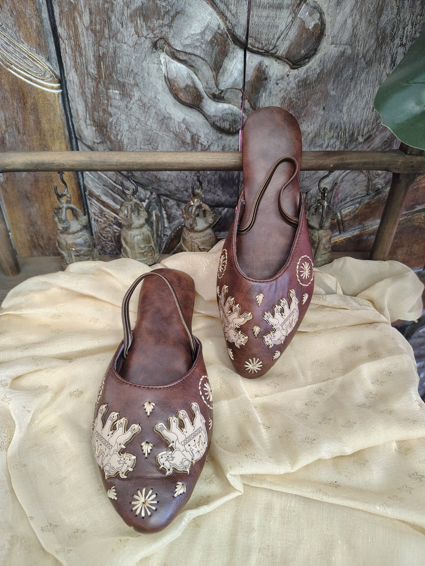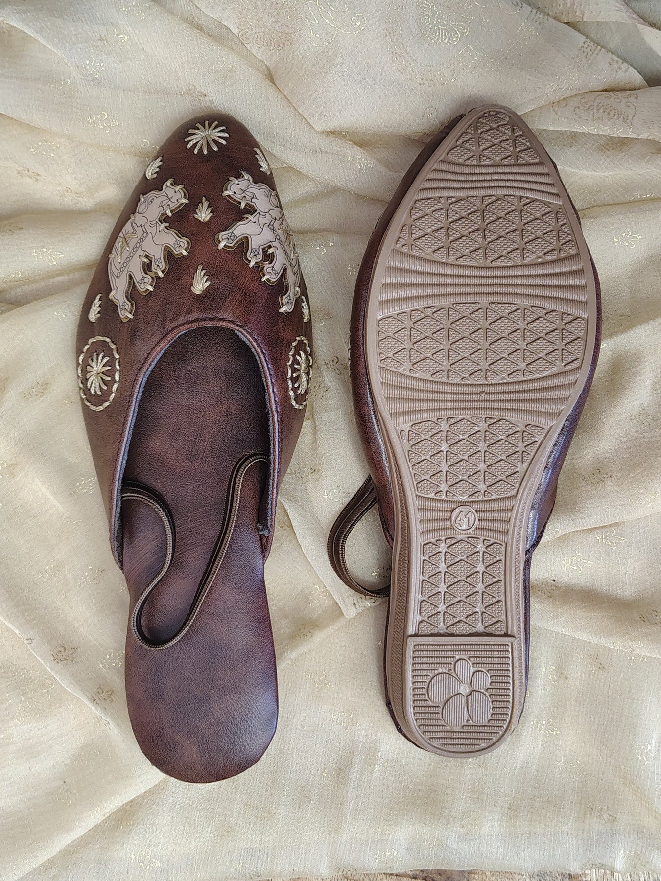 • Traditional handcrafted slip-on Mules / Juttis featuring detailed elephant embroidery on a rich brown base, accented with cream and gold threadwork.