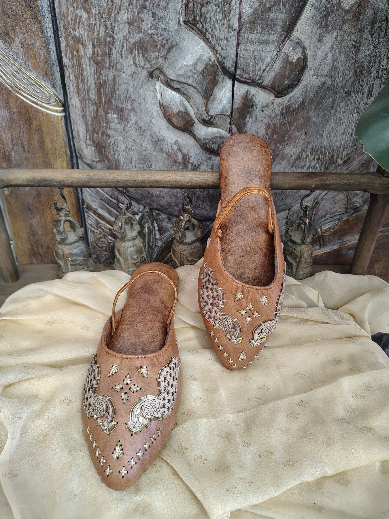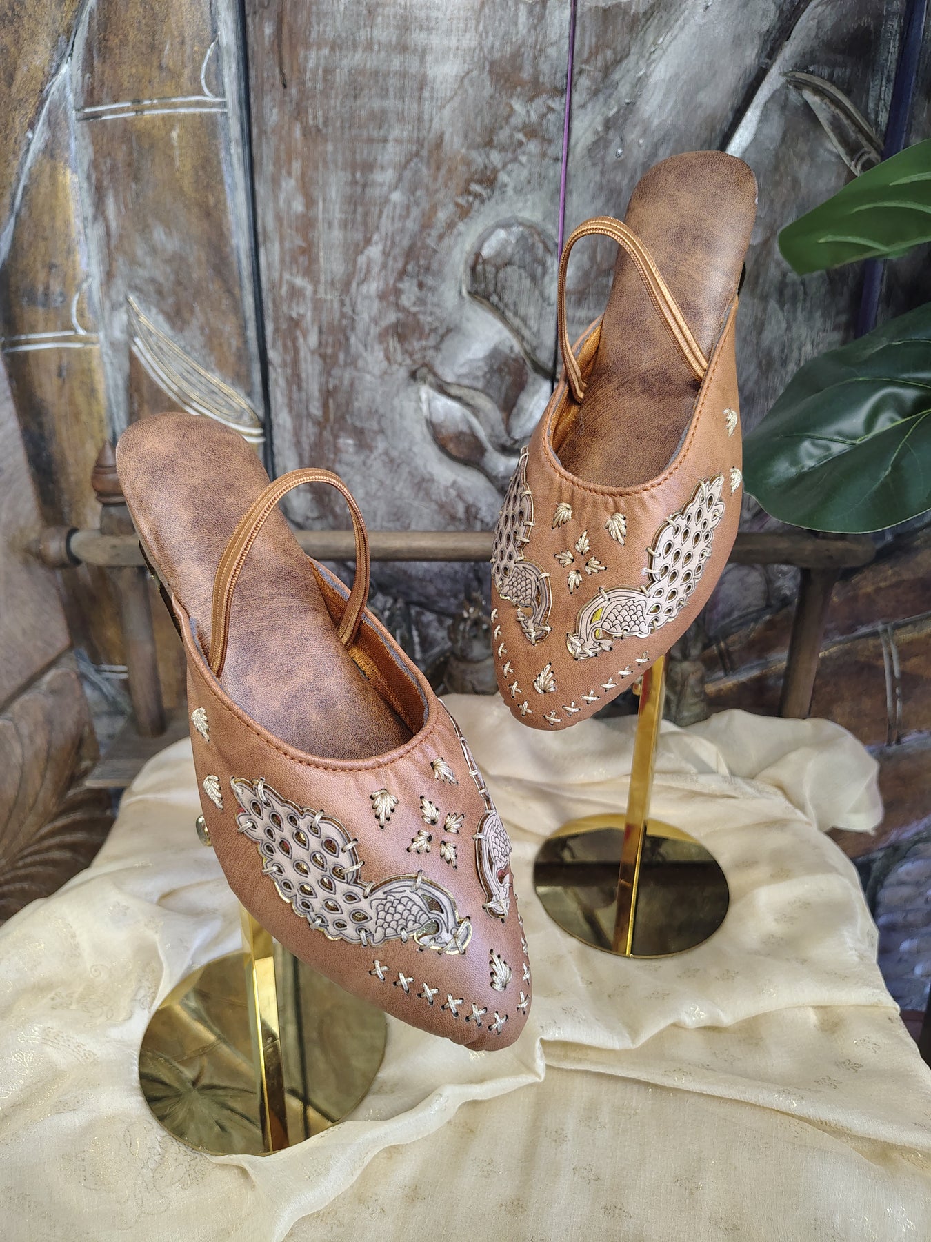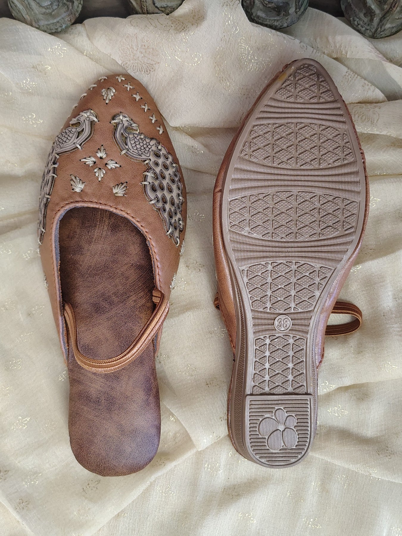 Traditional handcrafted slip-on Mules / Juttis featuring detailed peacock embroidery on a rich brown base, accented with cream and gold threadwork.
