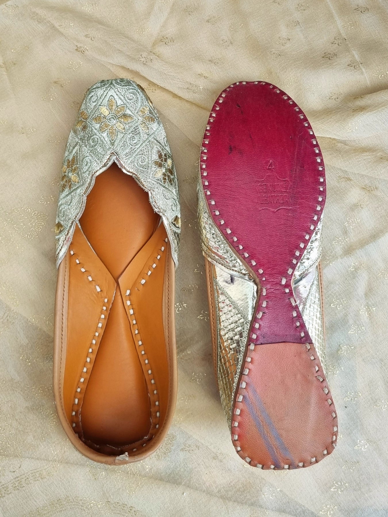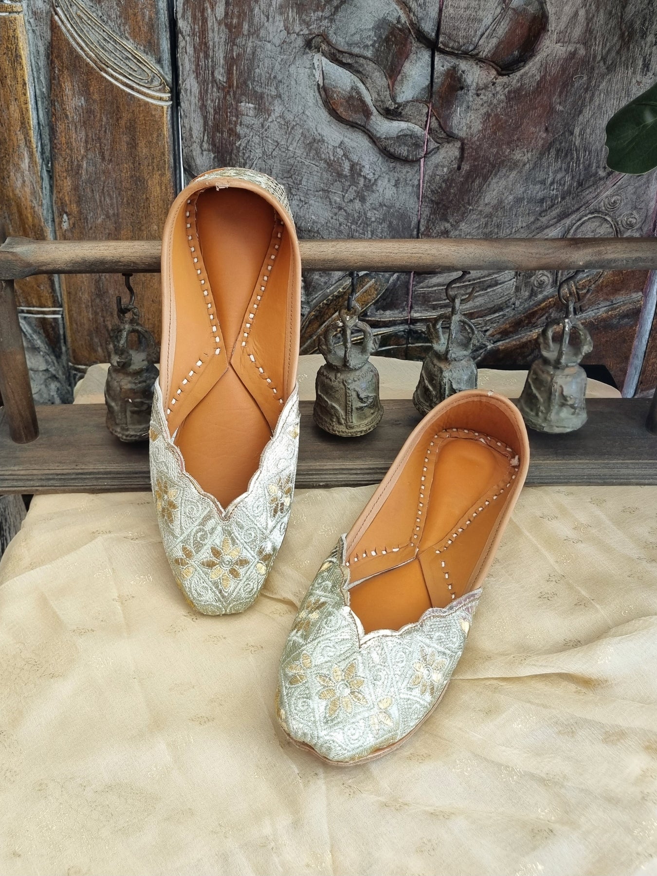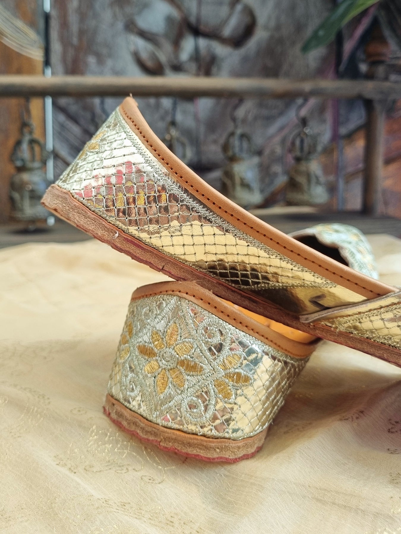 Traditional handcrafted juttis with detailed zari and floral embroidery with a warm neutral base with gold threadwork
