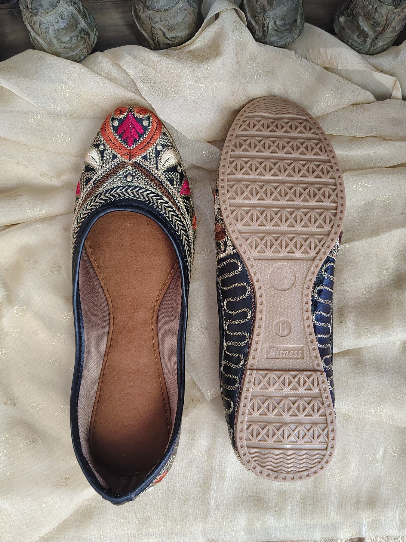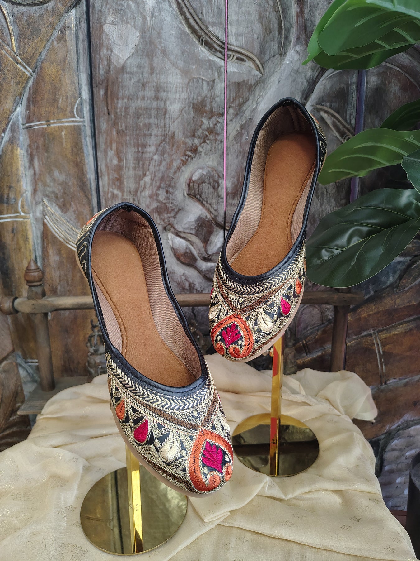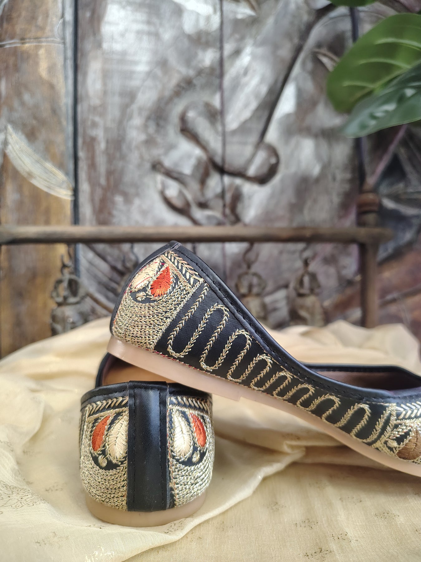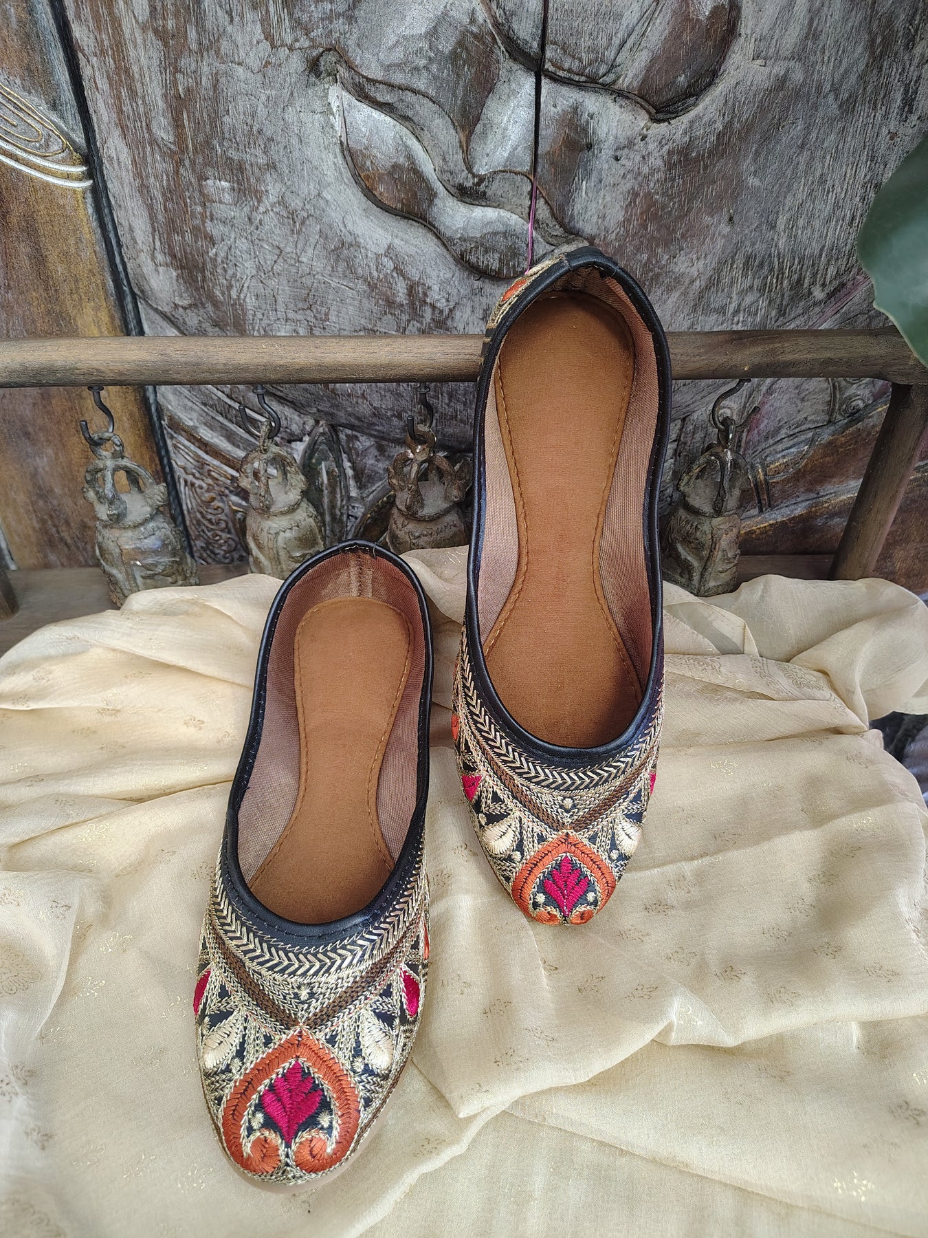 Traditional handcrafted juttis with detailed zari and floral embroidery with a warm neutral base with gold threadwork and red, orange and gold accents