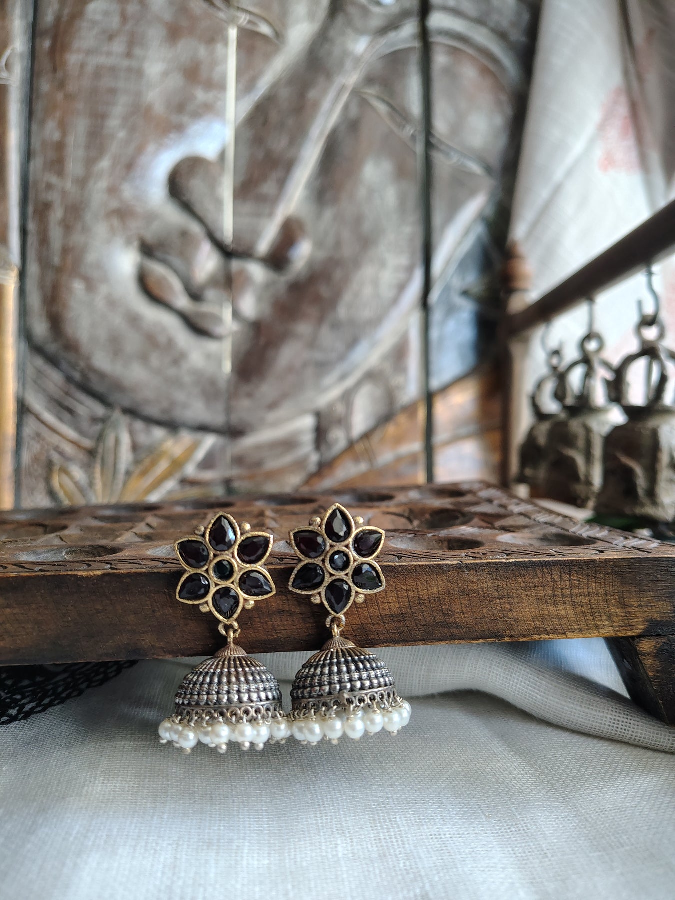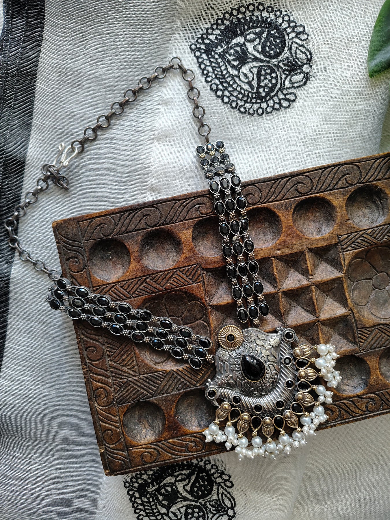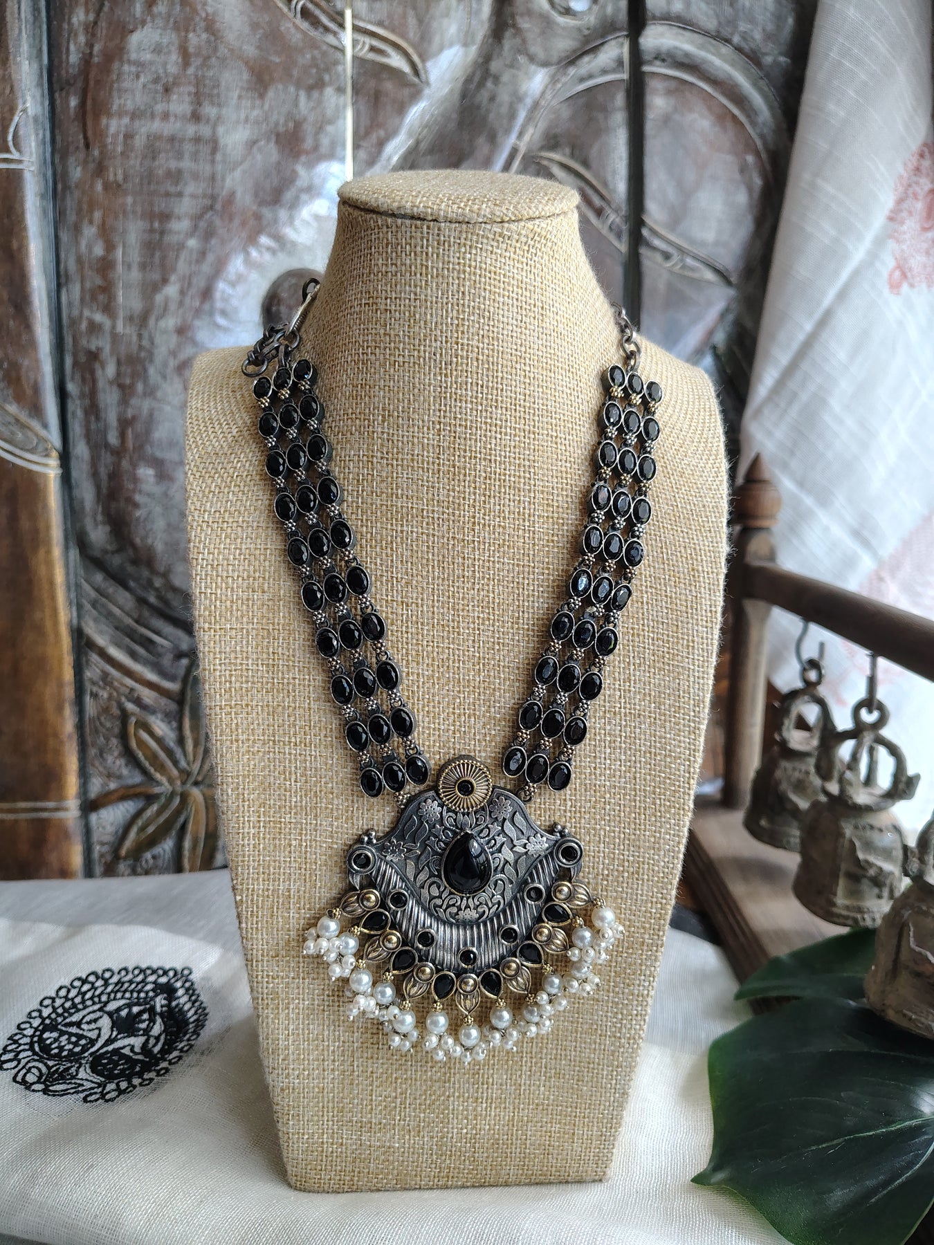 Dual Toned German Silver Necklace with Black stones, paired with matching Jhumkas