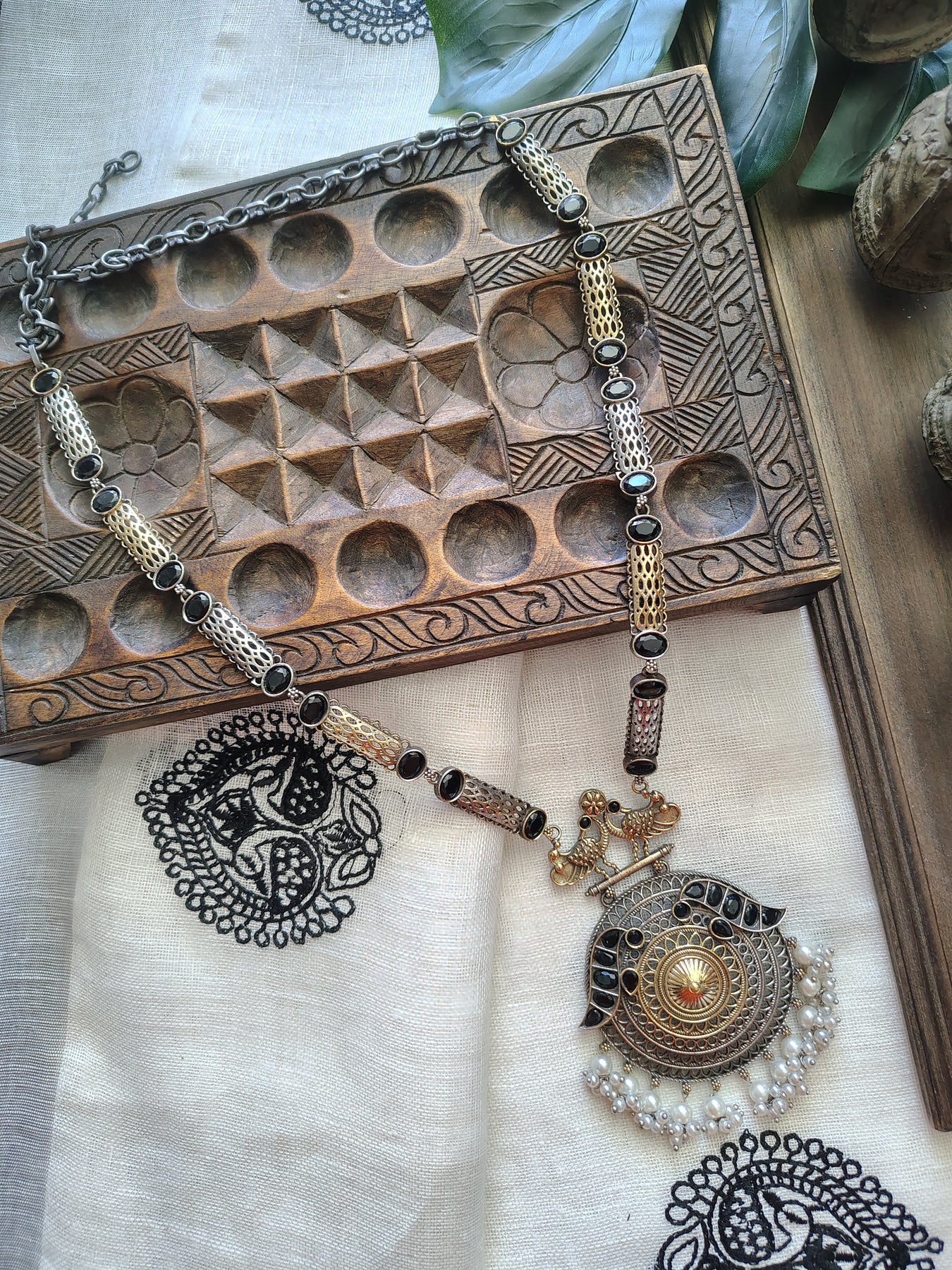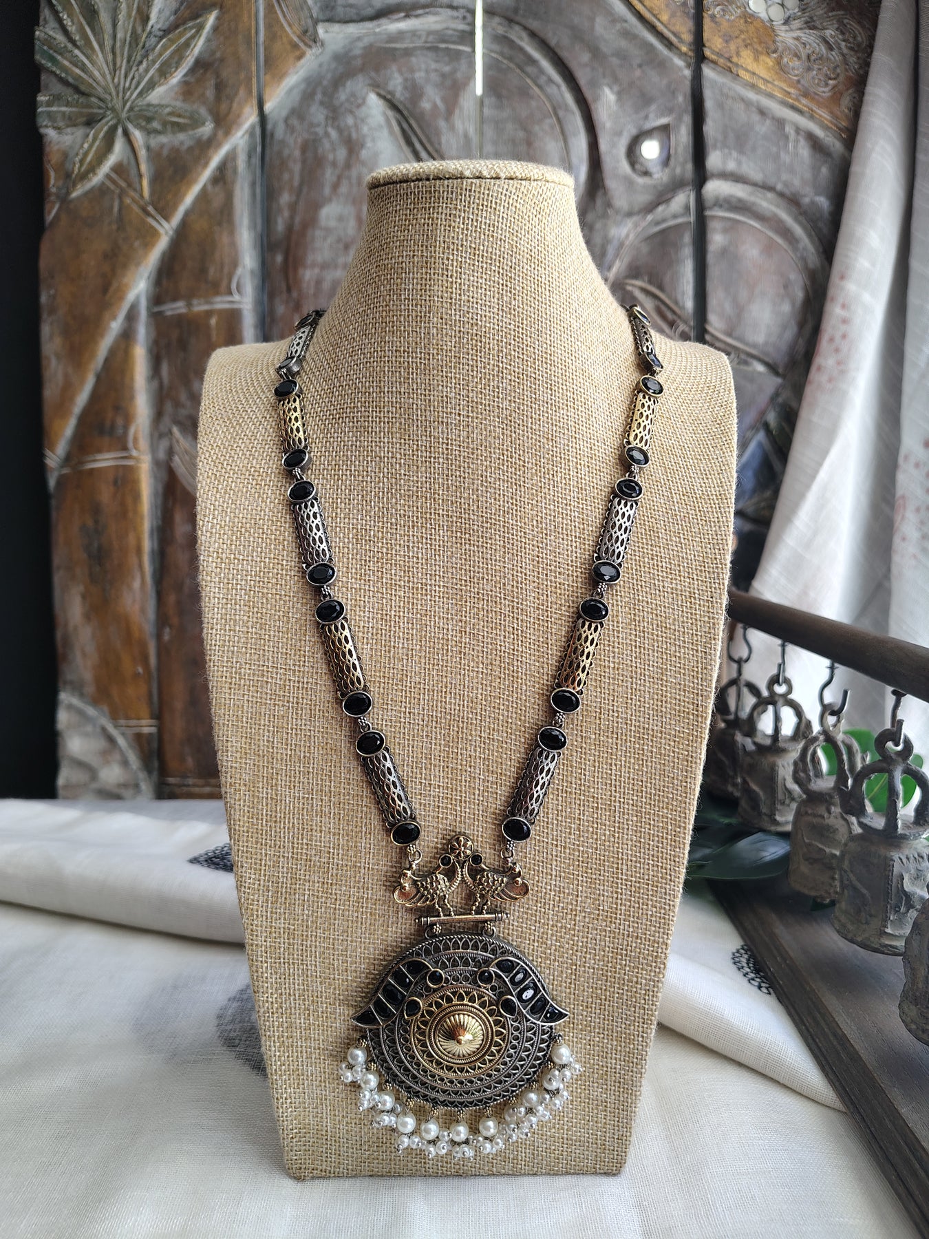 Dual Tone German Silver necklace with Black Stones paired with matching Earrings