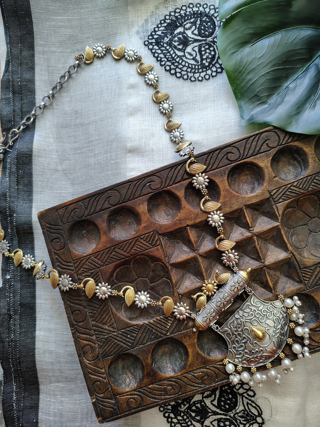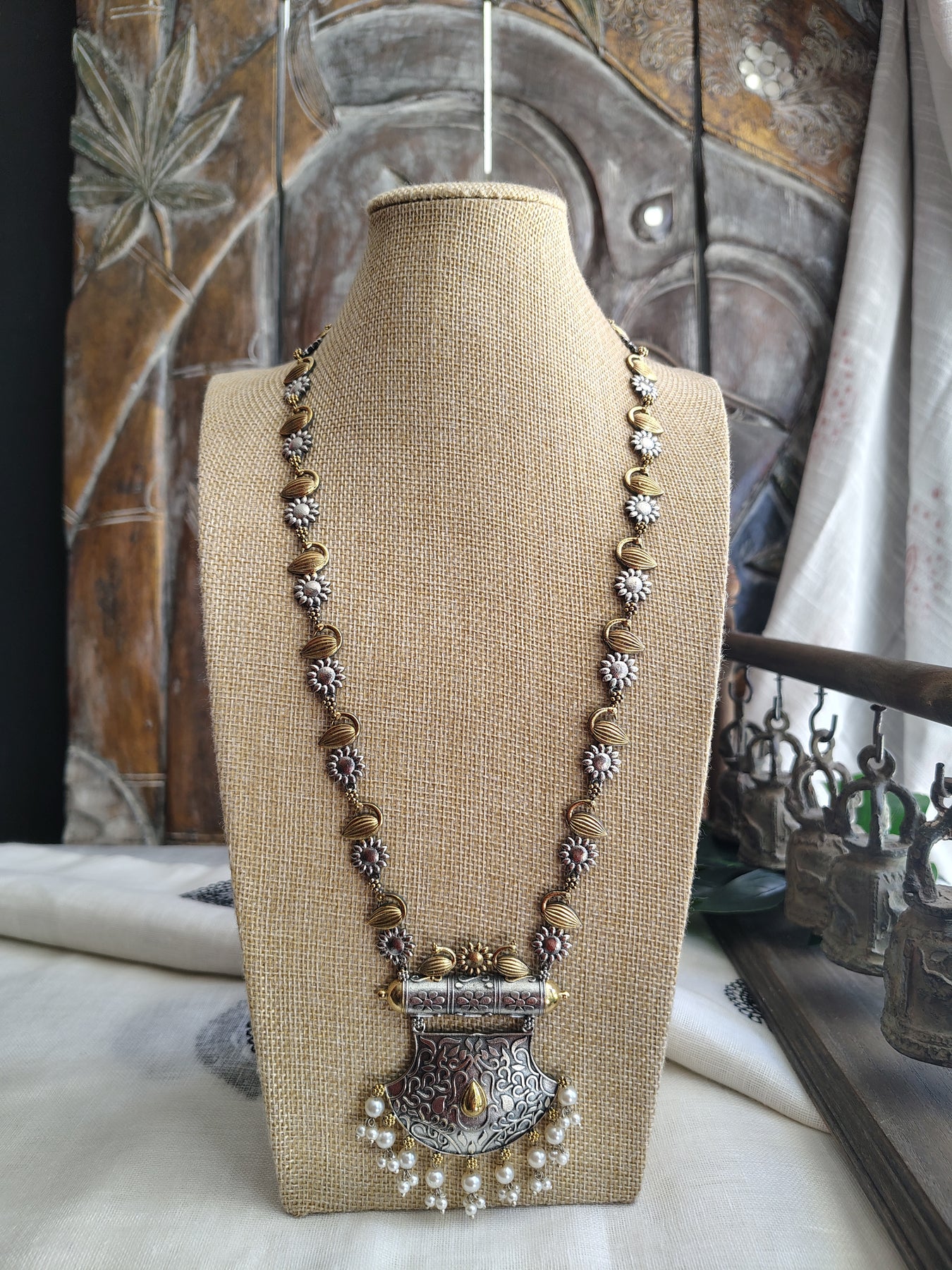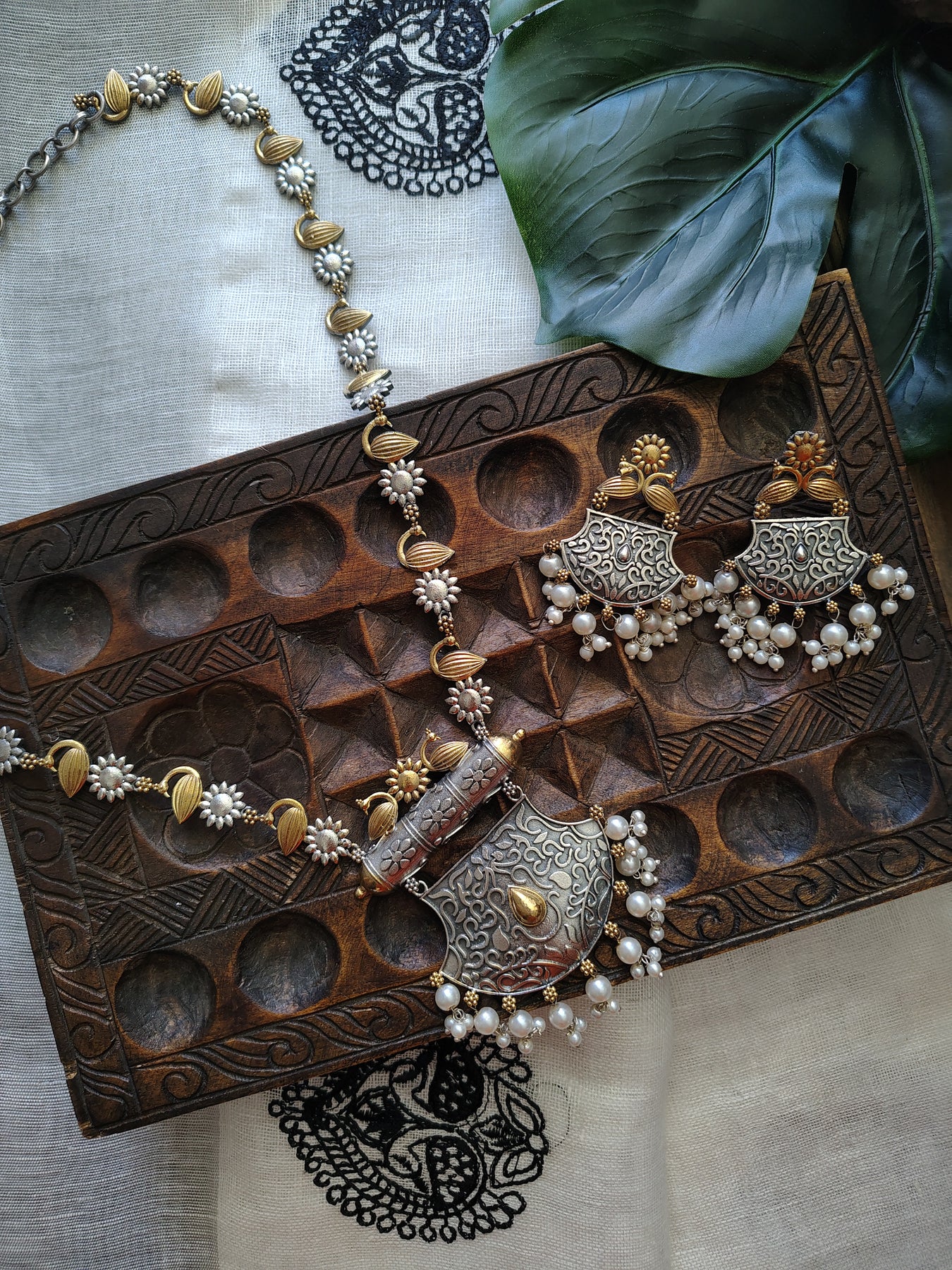 [{"id":47694763131112,"title":"Default Title","option1":"Default Title","option2":null,"option3":null,"sku":null,"requires_shipping":true,"taxable":true,"featured_image":null,"available":false,"name":"Dual Tone German Silver Necklace with Earrings","public_title":null,"options":["Default Title"],"price":11900,"weight":300,"compare_at_price":null,"inventory_quantity":0,"inventory_management":"shopify","inventory_policy":"deny","barcode":null,"requires_selling_plan":false,"selling_plan_allocations":[]}]