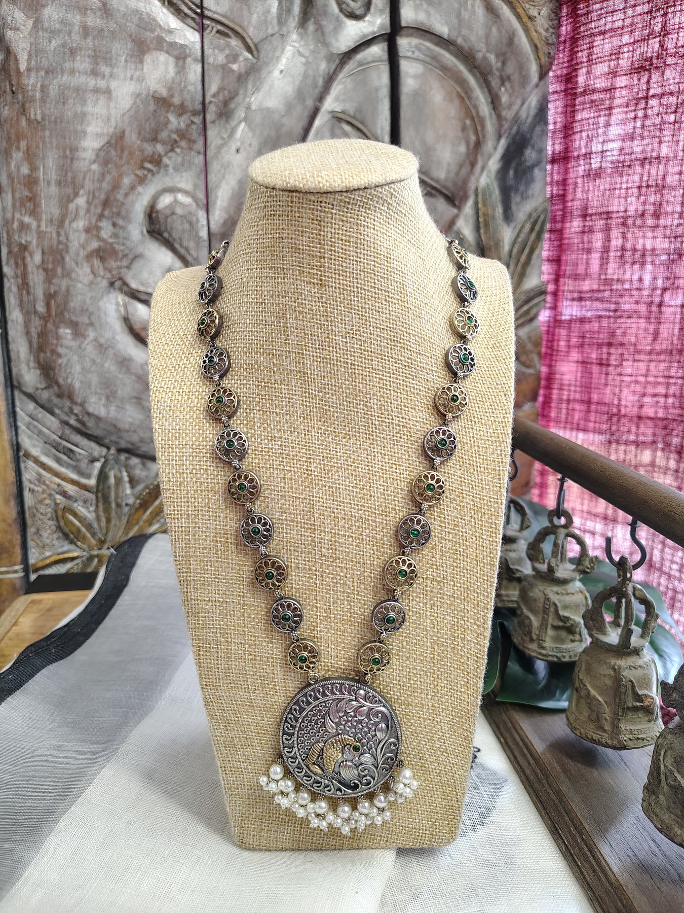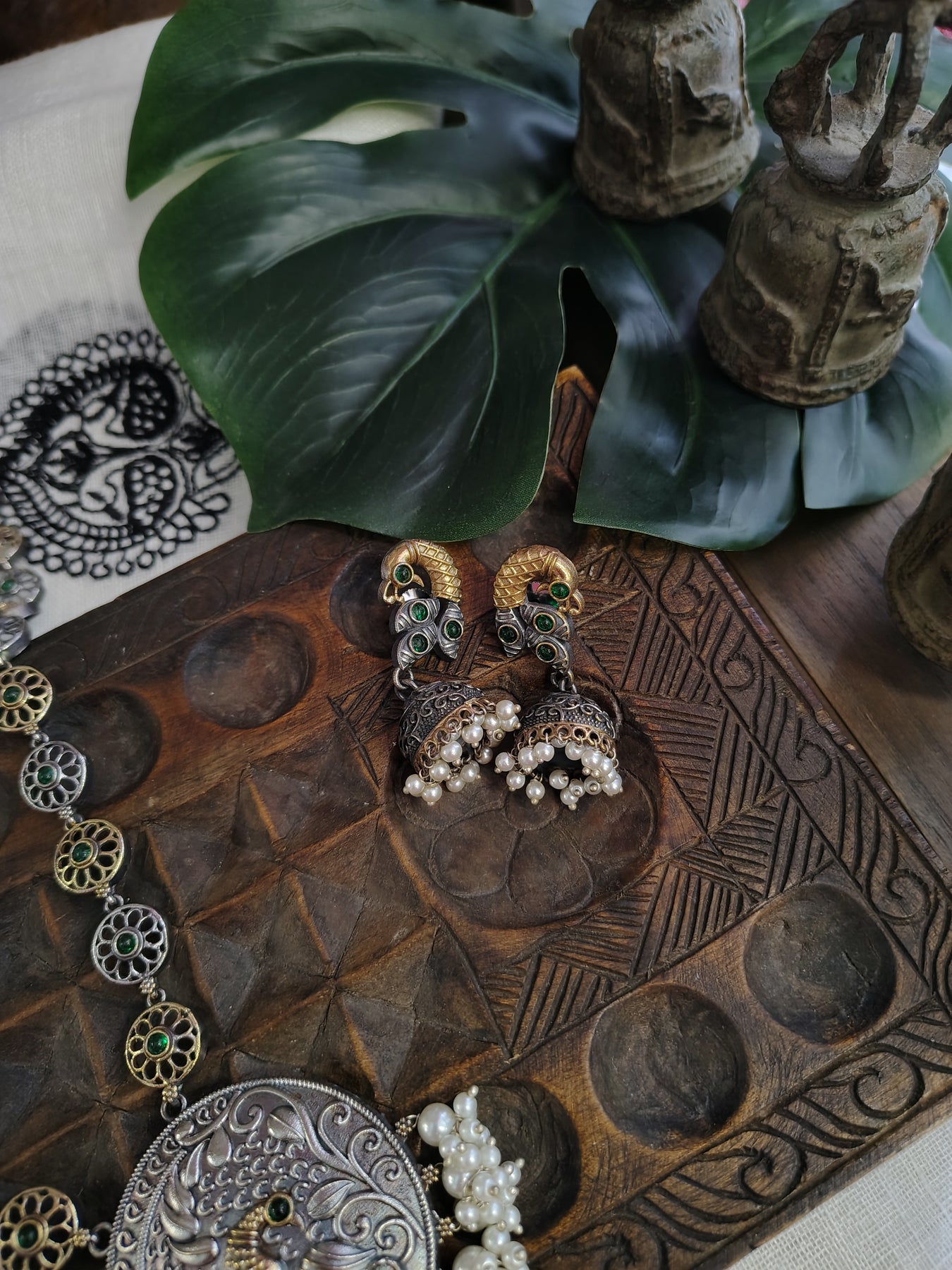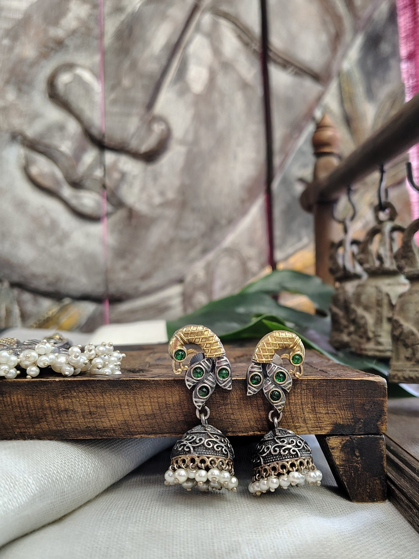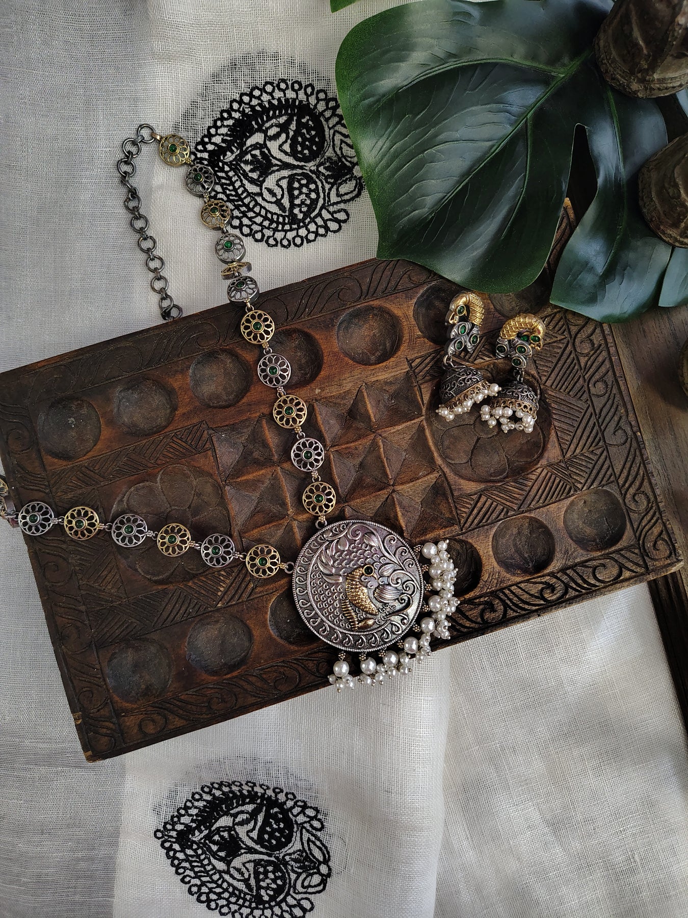 Dual Tone German Silver necklace with Green Stones paired with matching Jhumkas