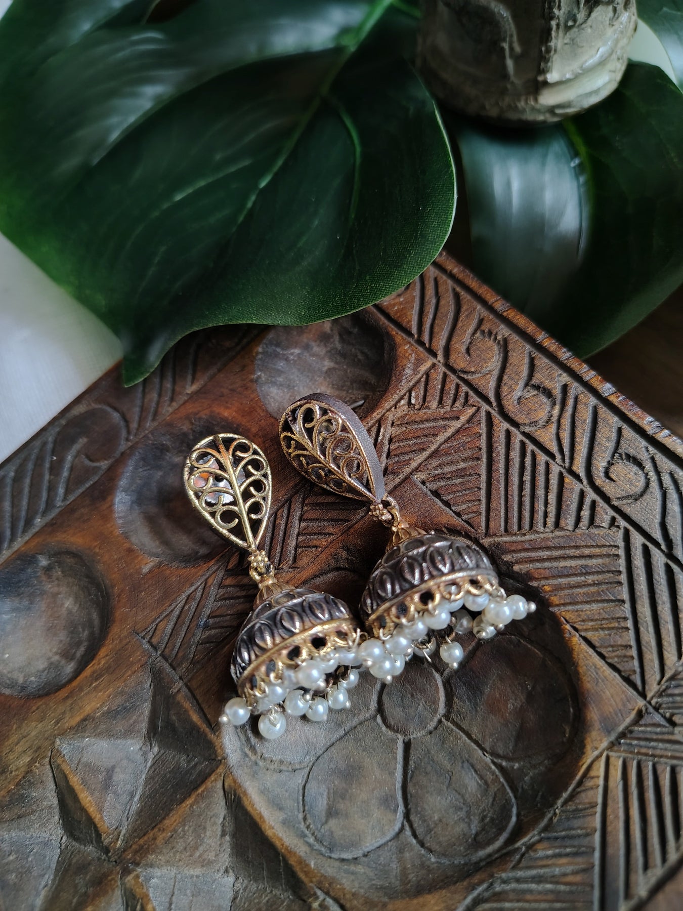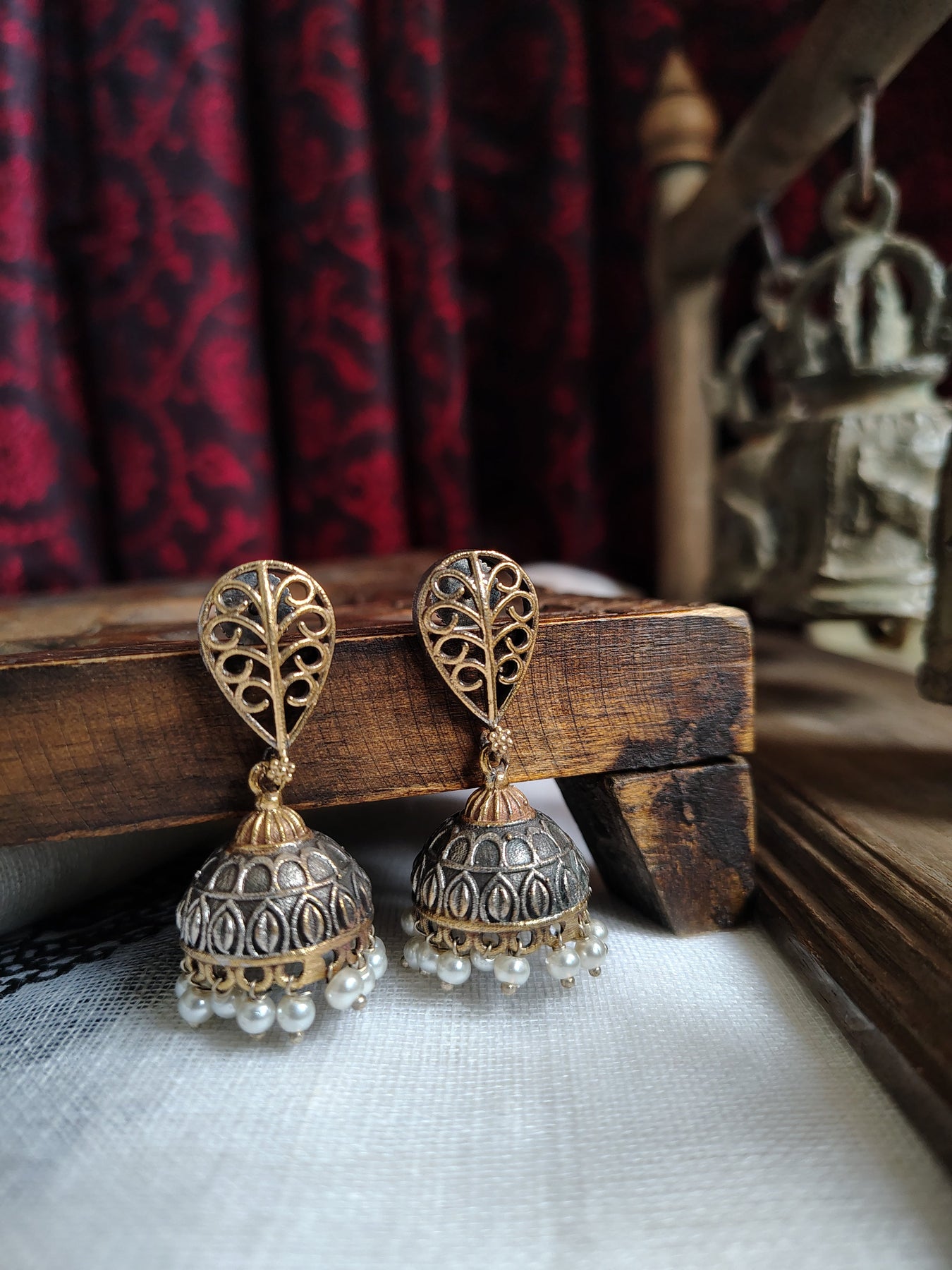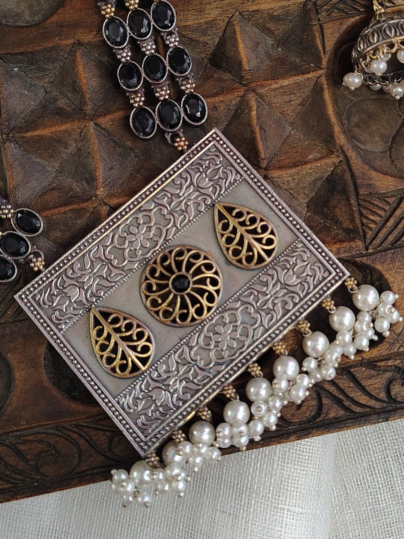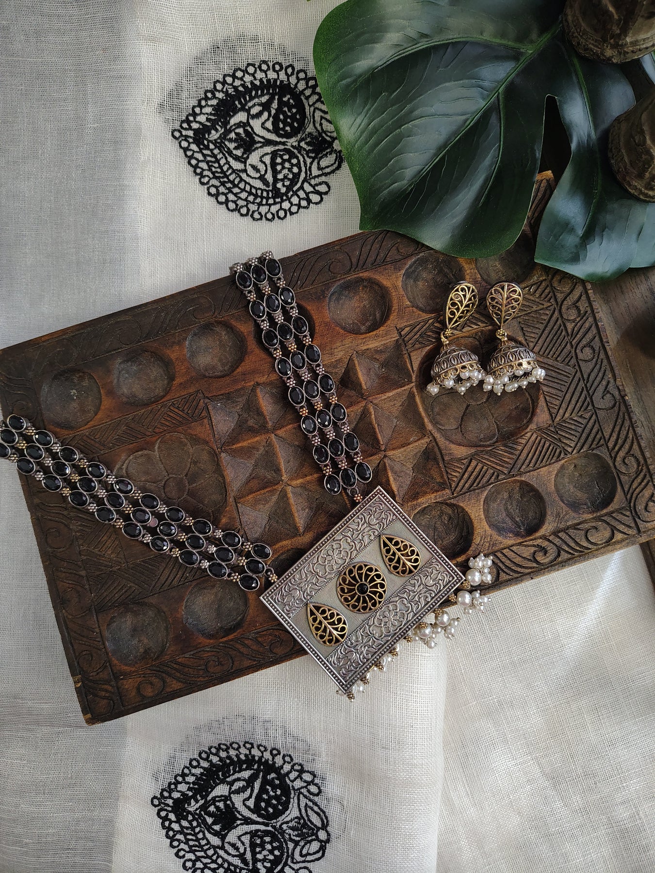 Dual Tone German Silver Statement Necklace ornated with Blue Stones, paired with Jhumkas