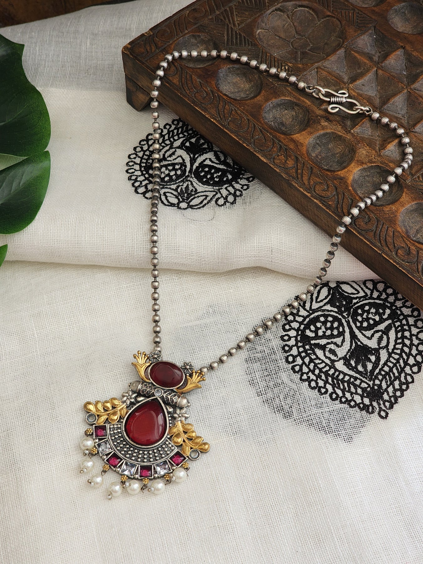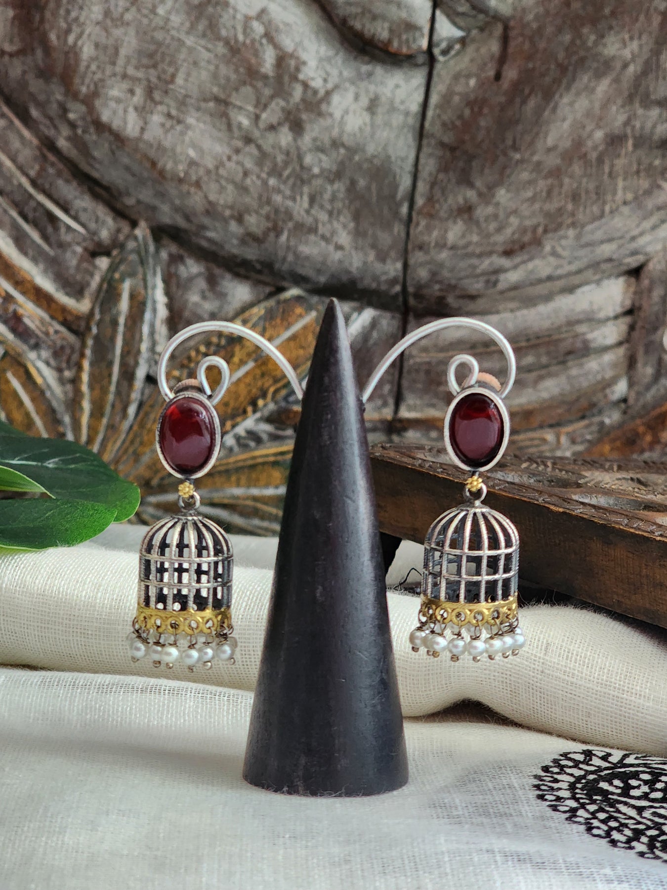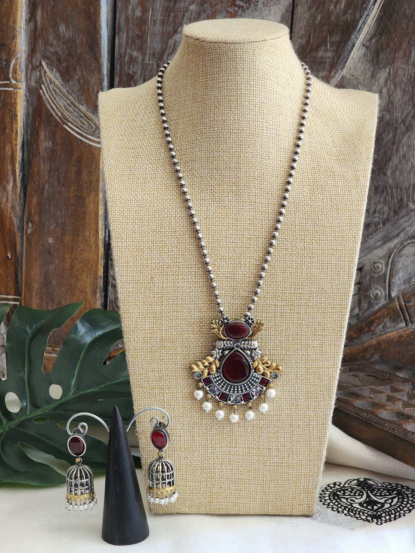 Dual Tone German Silver necklace with Red stones and pearls, paired with matching Jhumkas