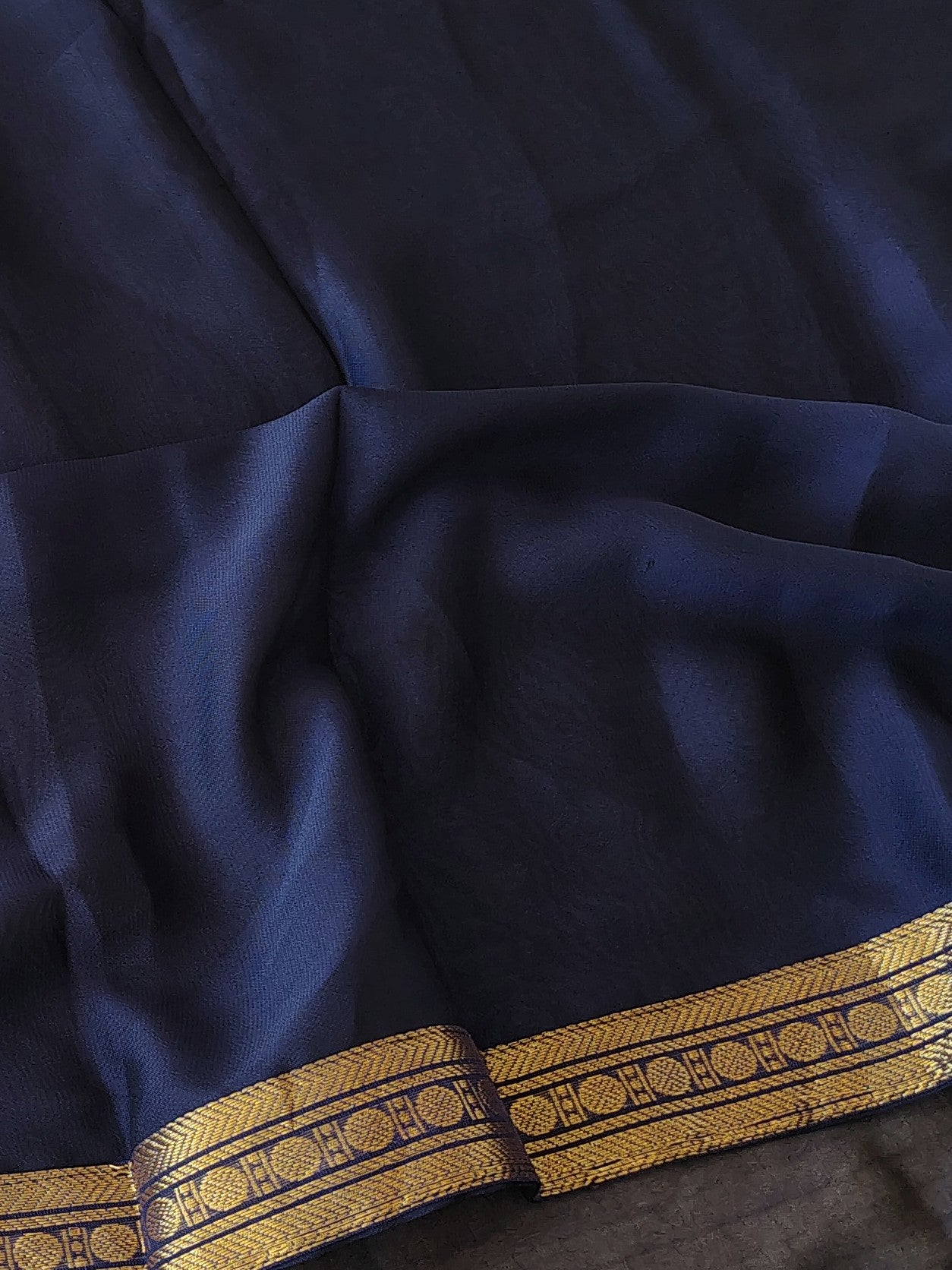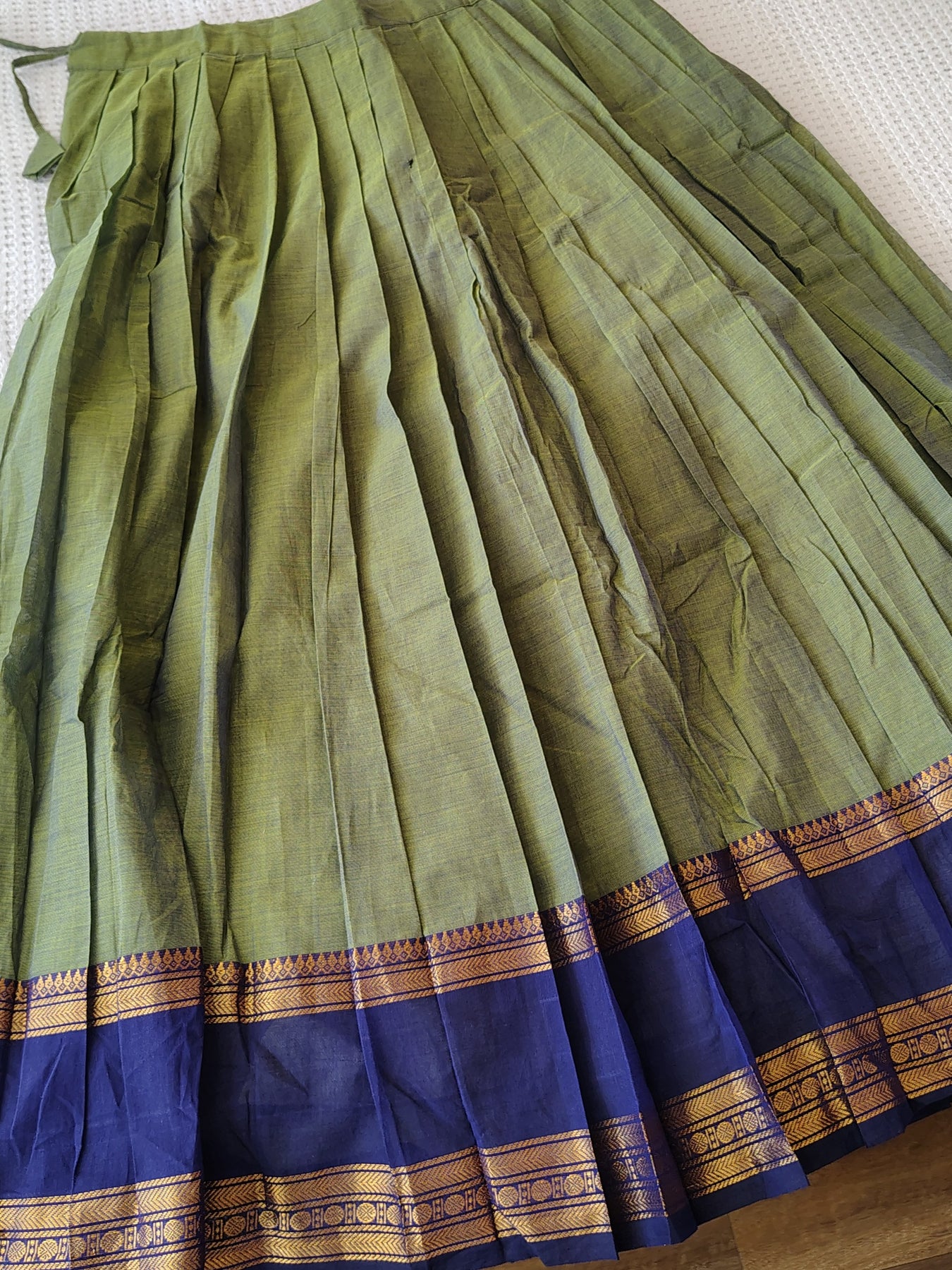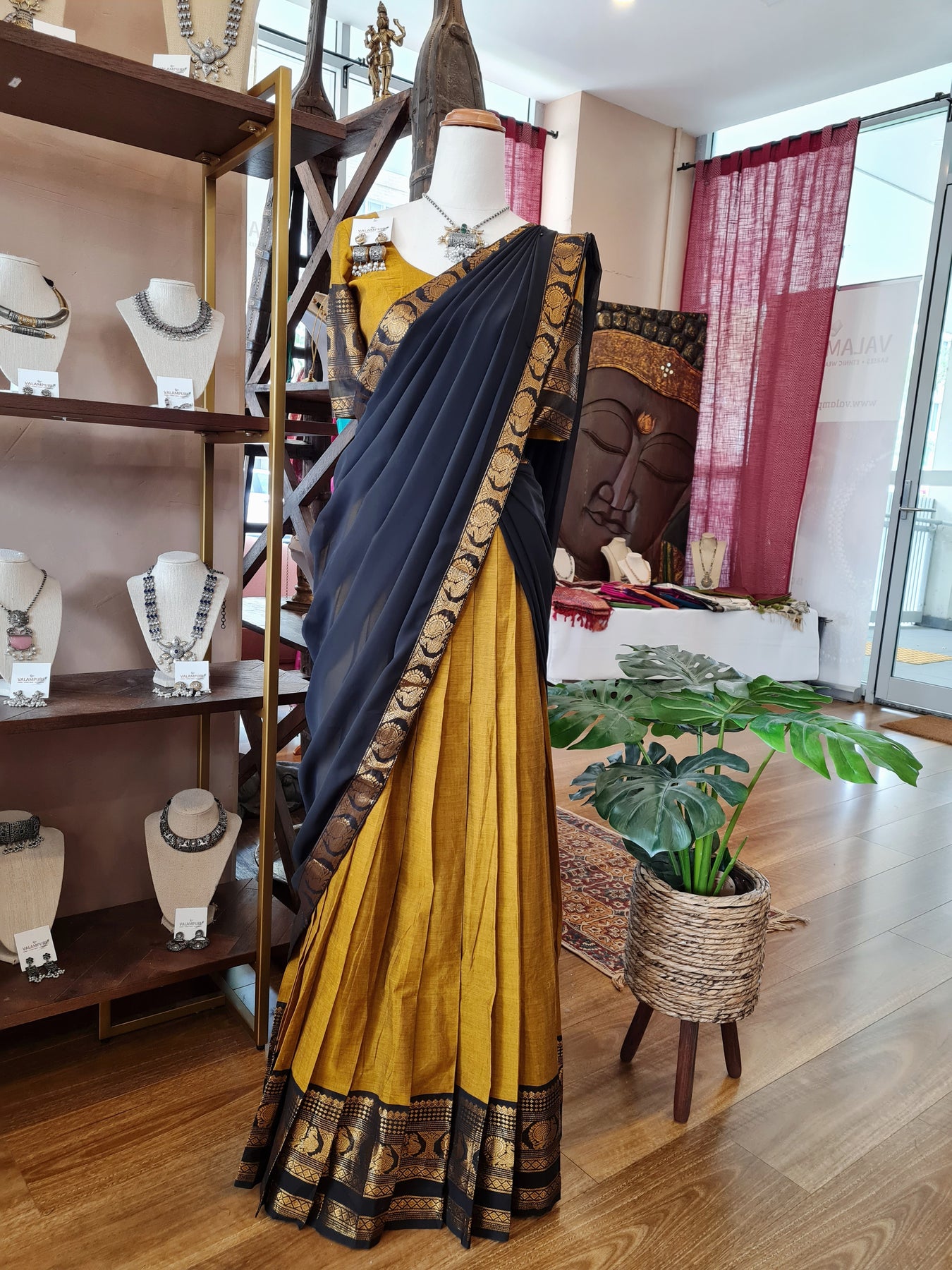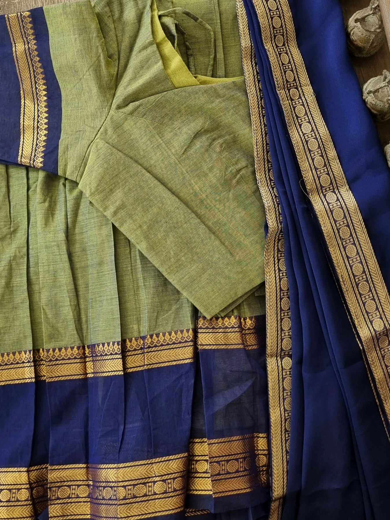 An elegant blouse with a round neck design with an enticing skirt with tall gold zari borders. The soft and light contrast Dupatta enhances the look.