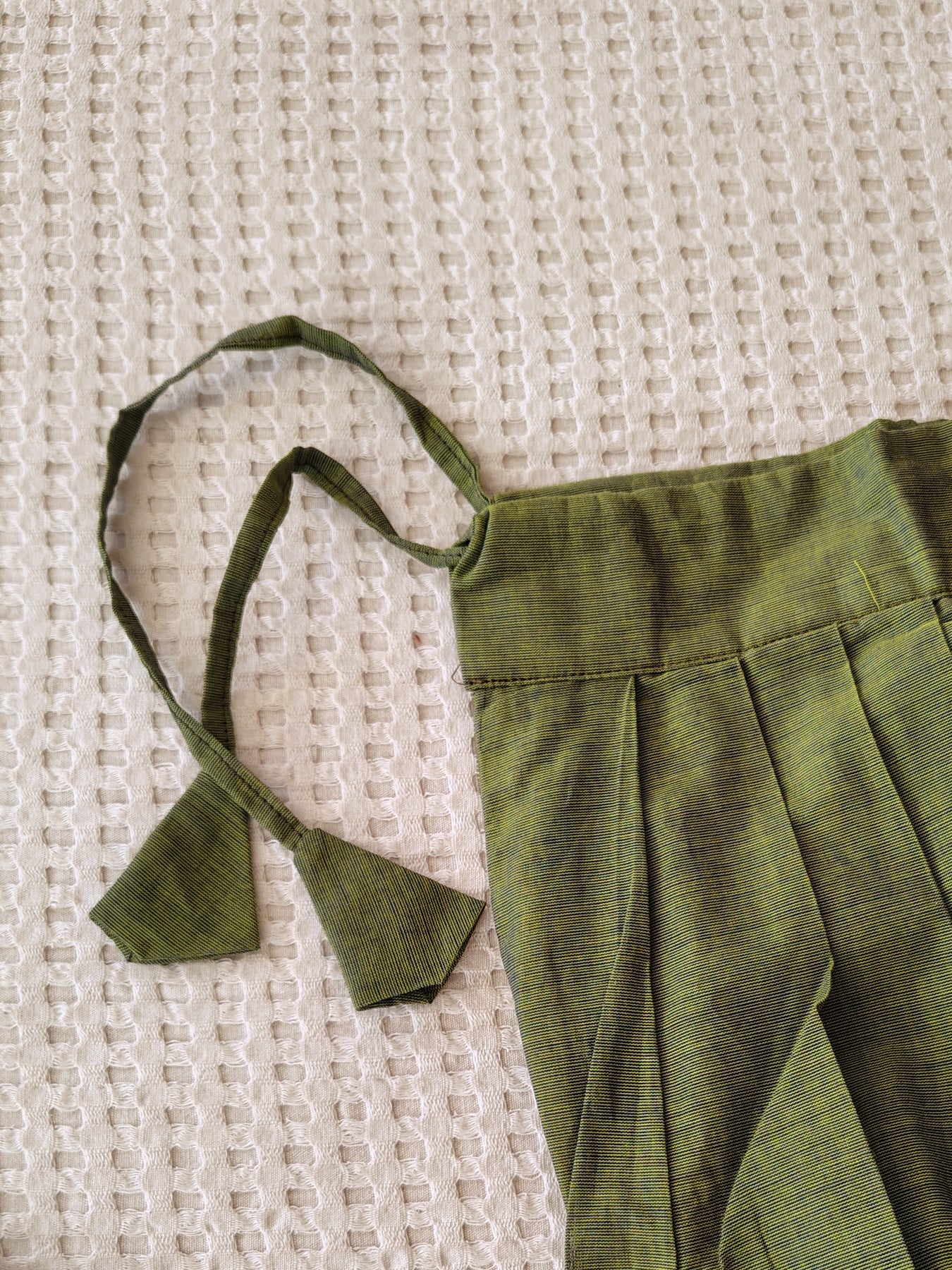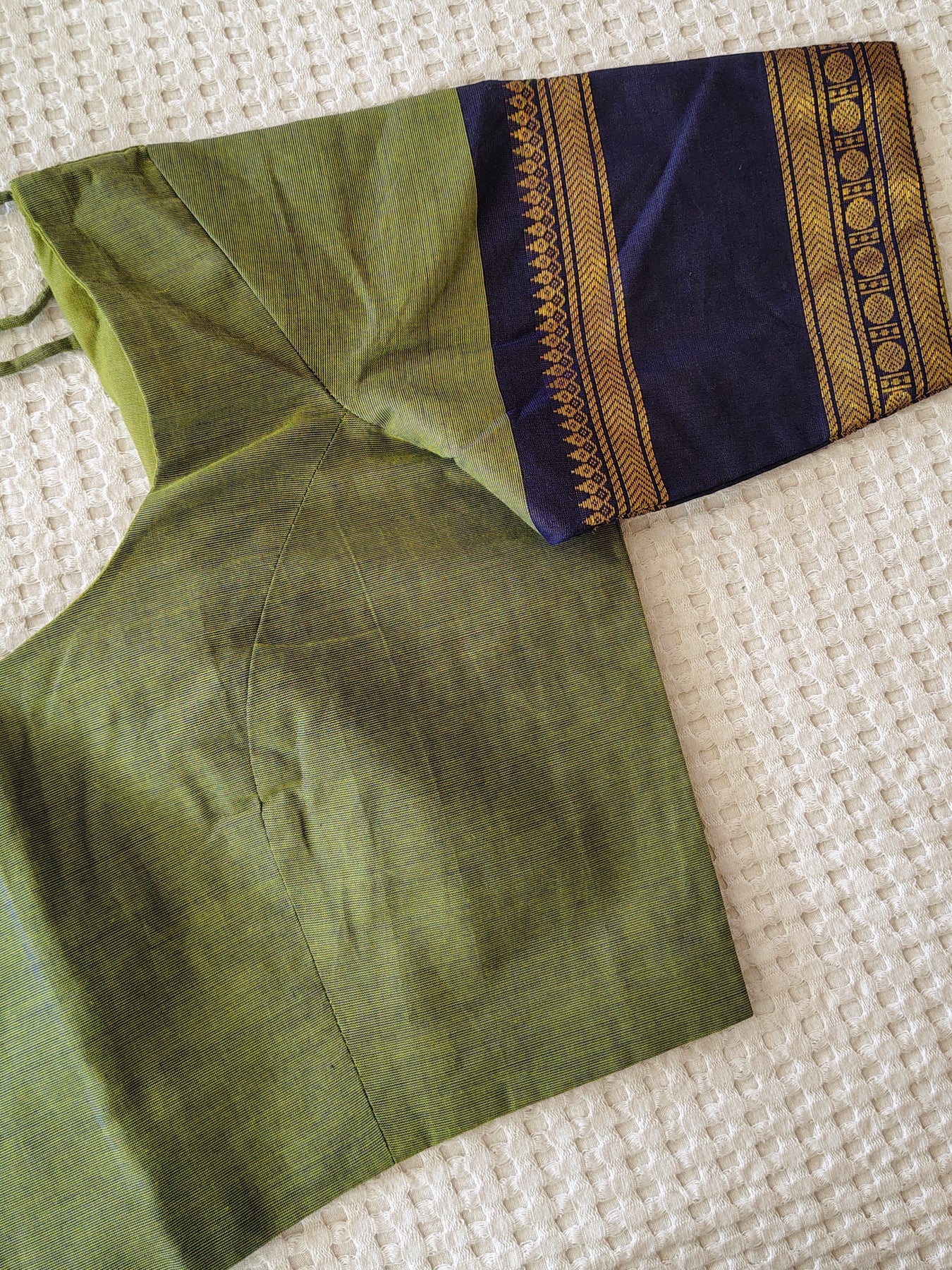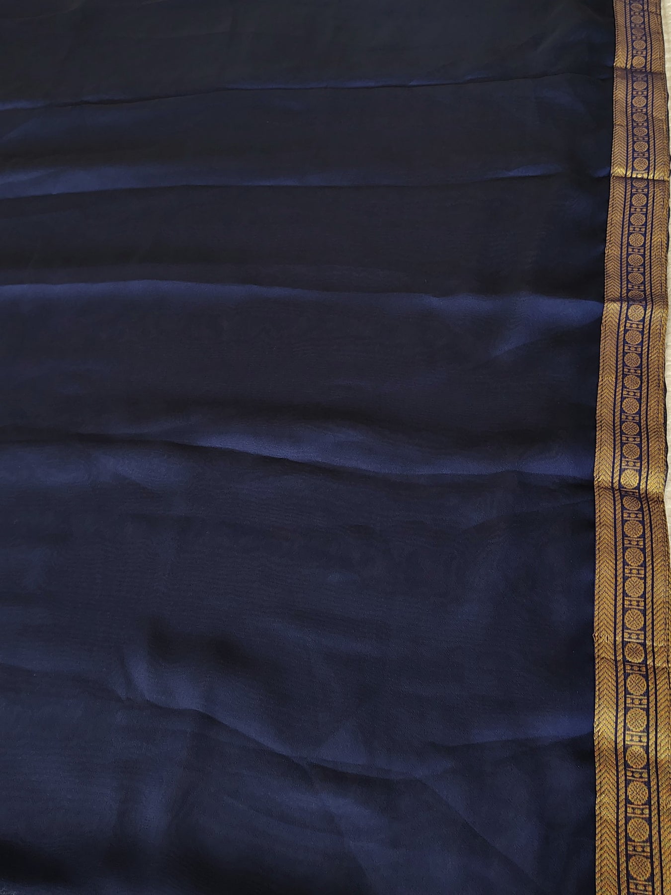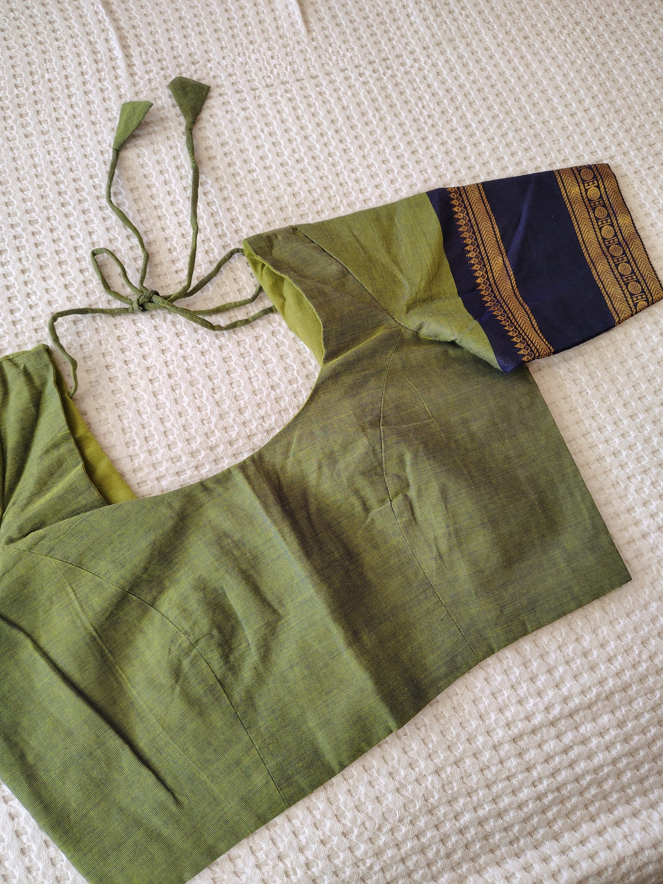 An elegant blouse with a round neck design with an enticing skirt with tall gold zari borders. The soft and light contrast Dupatta enhances the look.