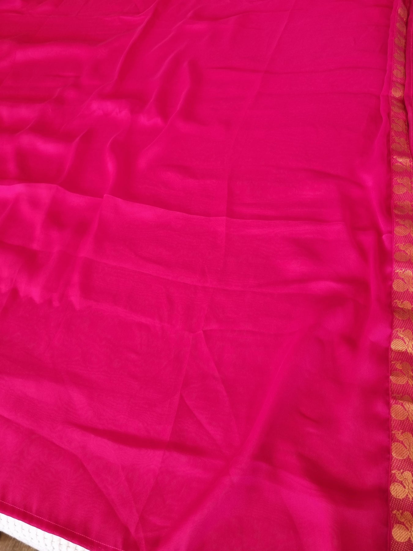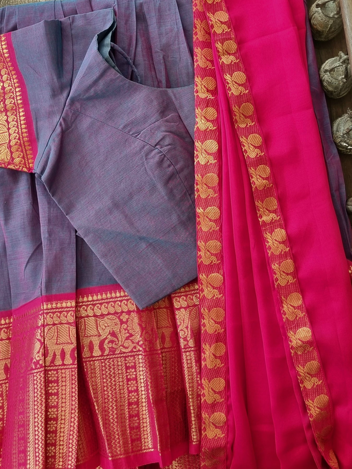 • An elegant blouse with a round neck design with an enticing skirt with tall gold zari borders. The soft and light contrast Dupatta enhances the look.