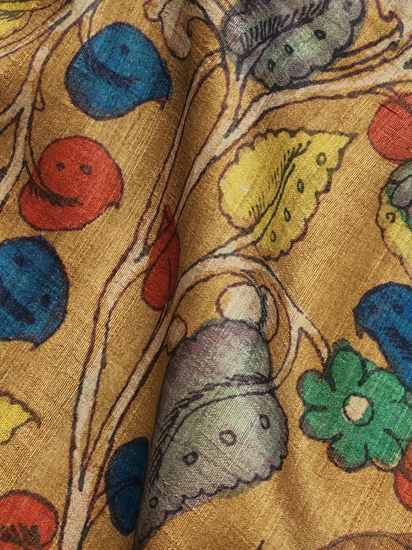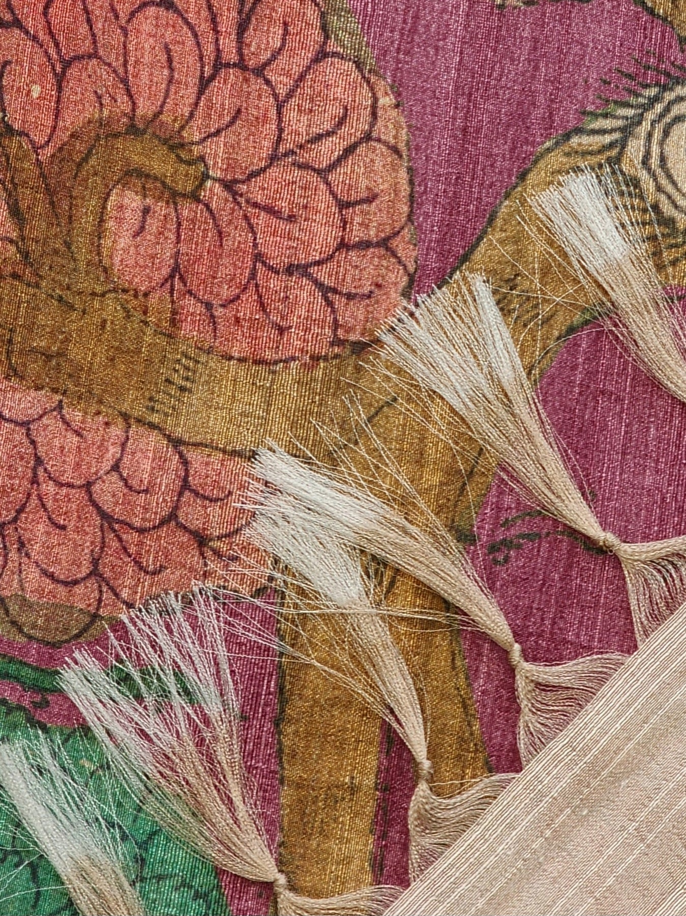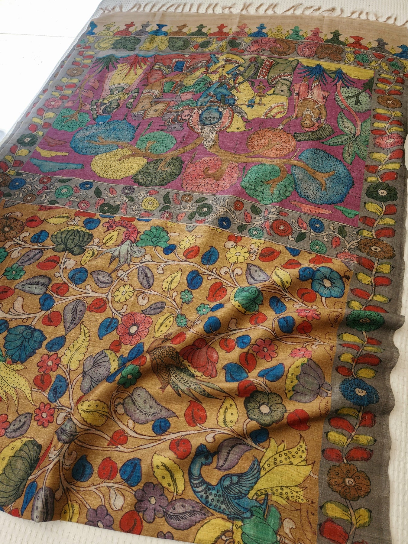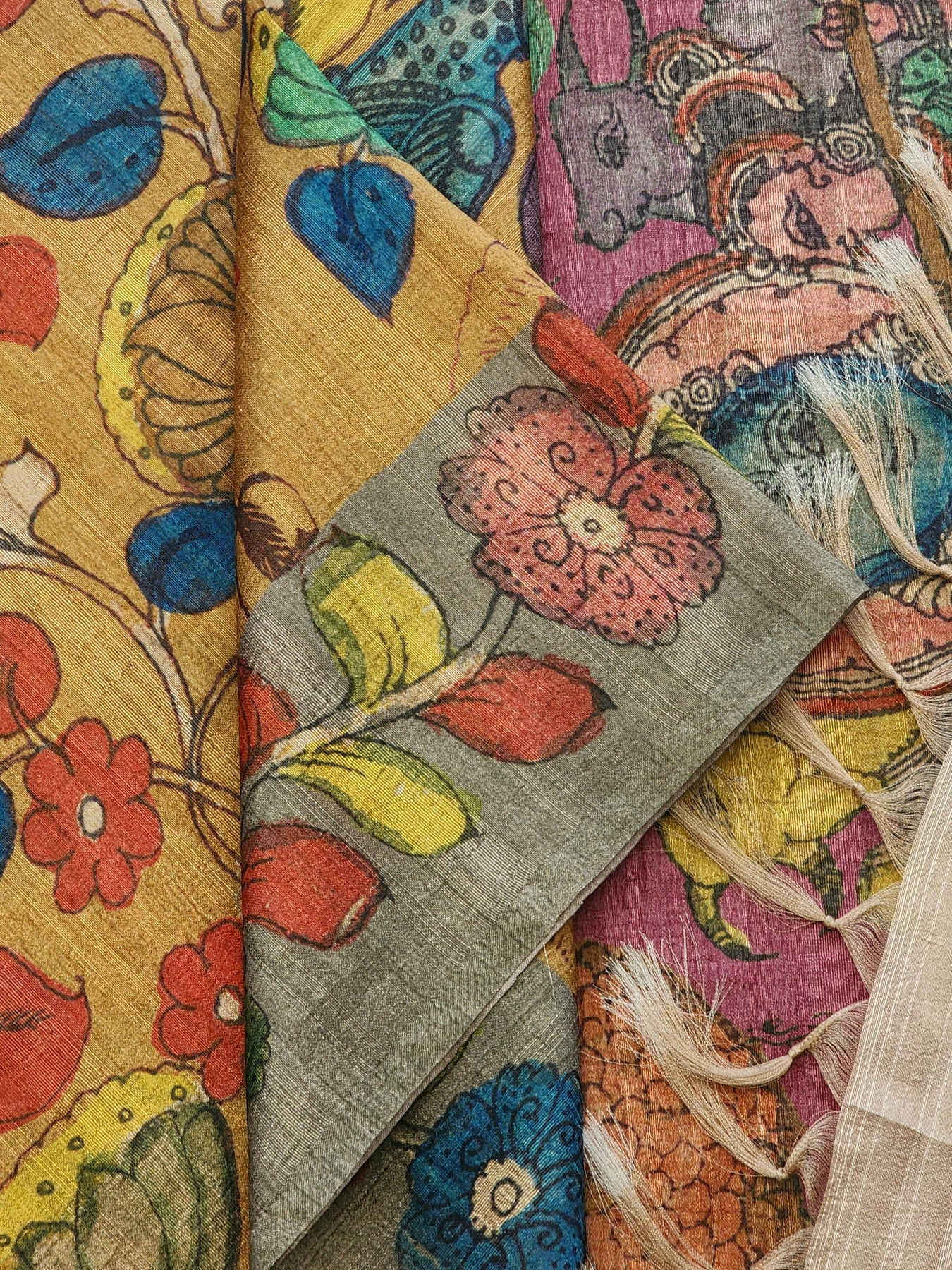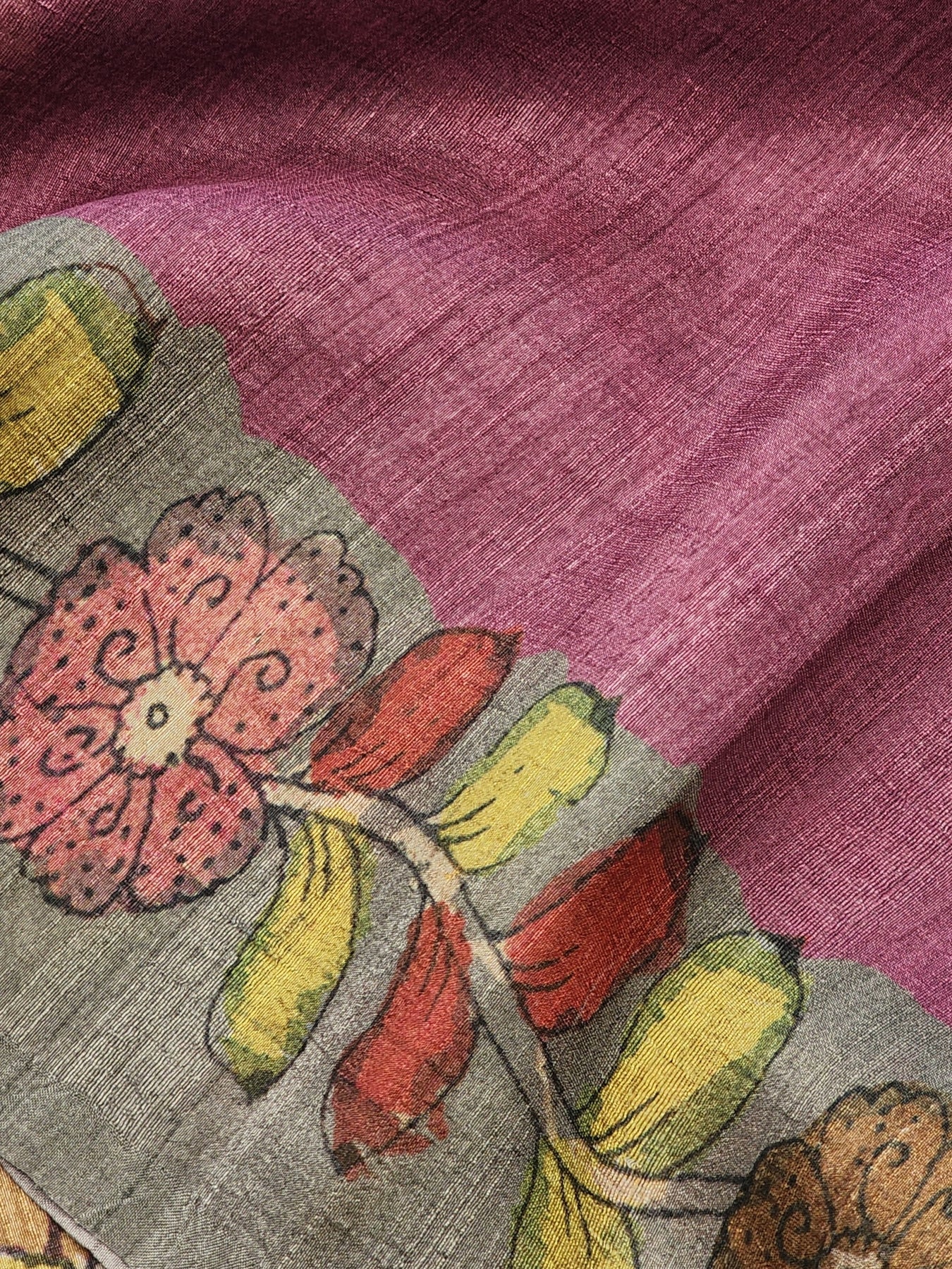 An elegant Semi Tussar Silk Saree with contrast borders and Kalamkari Prints on the body of the saree