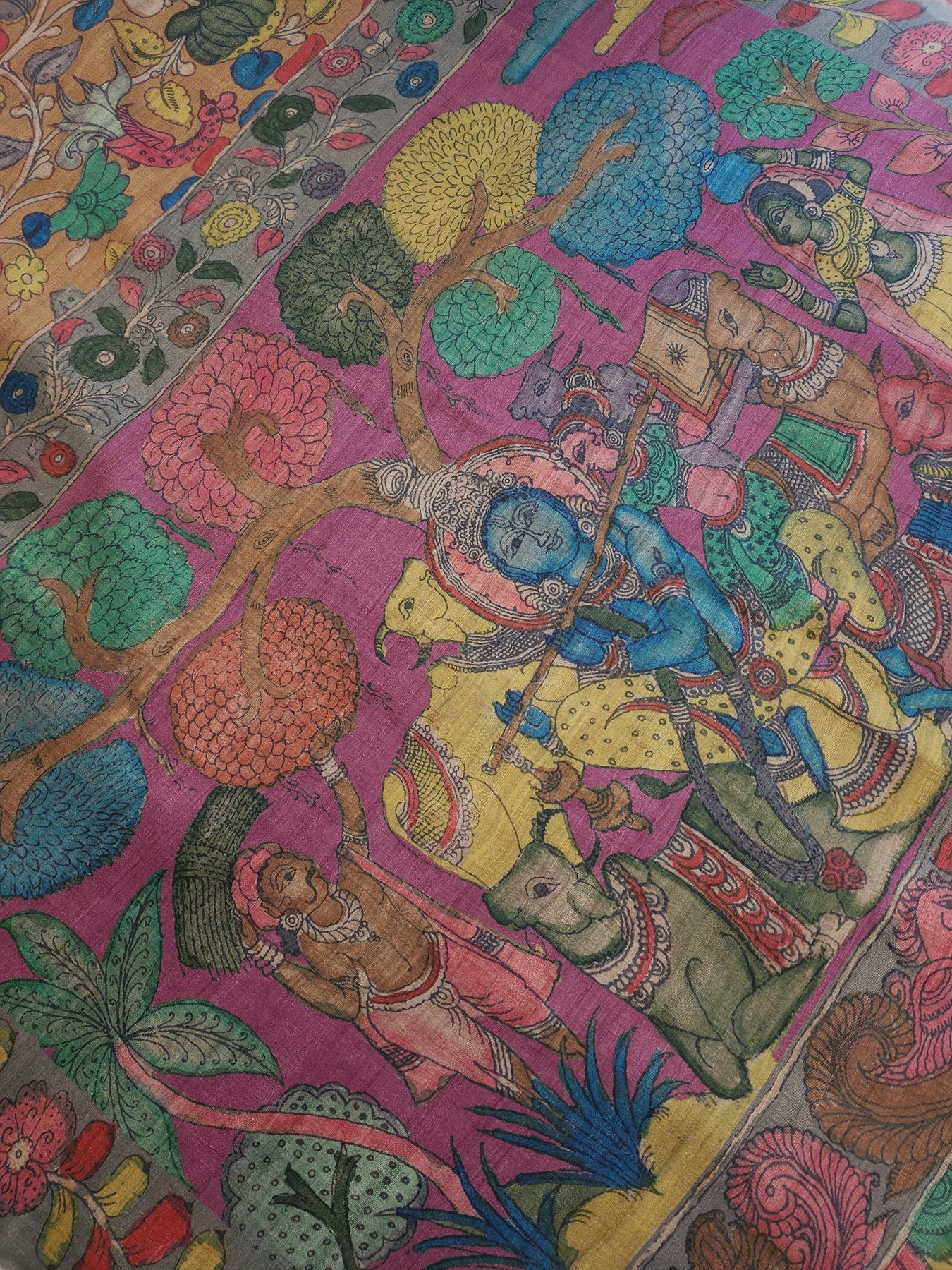 The contrast borders and elegant Kalamkari prints elevate the style quotient