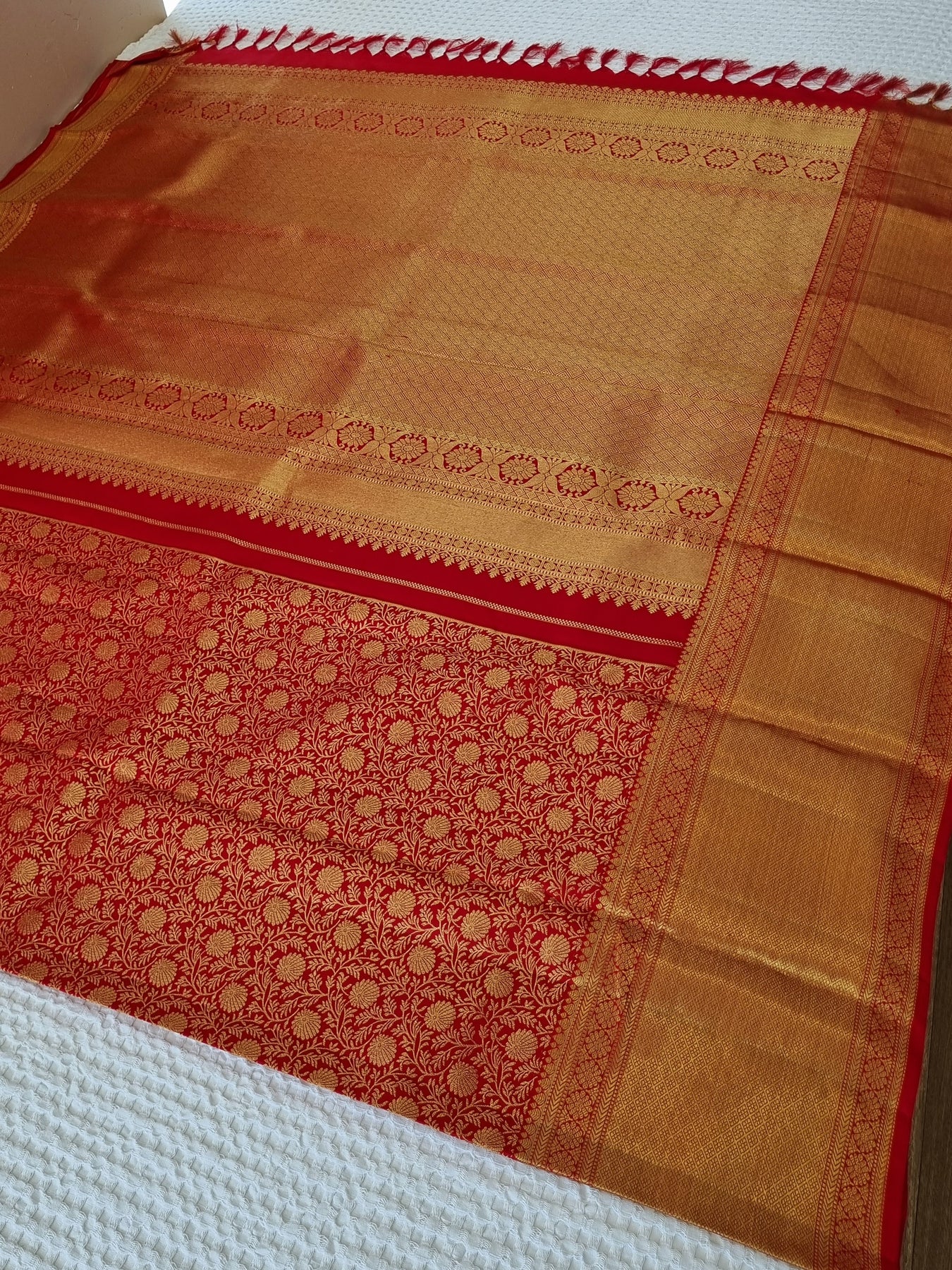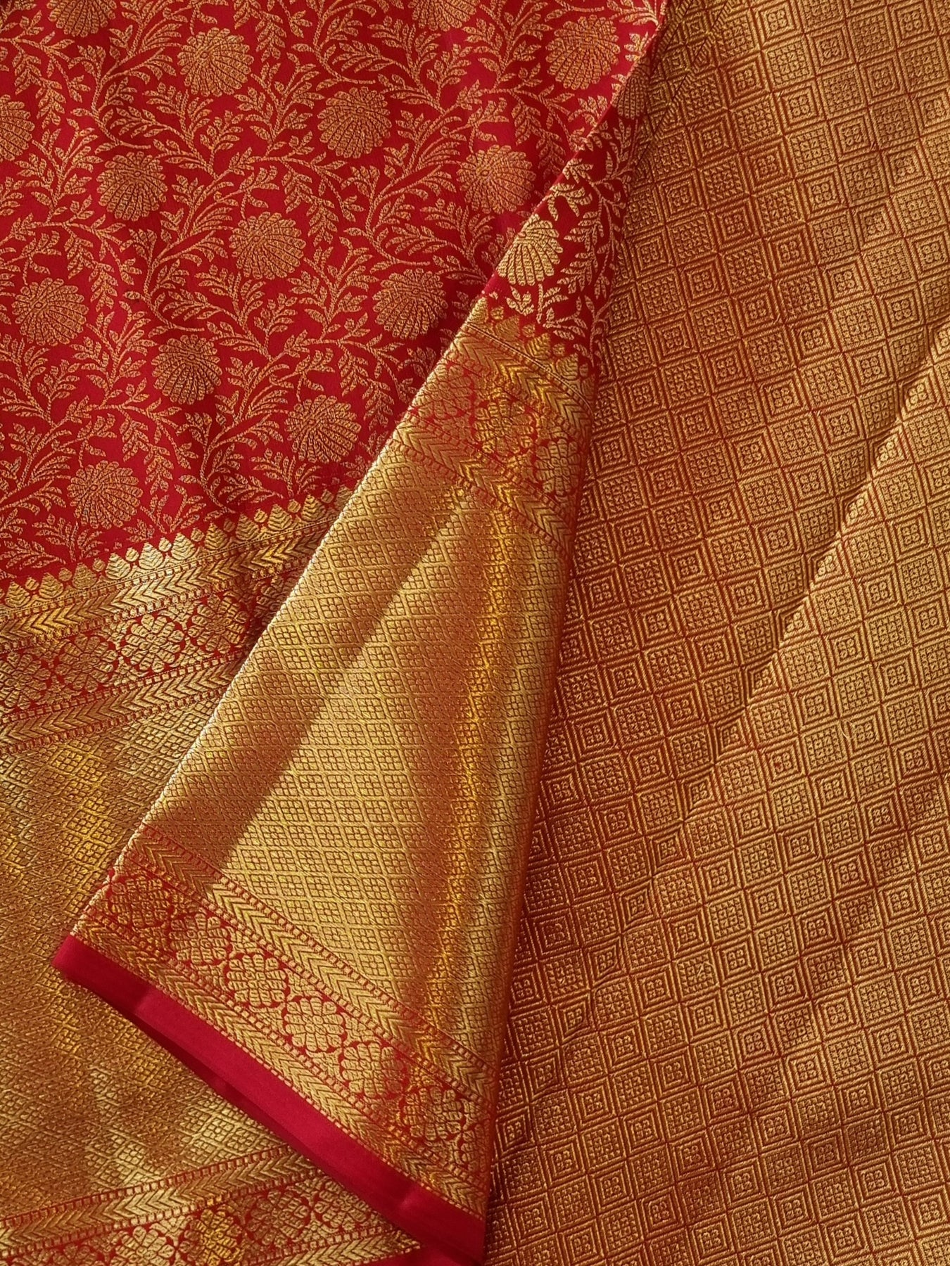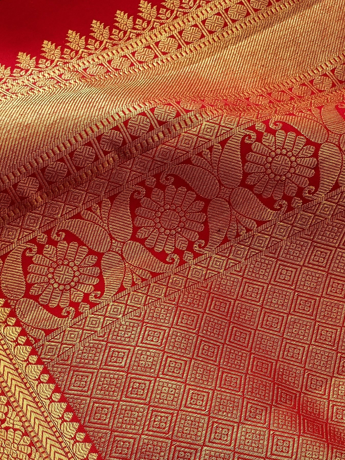 A rich and luxurious Kanjivaram saree with woven stylised designs across the body of the saree