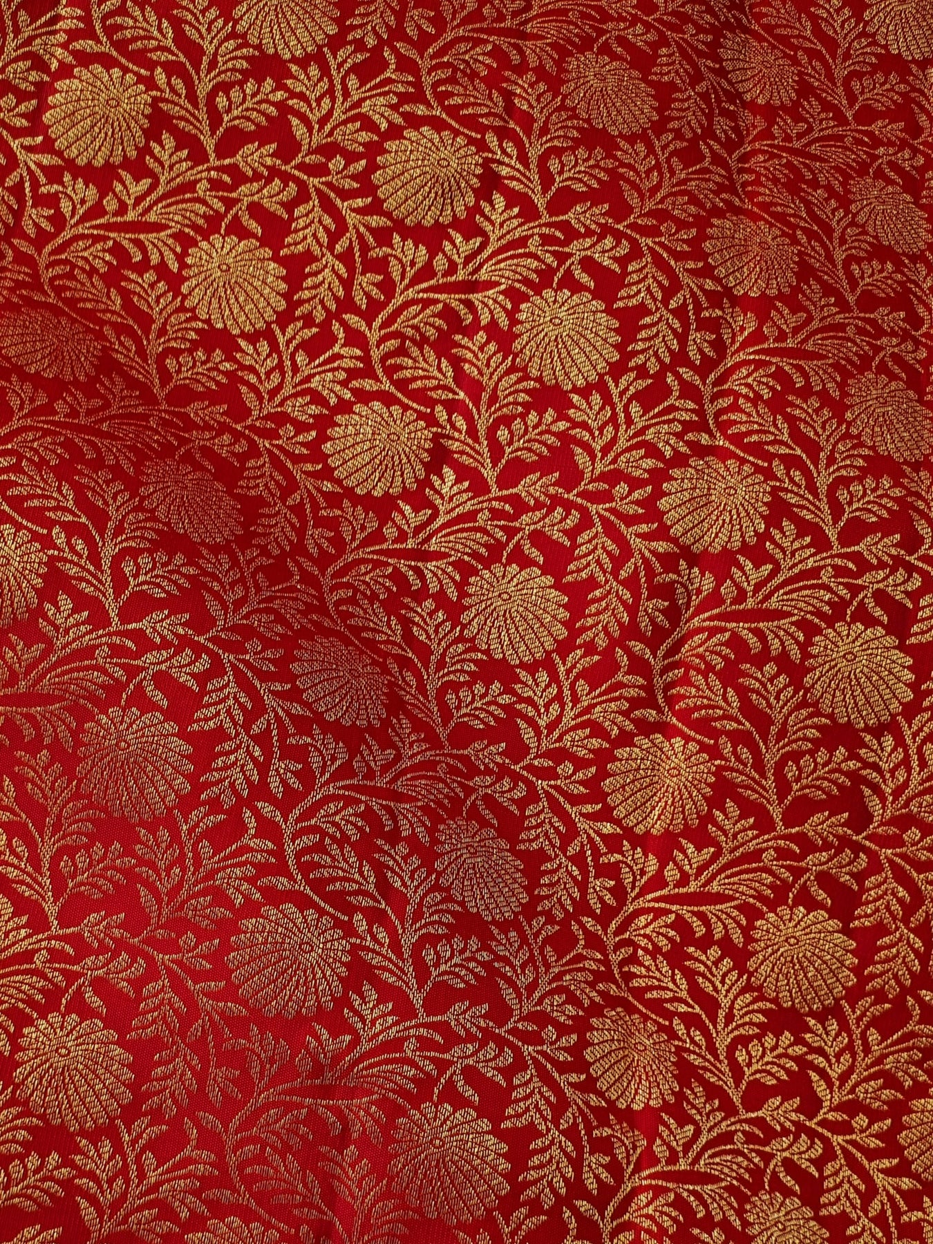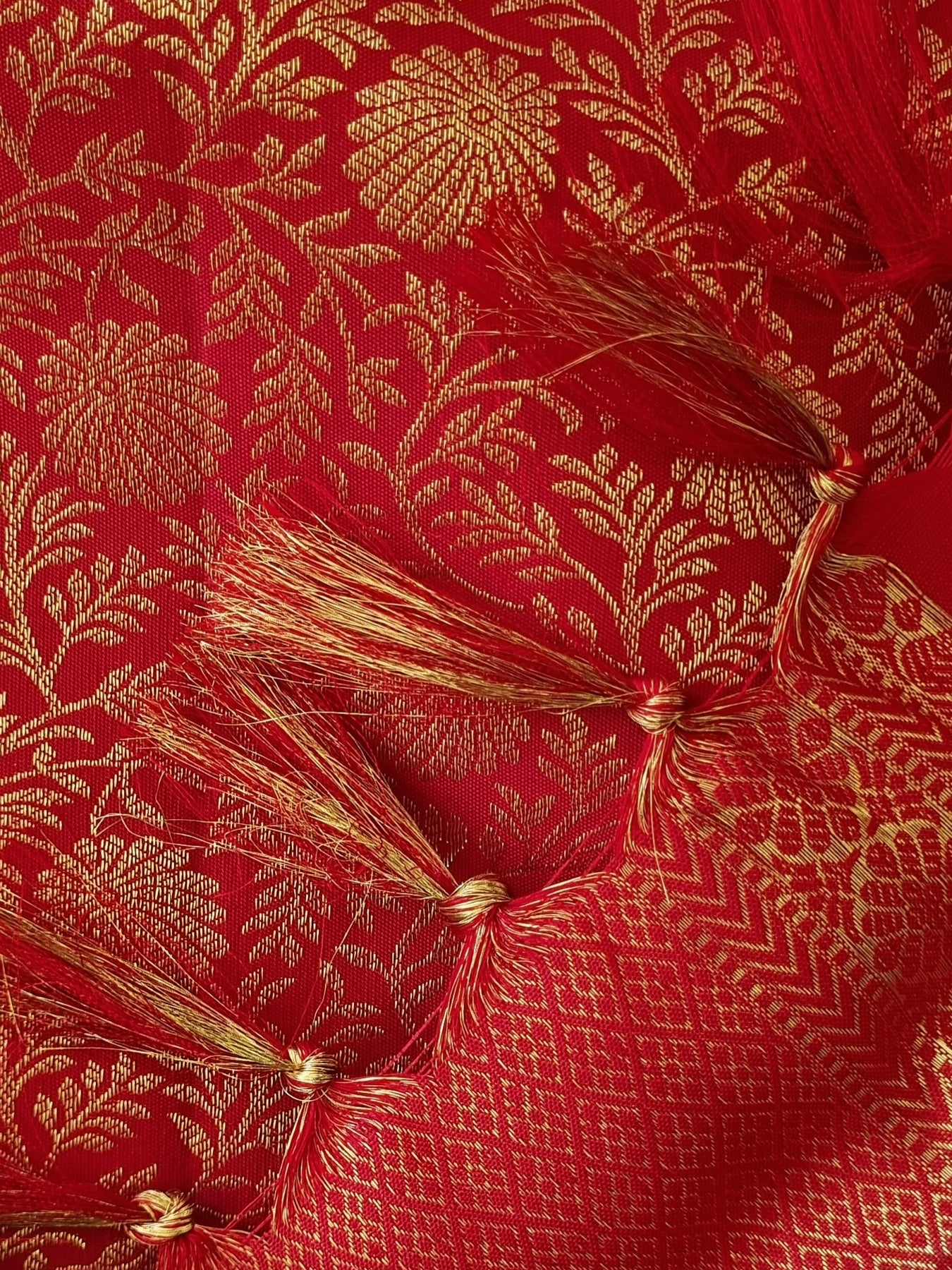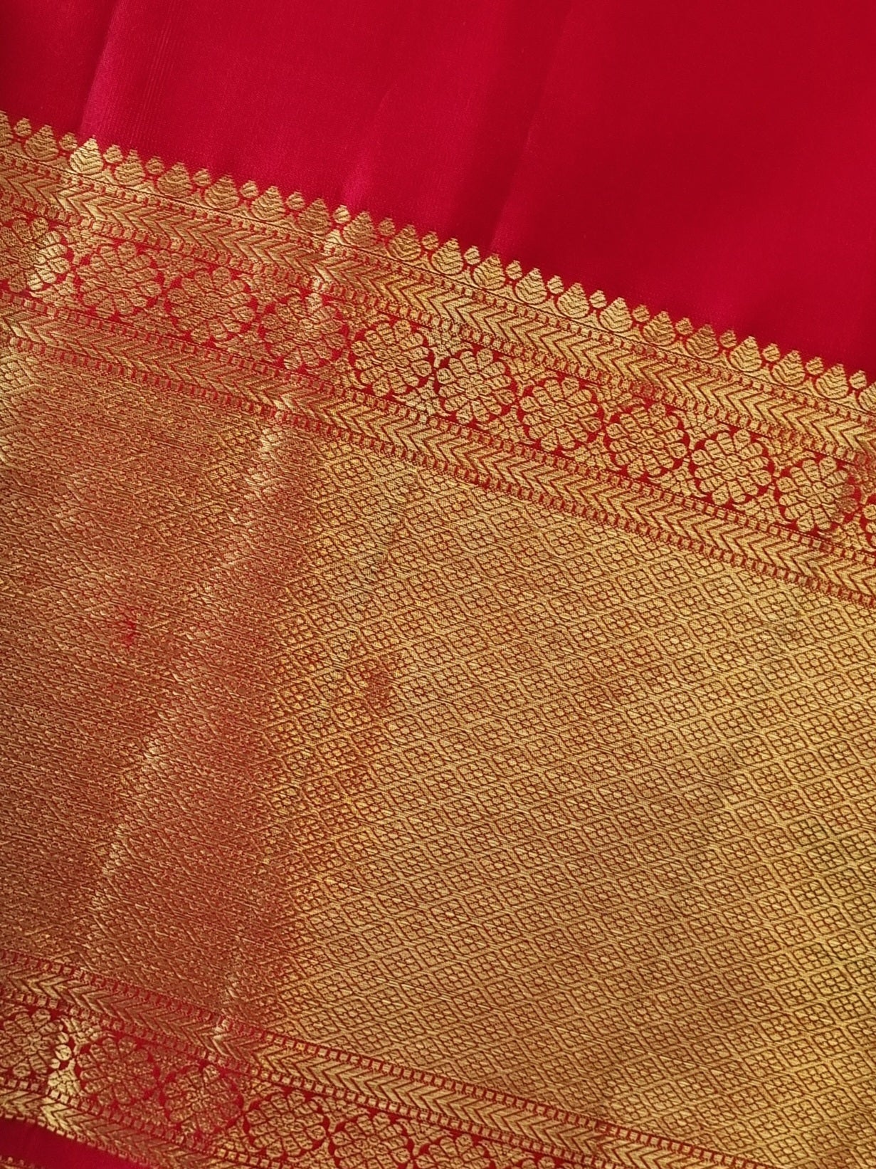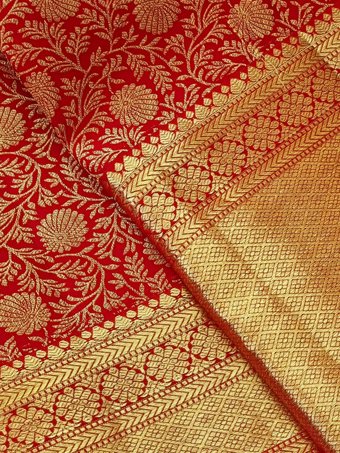 A rich and luxurious Kanjivaram saree with woven stylised designs across the body of the saree