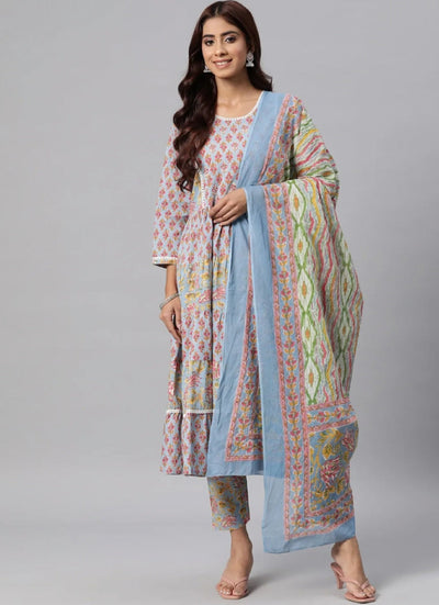 Floral Printed Thread Work Cotton Kurta Set