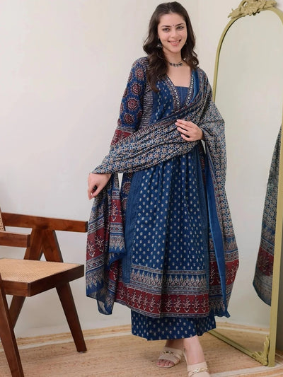 Navy Blue Block Printed Cotton Kurta Set