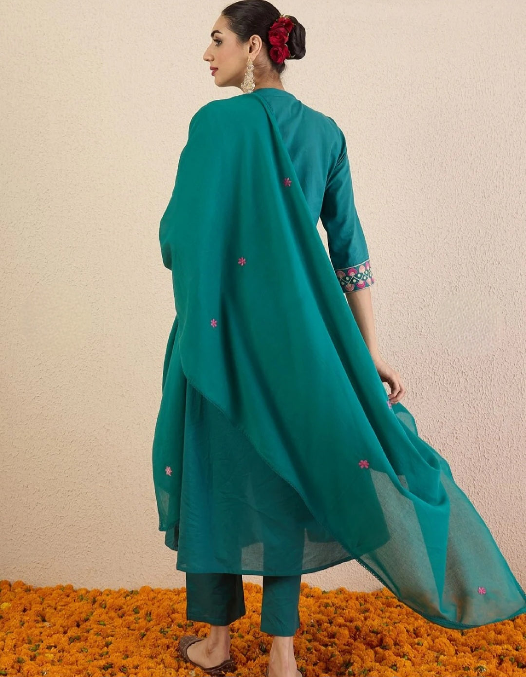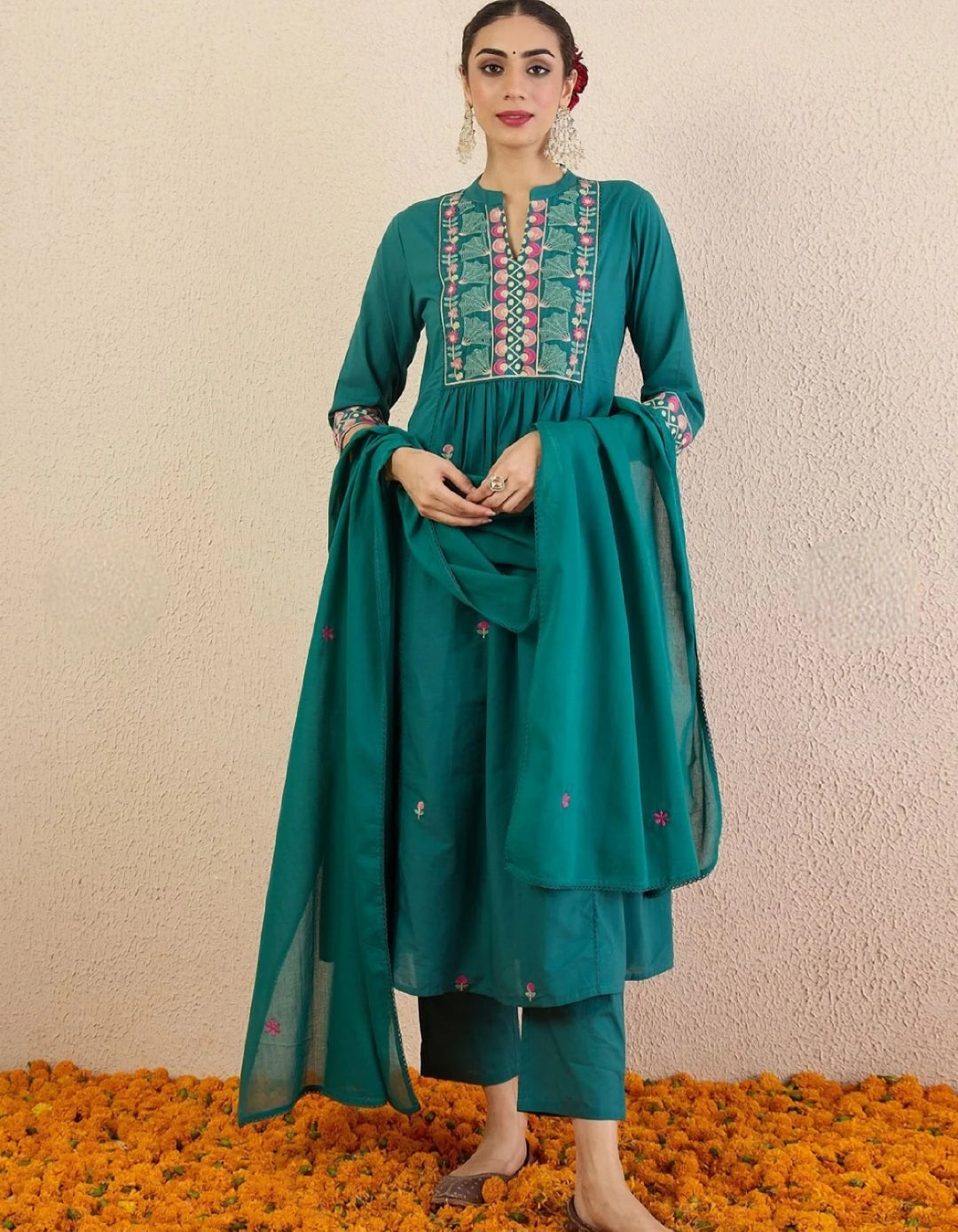 Teal Blue Ethnic Motif Embroidered A-Line Kurta with Trousers and Dupatta