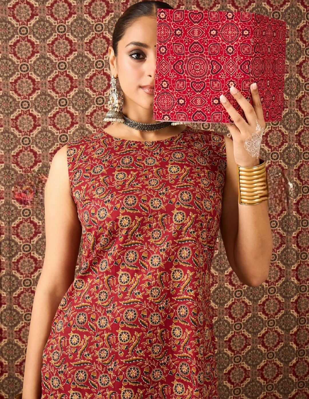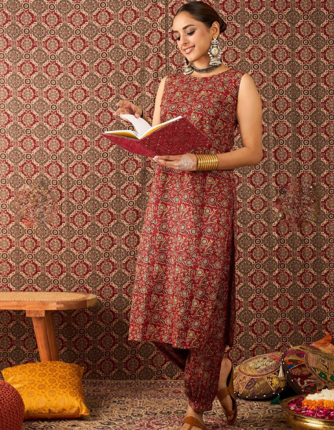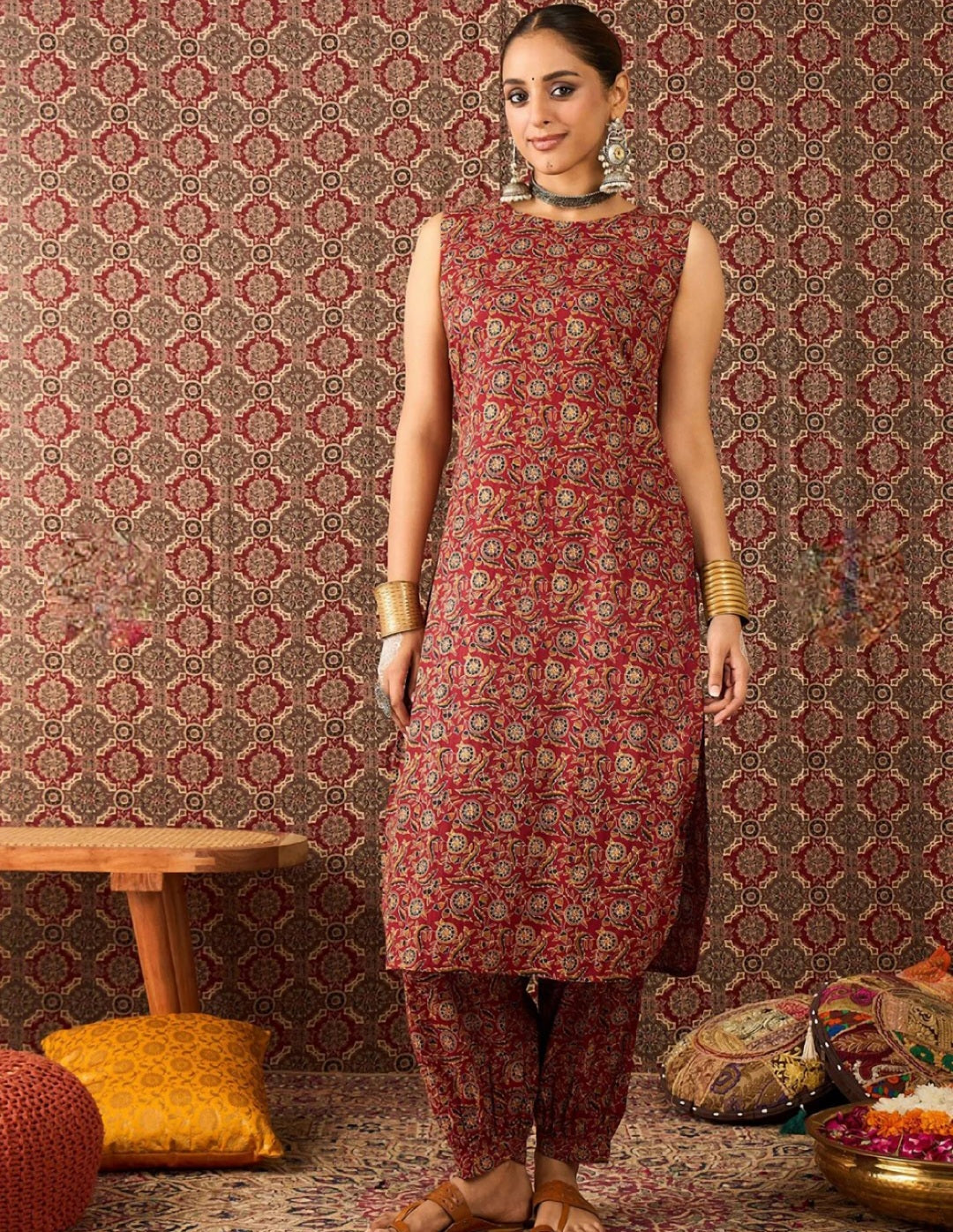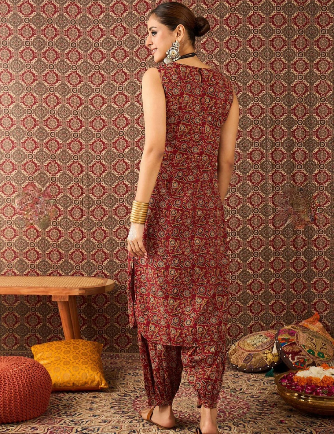 Maroon Ethnic Motif Printed Straight Kurta with Trousers