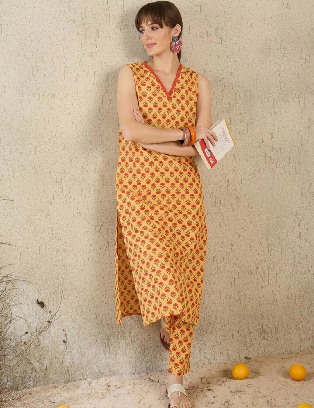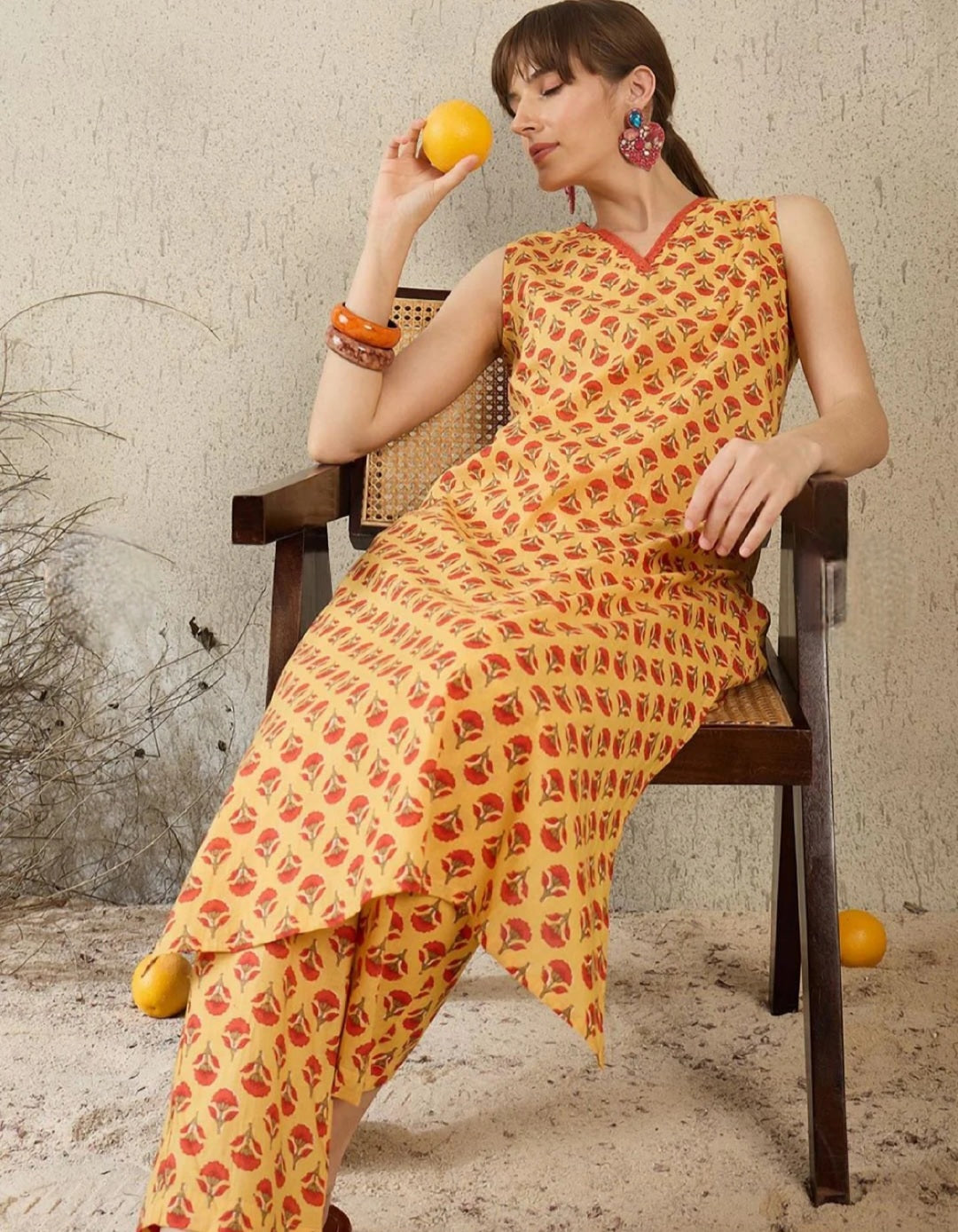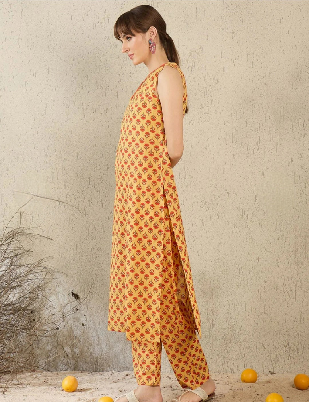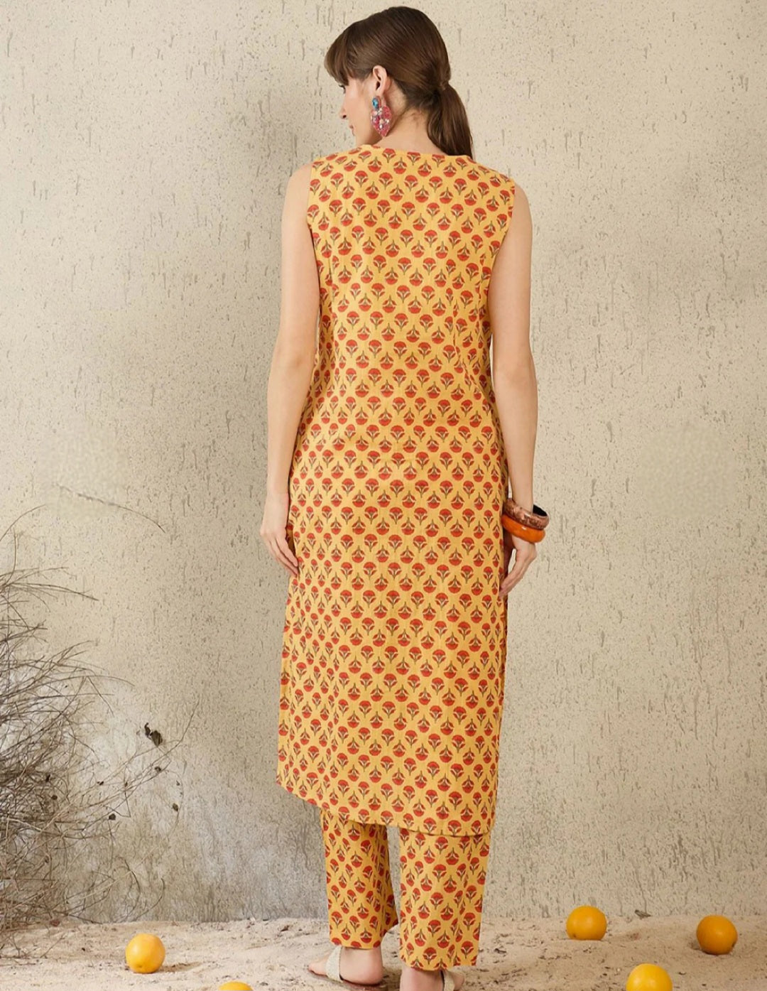 Mustard Yellow and Red Ethnic Motif Printed Cotton Kurta Set