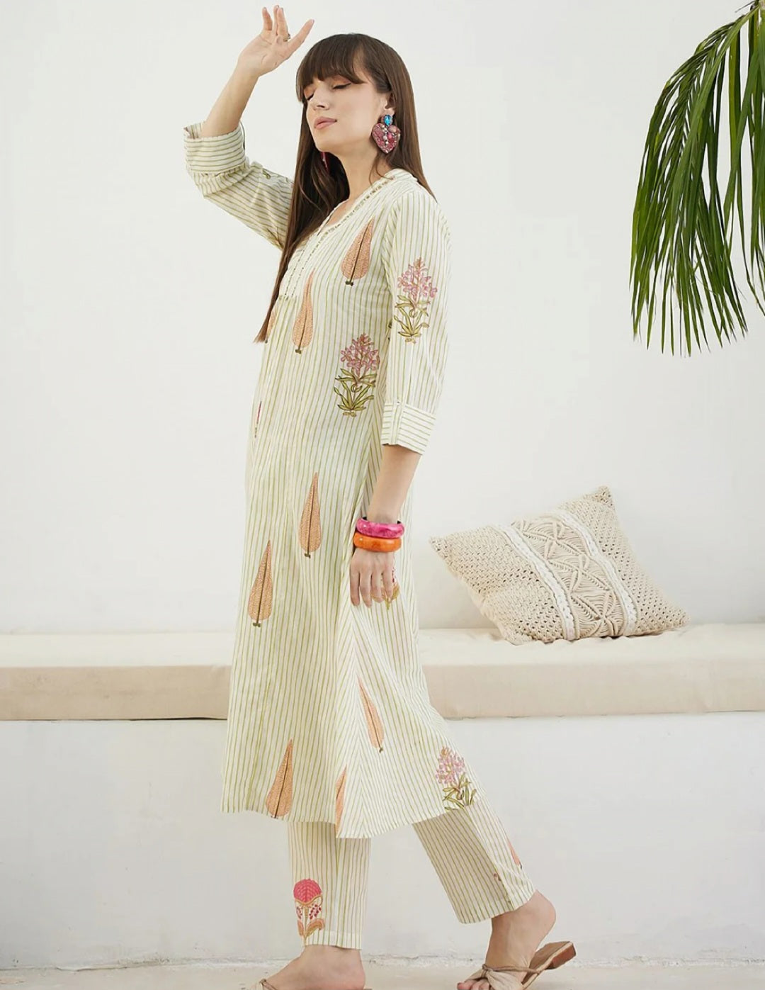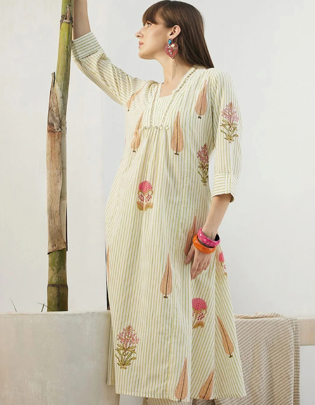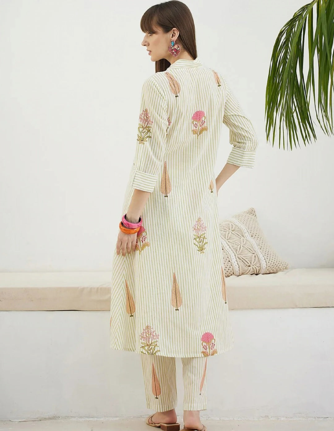 White & Pink Floral Printed A-Line Kurta with Striped Trousers