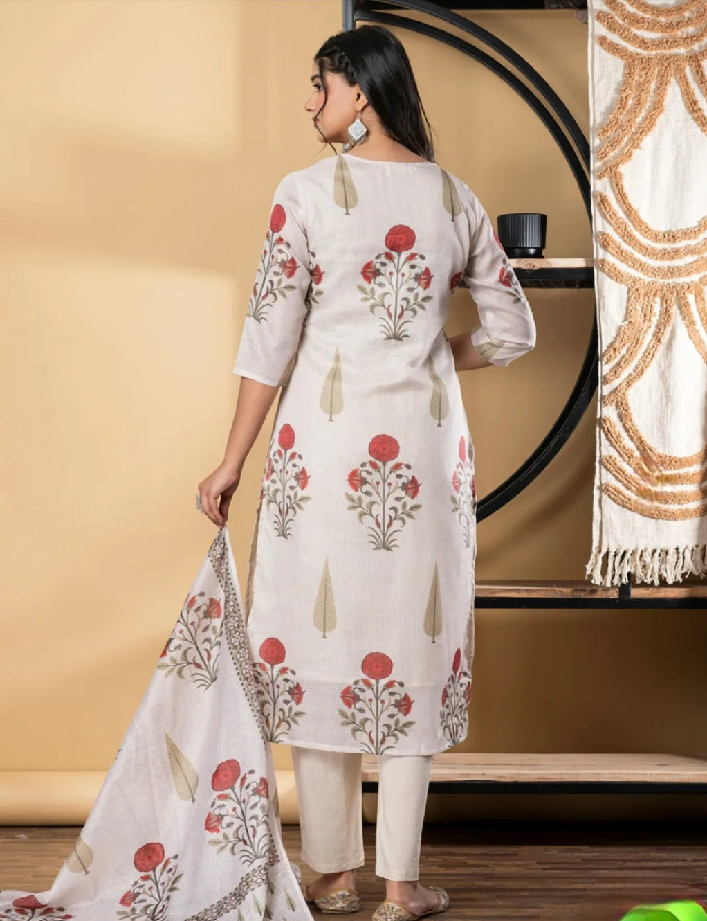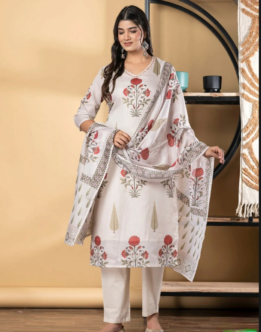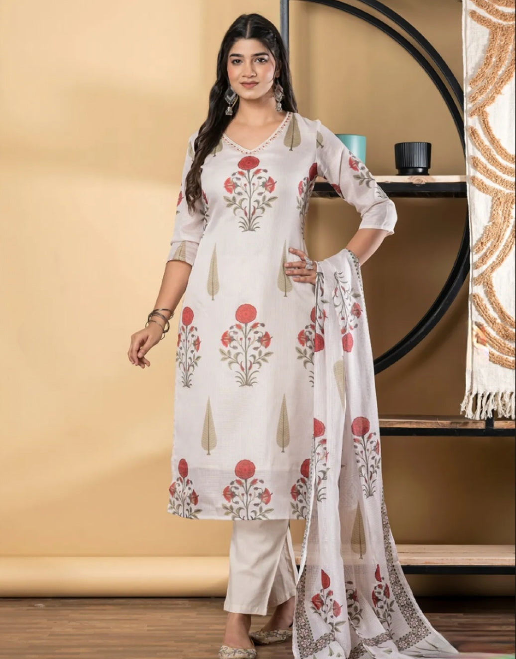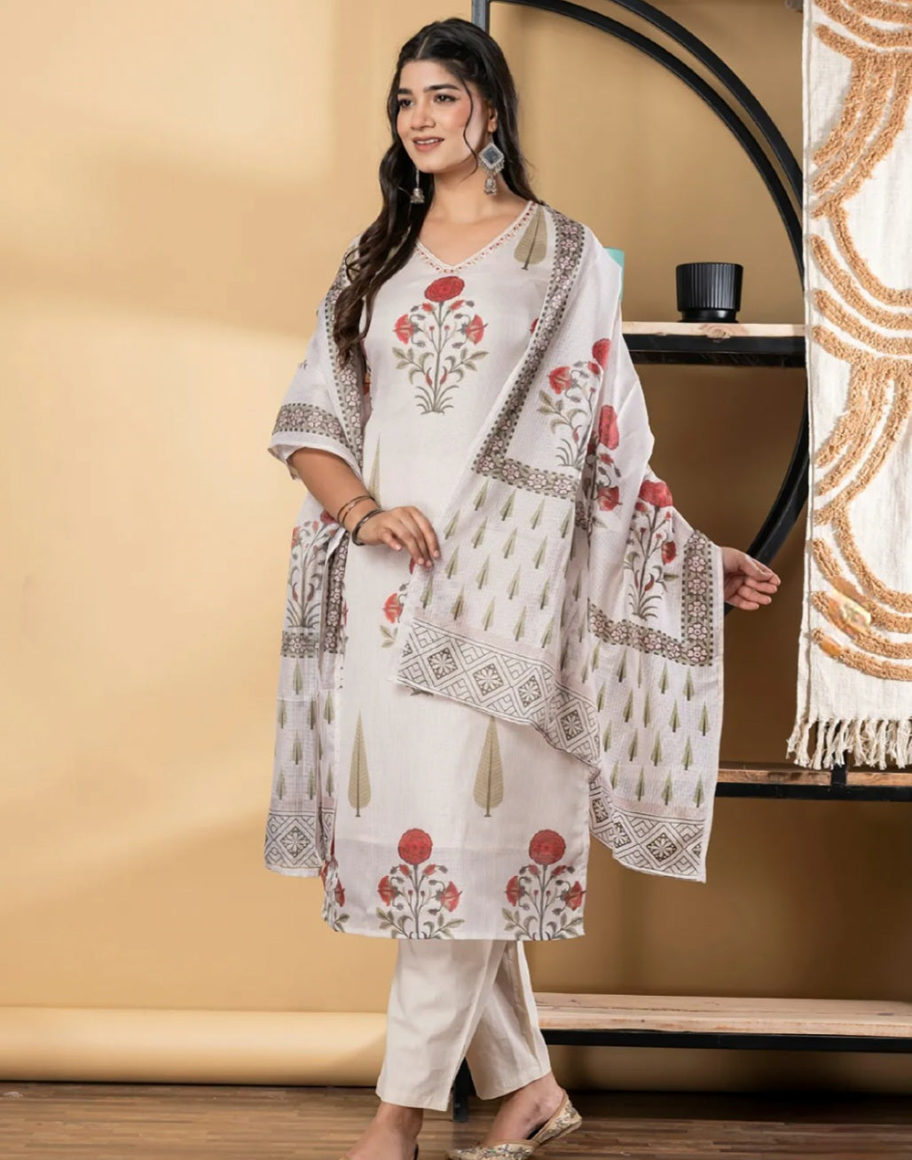 Off White Floral Printed Straight Kurta with Trousers and Dupatta