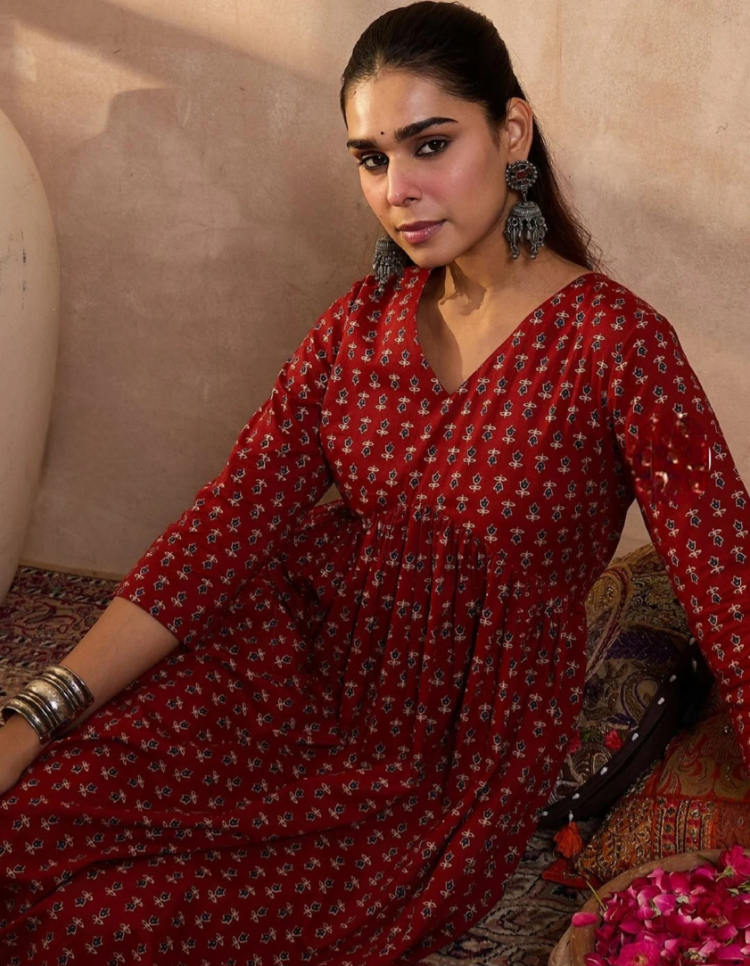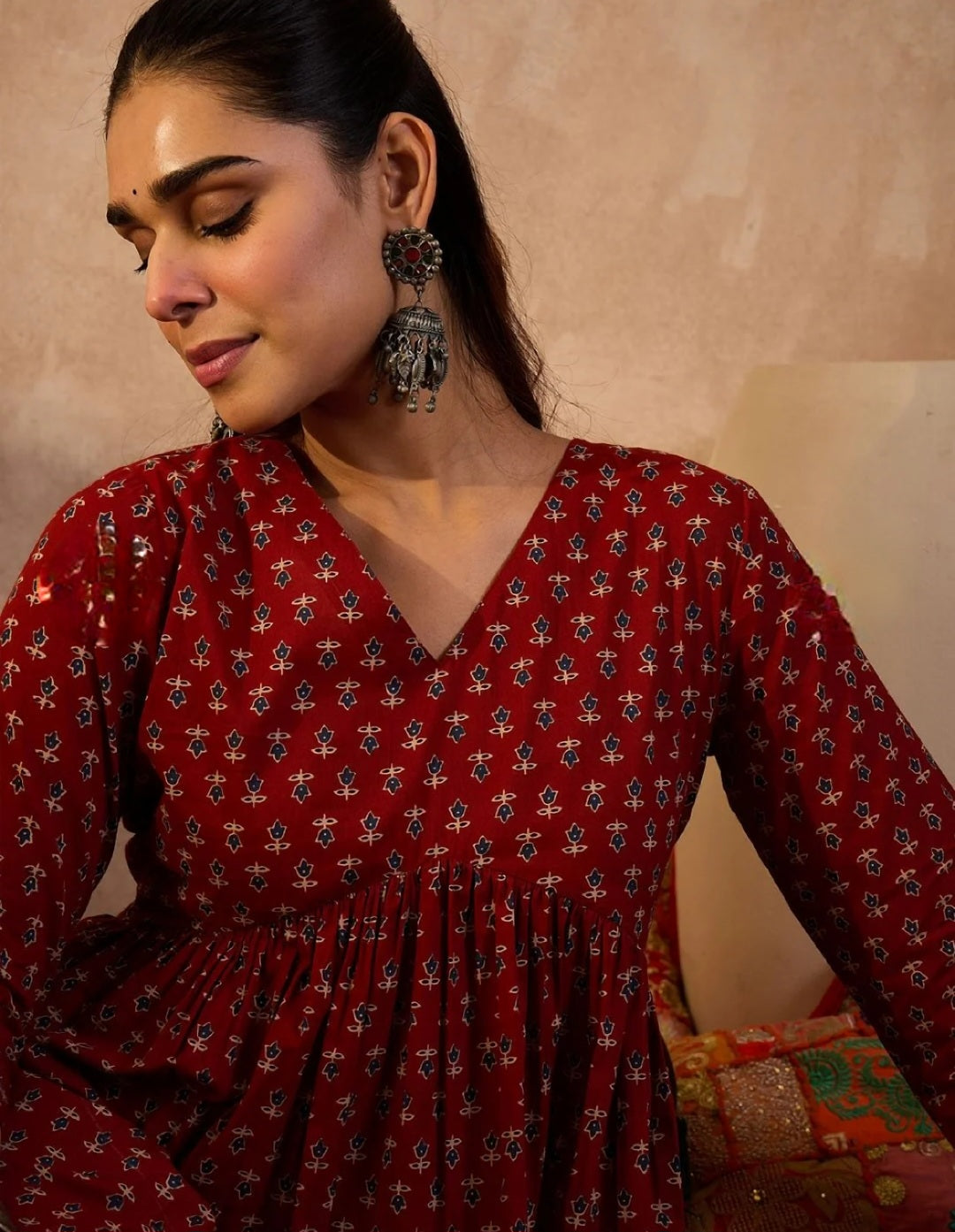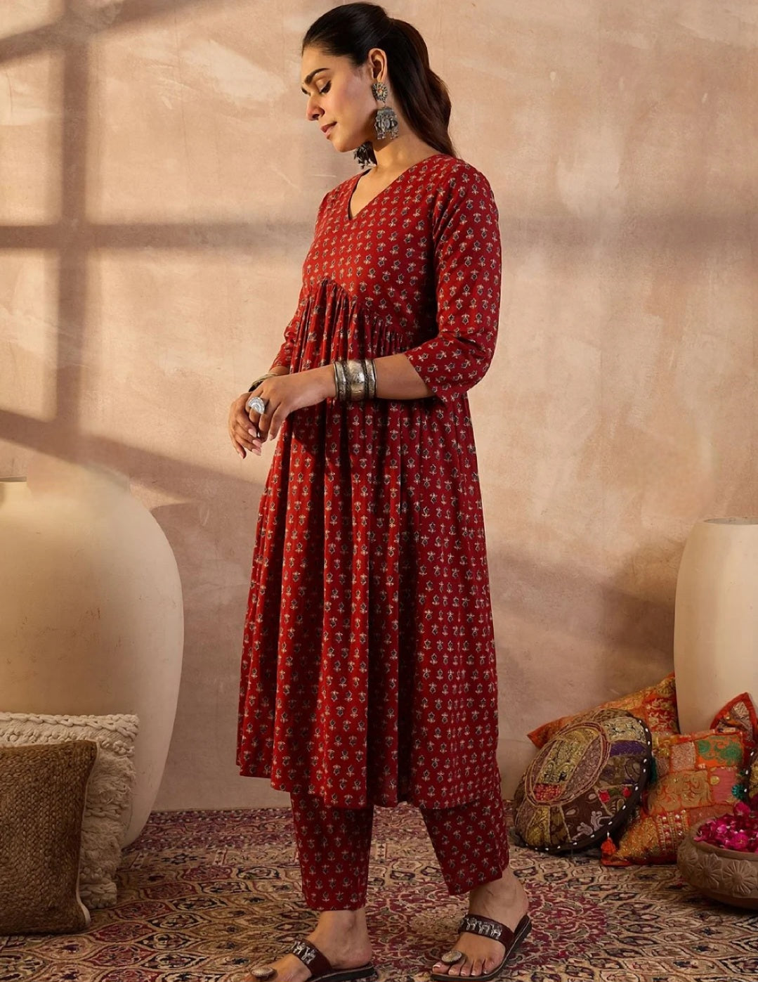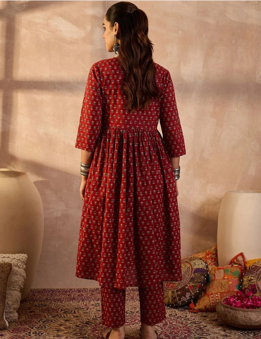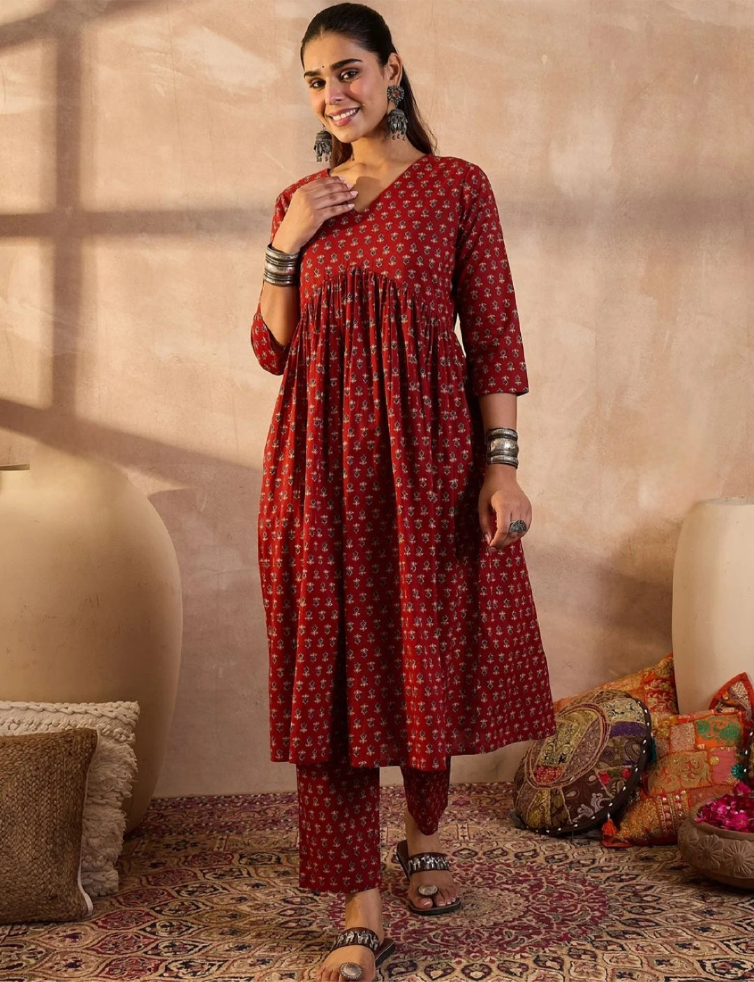 Maroon Ethnic Motifs Printed Cotton Kurta Set