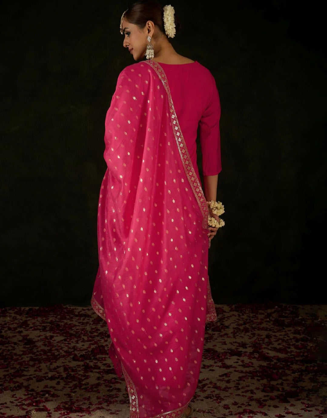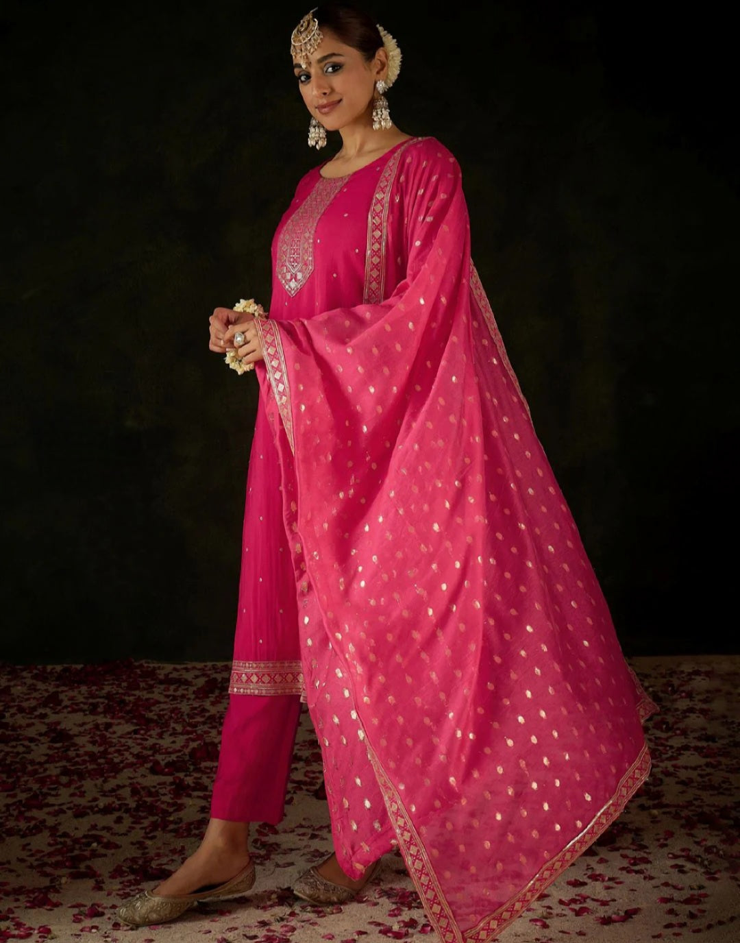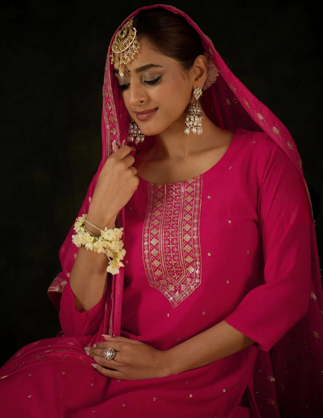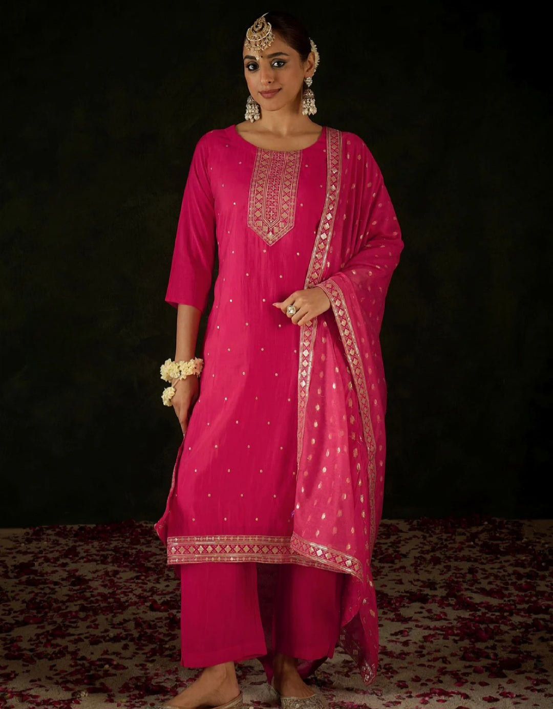 Pink Embroidered & Sequinned Straight Kurta with Trousers and Dupatta