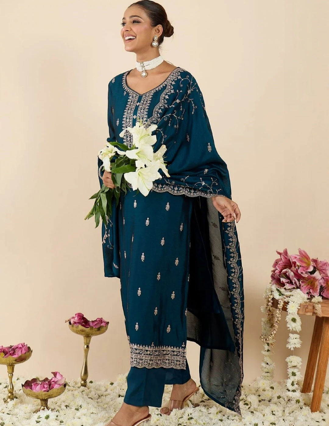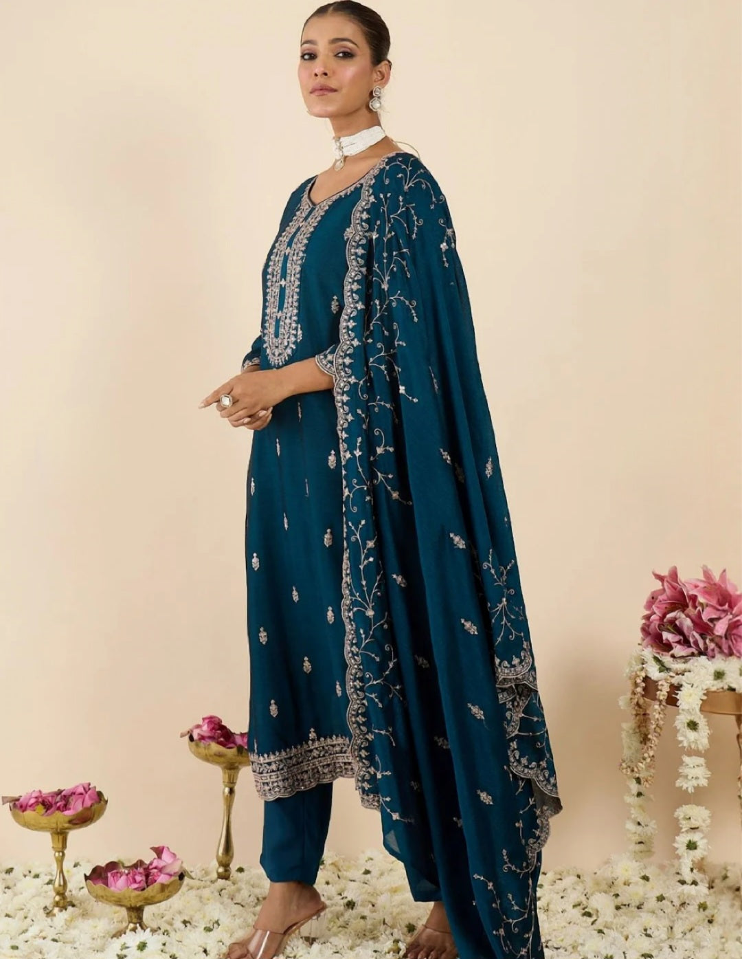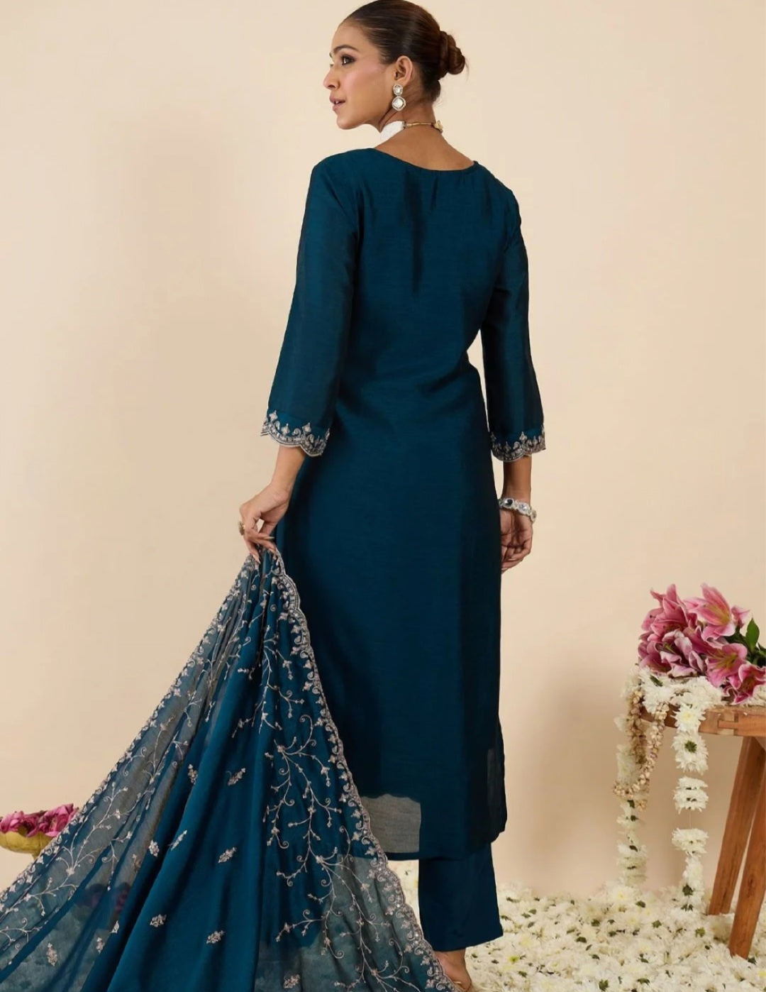 Solid Trousers with Embroidered Dupatta