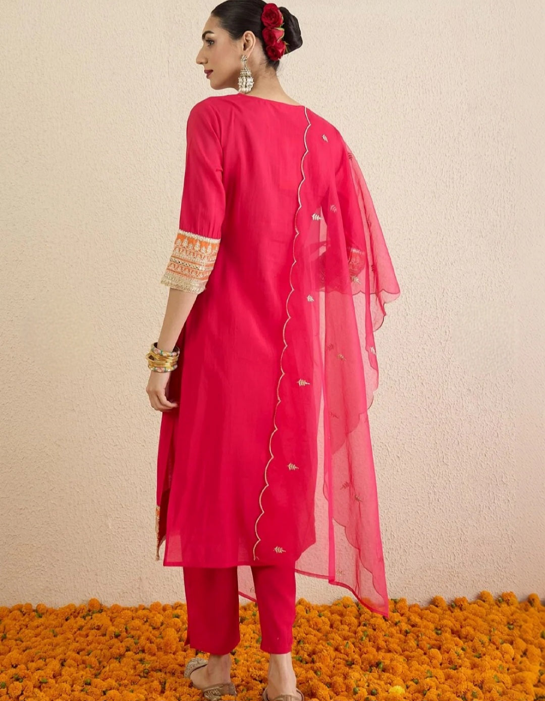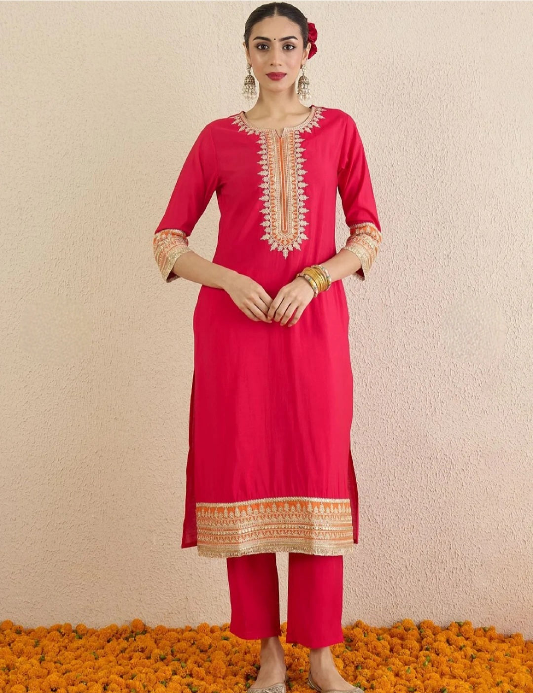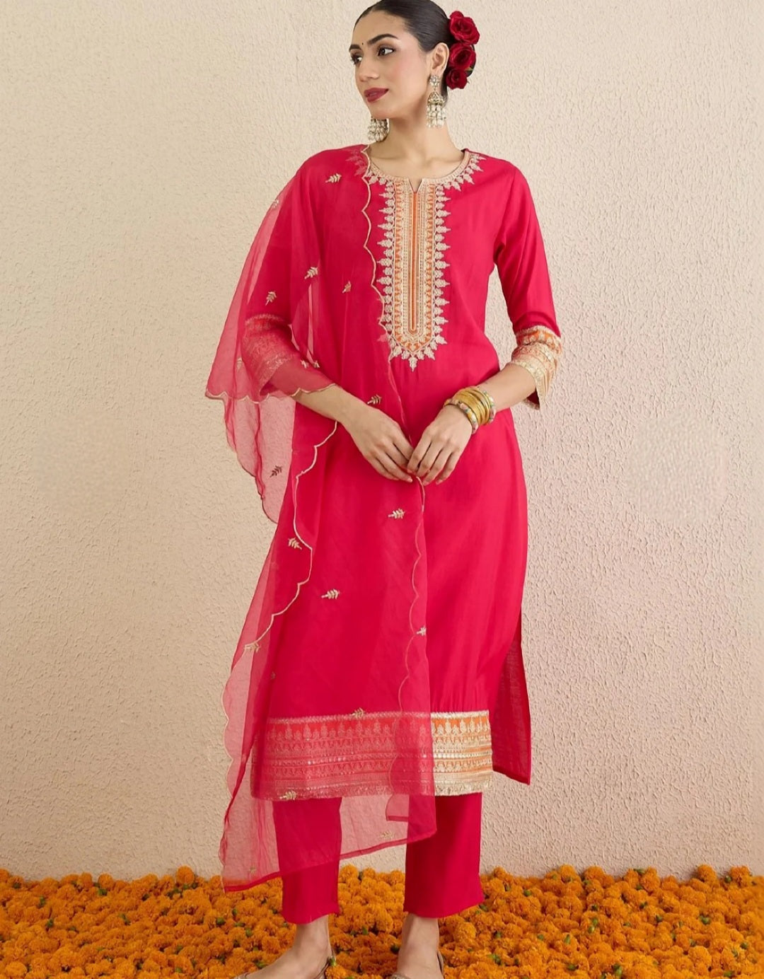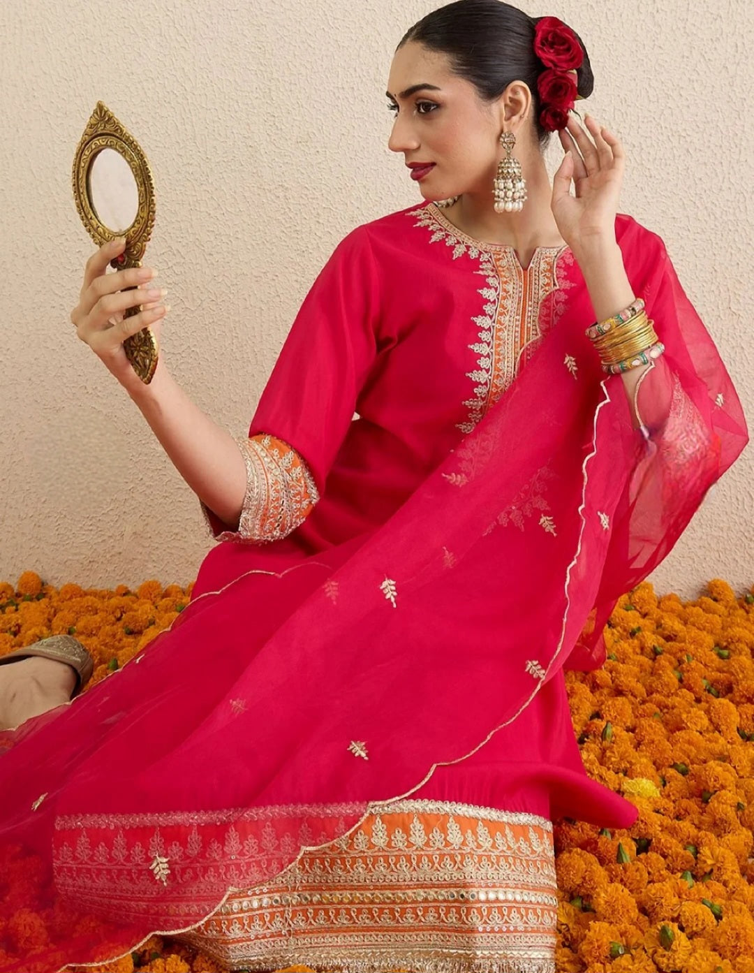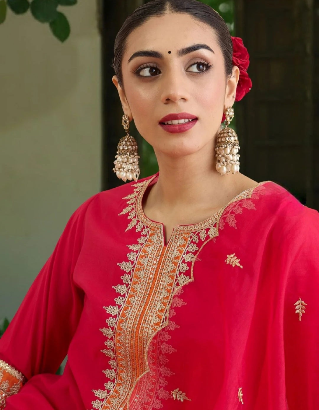 Red Embroidered & Sequinned Straight Kurta with Trousers and Dupatta