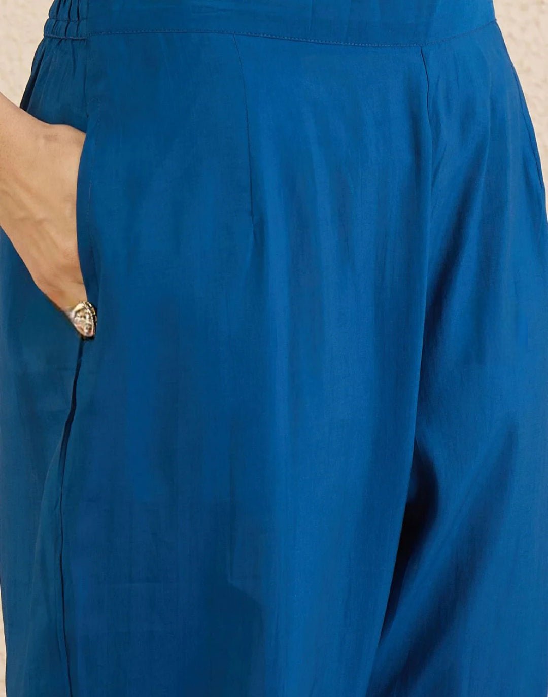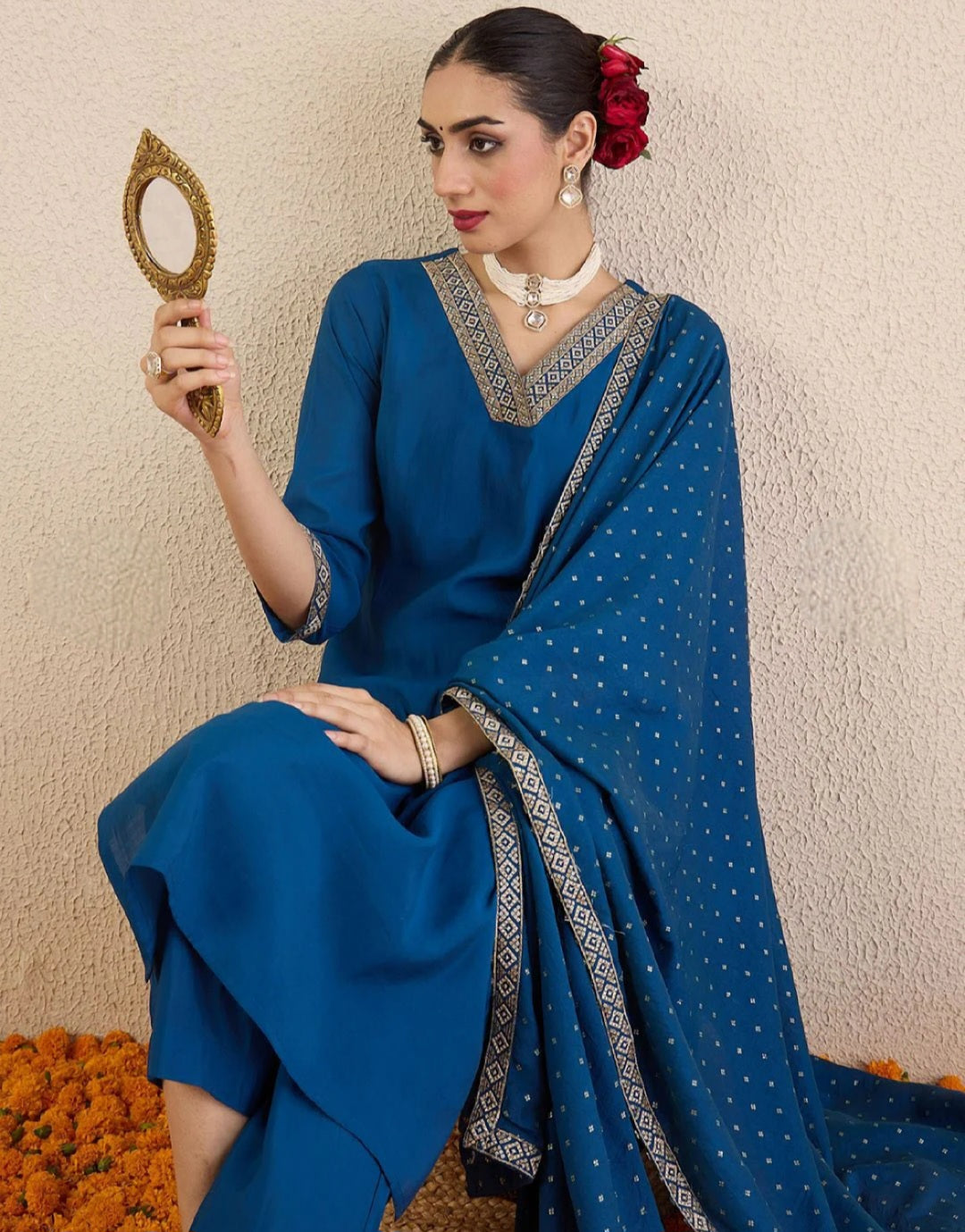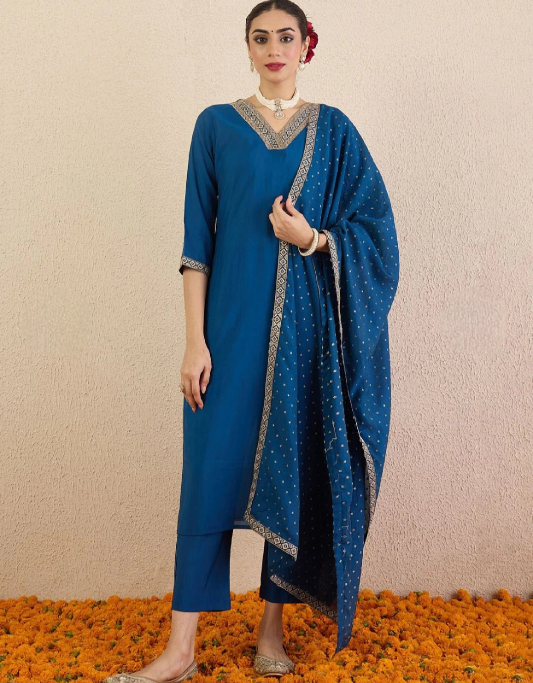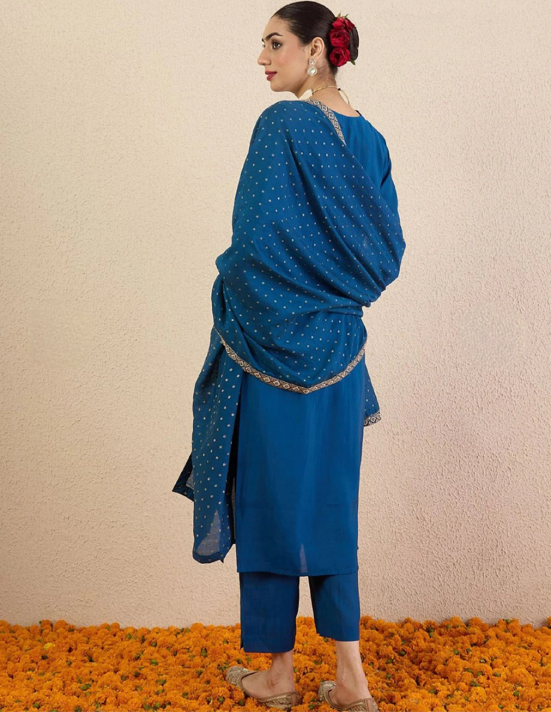 Blue Embroidered & Sequinned Straight Kurta with Trousers and Dupatta