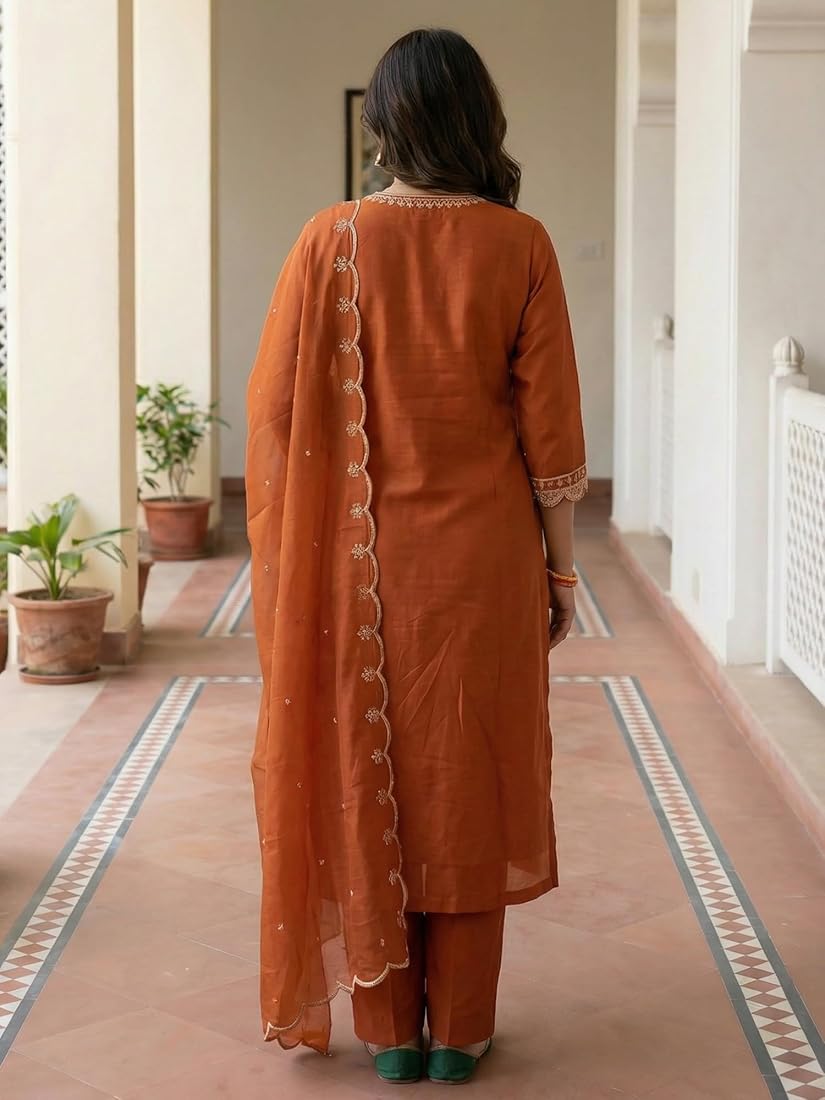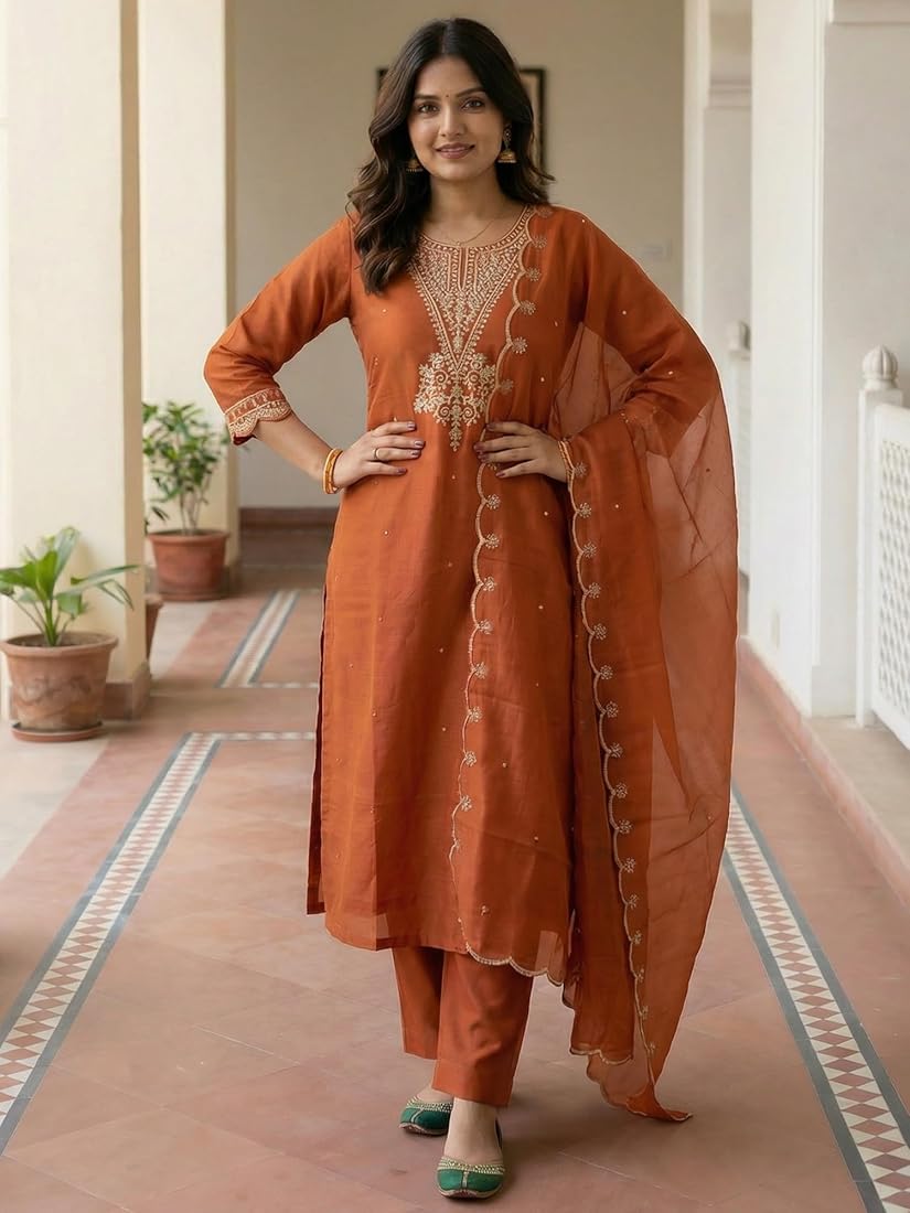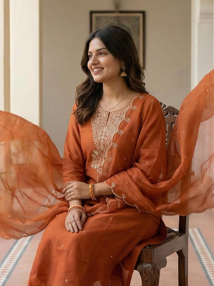 Orange Embroidered Silk Blend Kurta Set