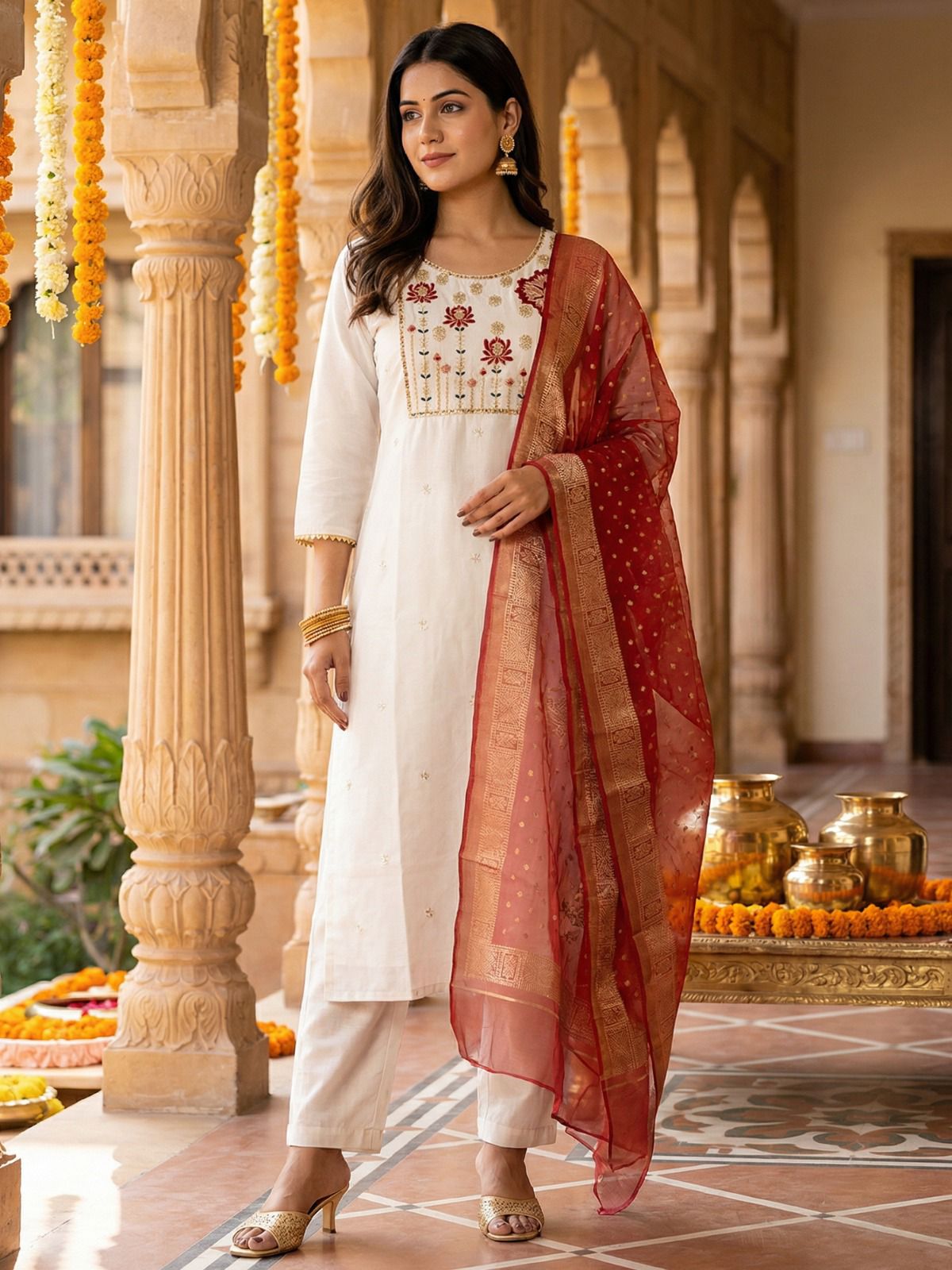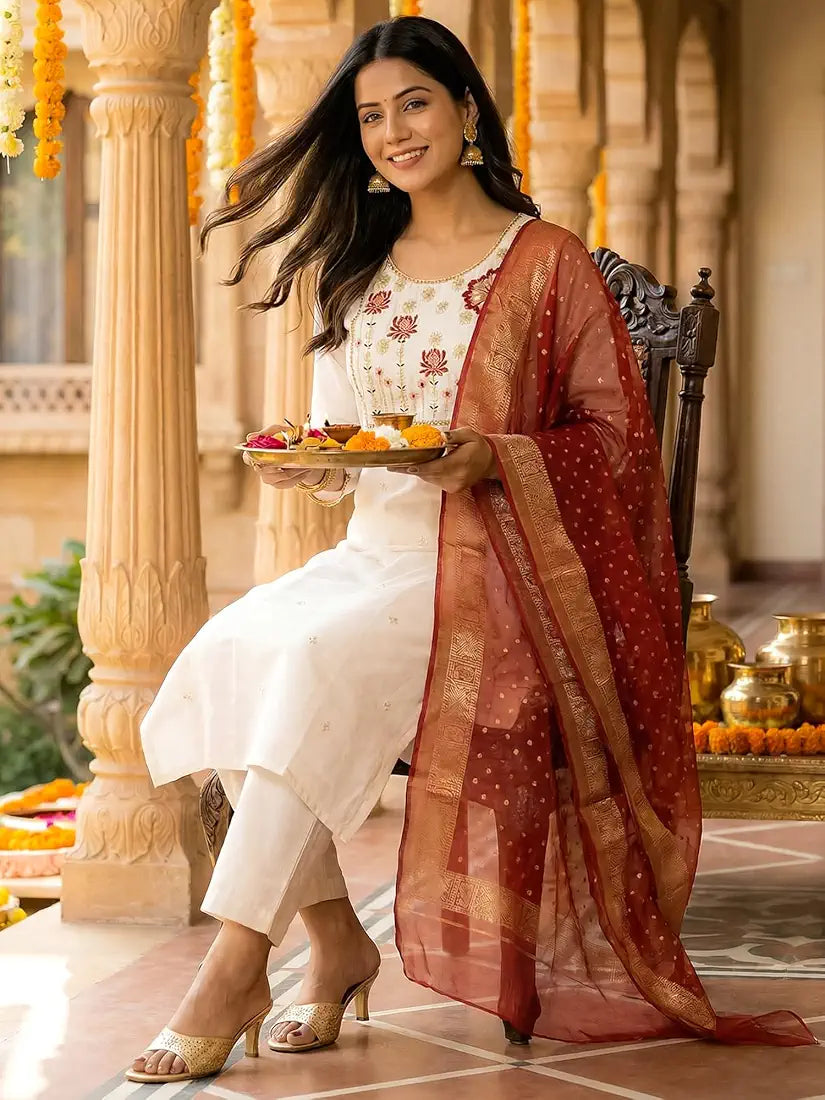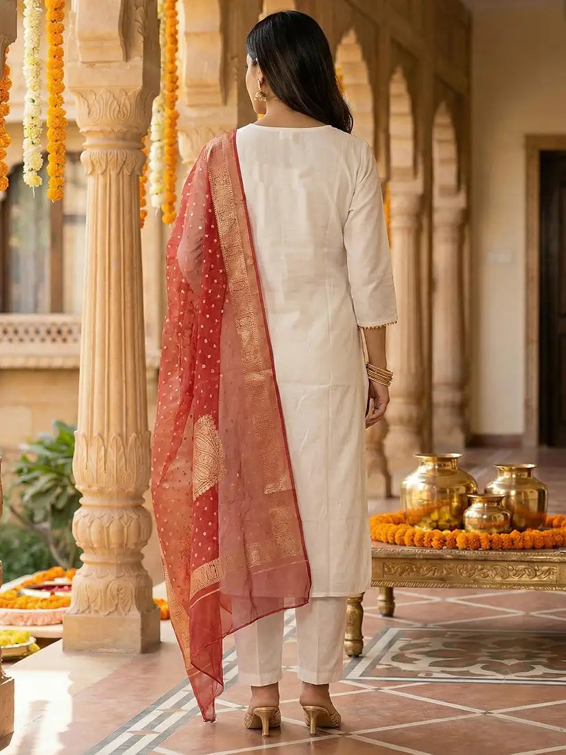 Kurta, Pants & Contrast Red Dupatta