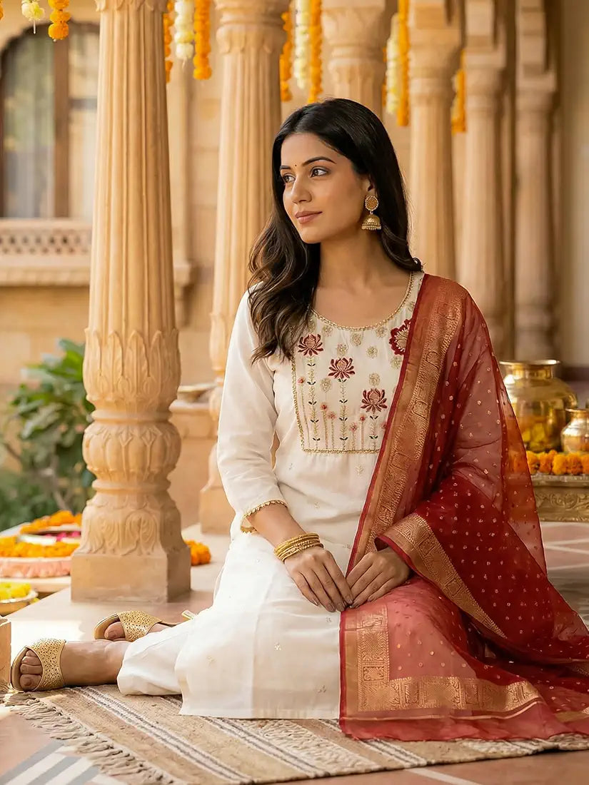 White Embroidered Silk Blend Kurta Set