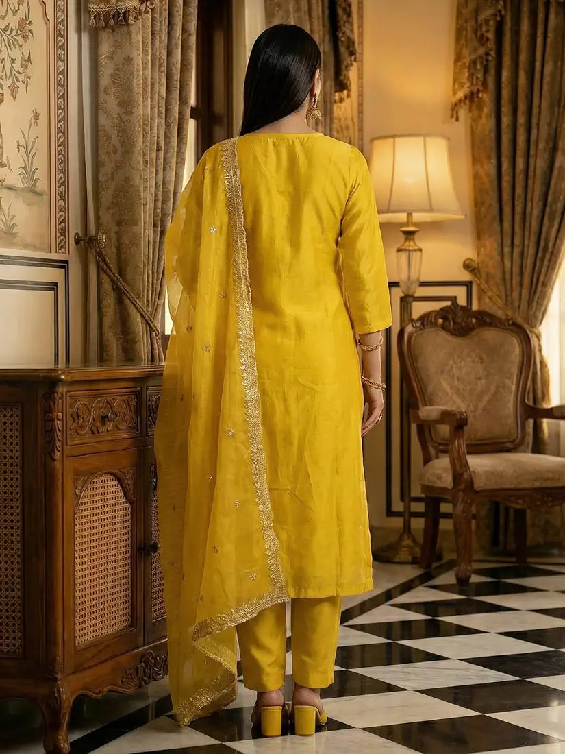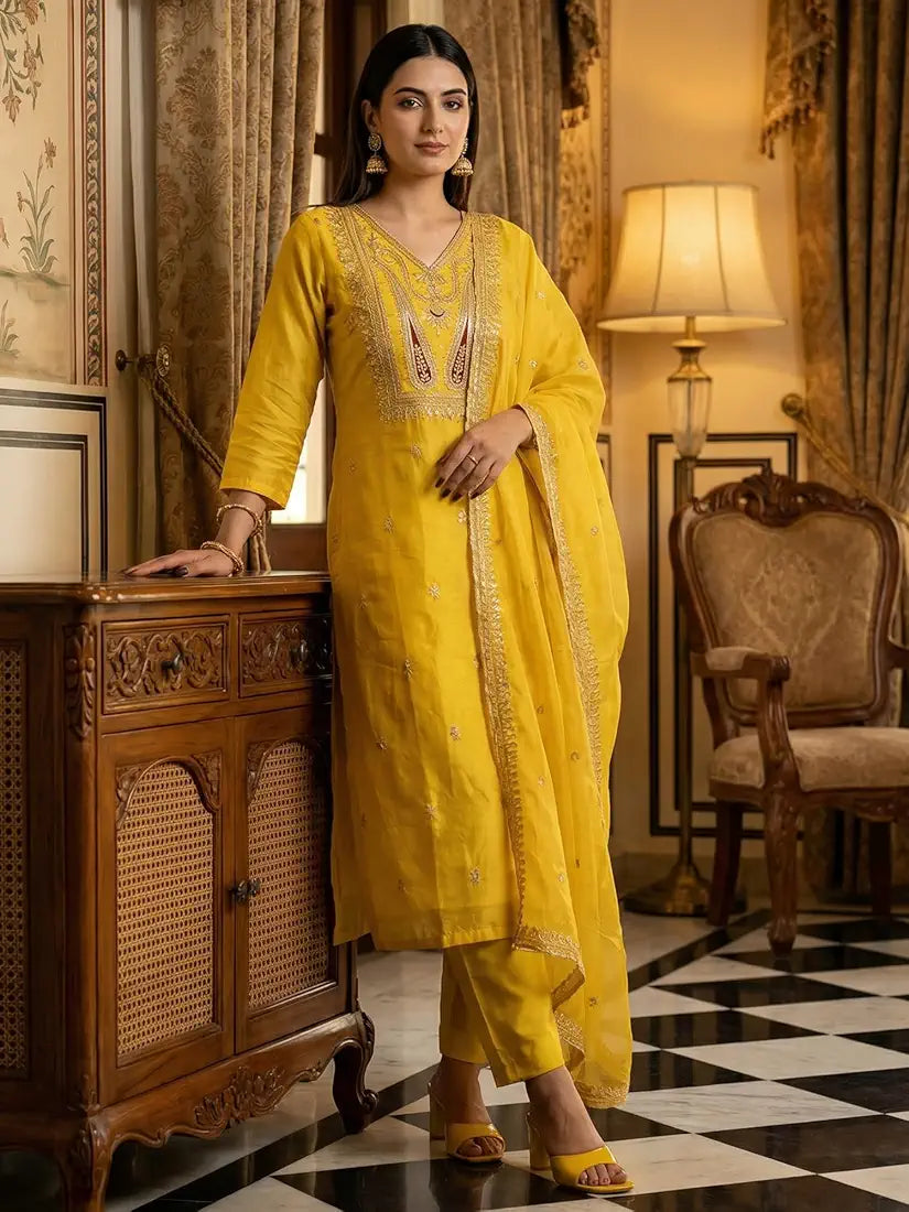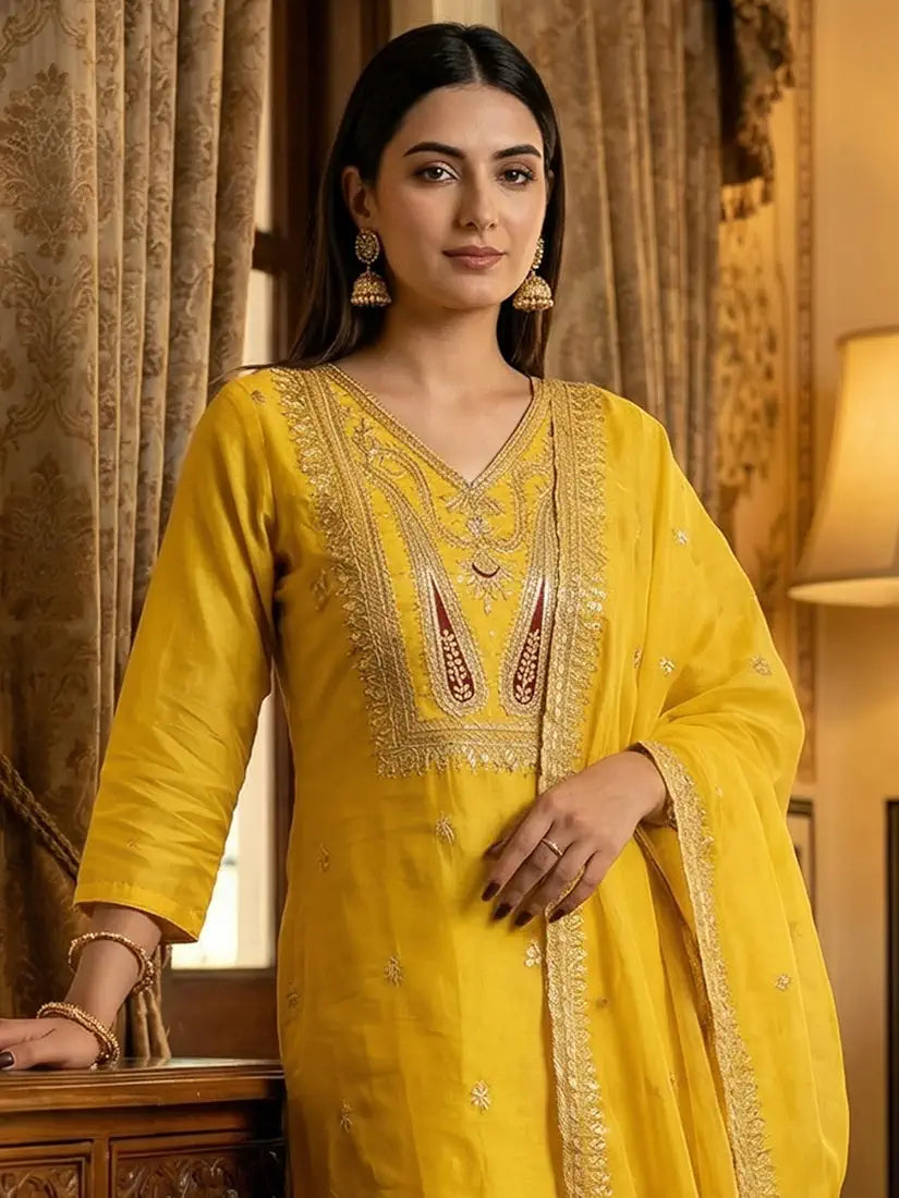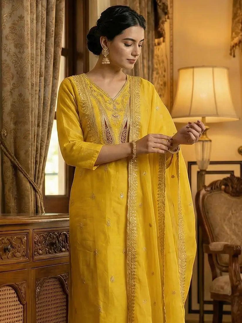 Yellow Embroidered Silk Blend Kurta Set