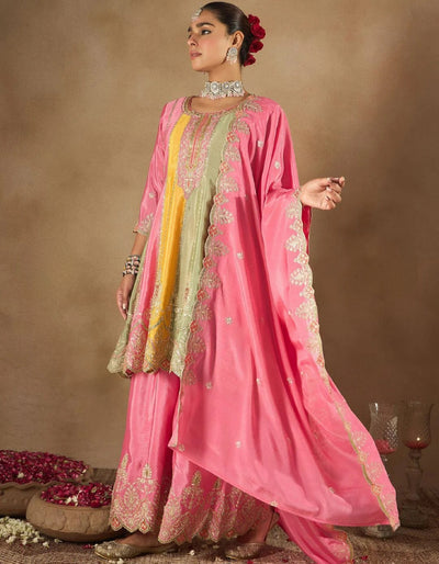 Pink Floral Yoke Embroidered A-Line Kurta Set