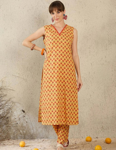 Mustard Yellow and Red Ethnic Motif Printed Cotton Kurta Set