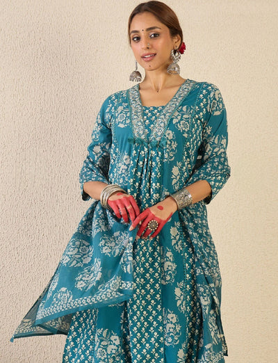 Teal Blue Ethnic Motifs Printed A-Line Pure Cotton Kurta Set