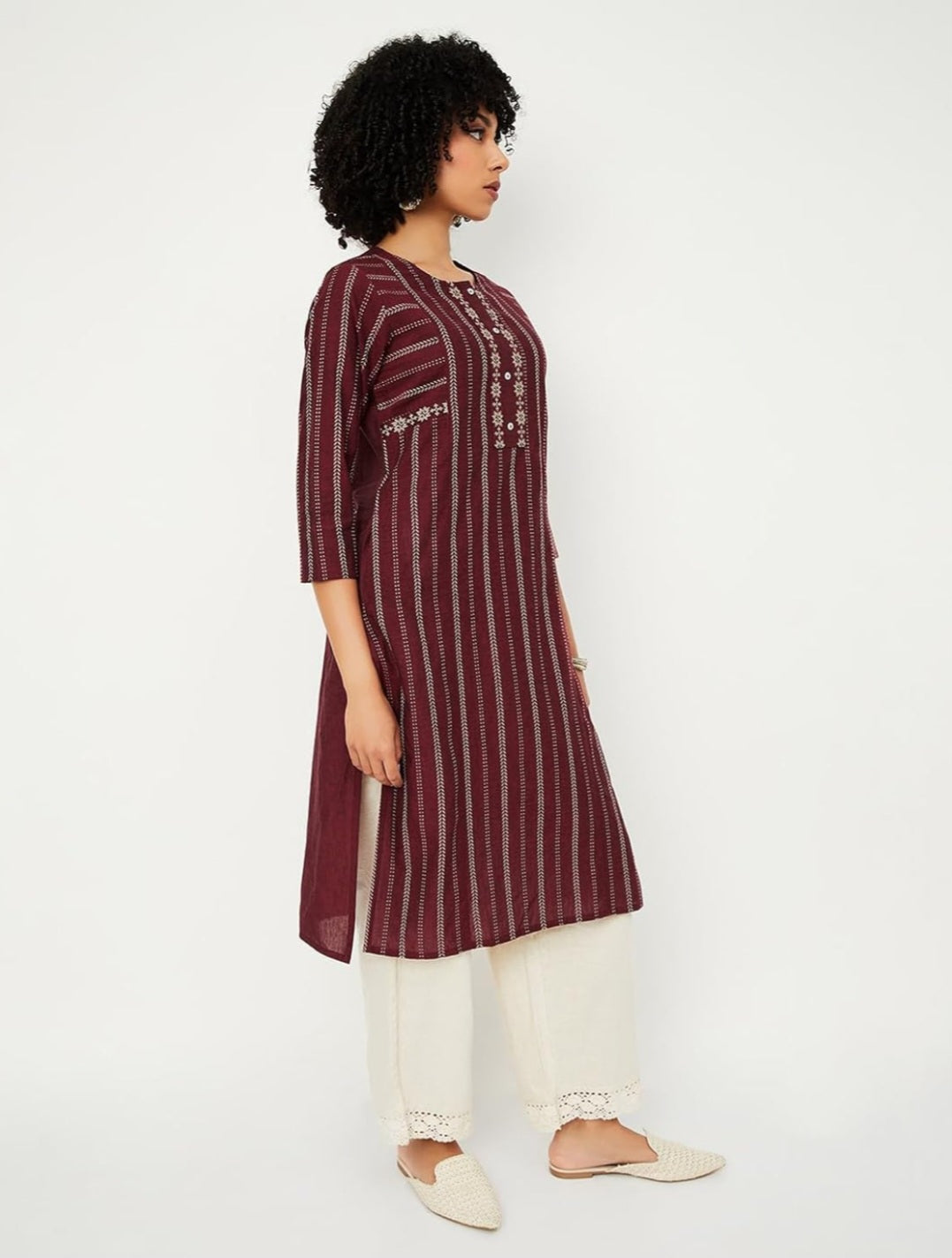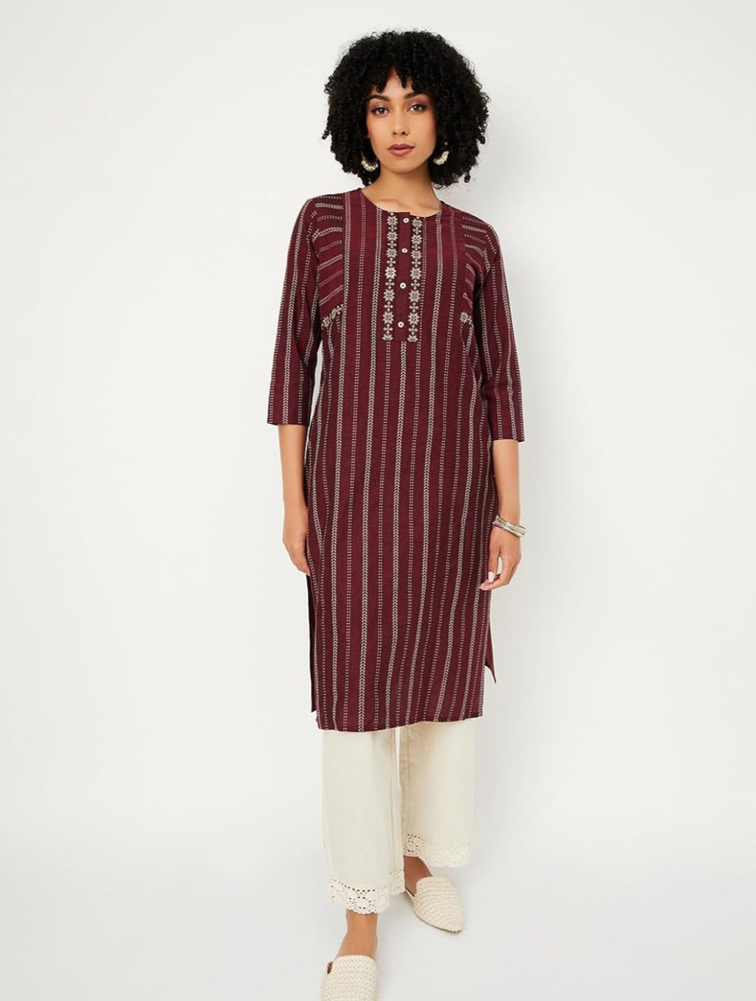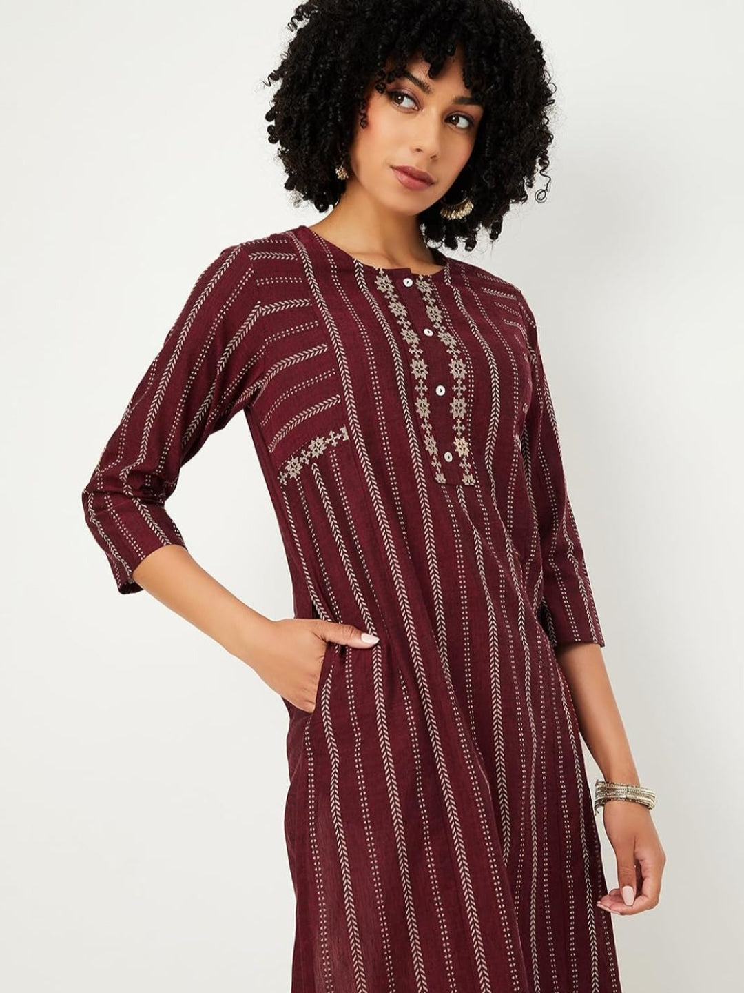 Maroon Striped Straight Cotton Kurta