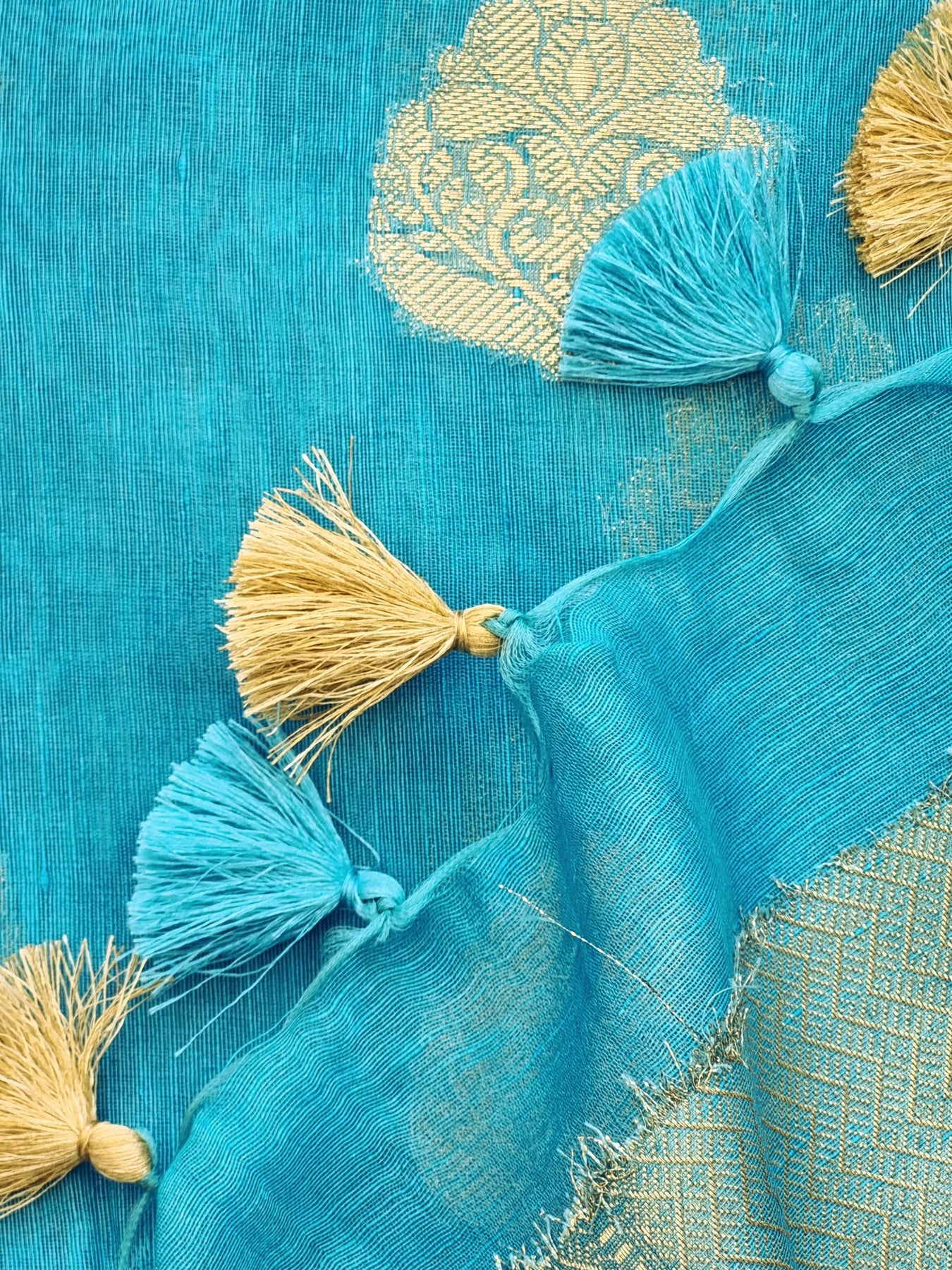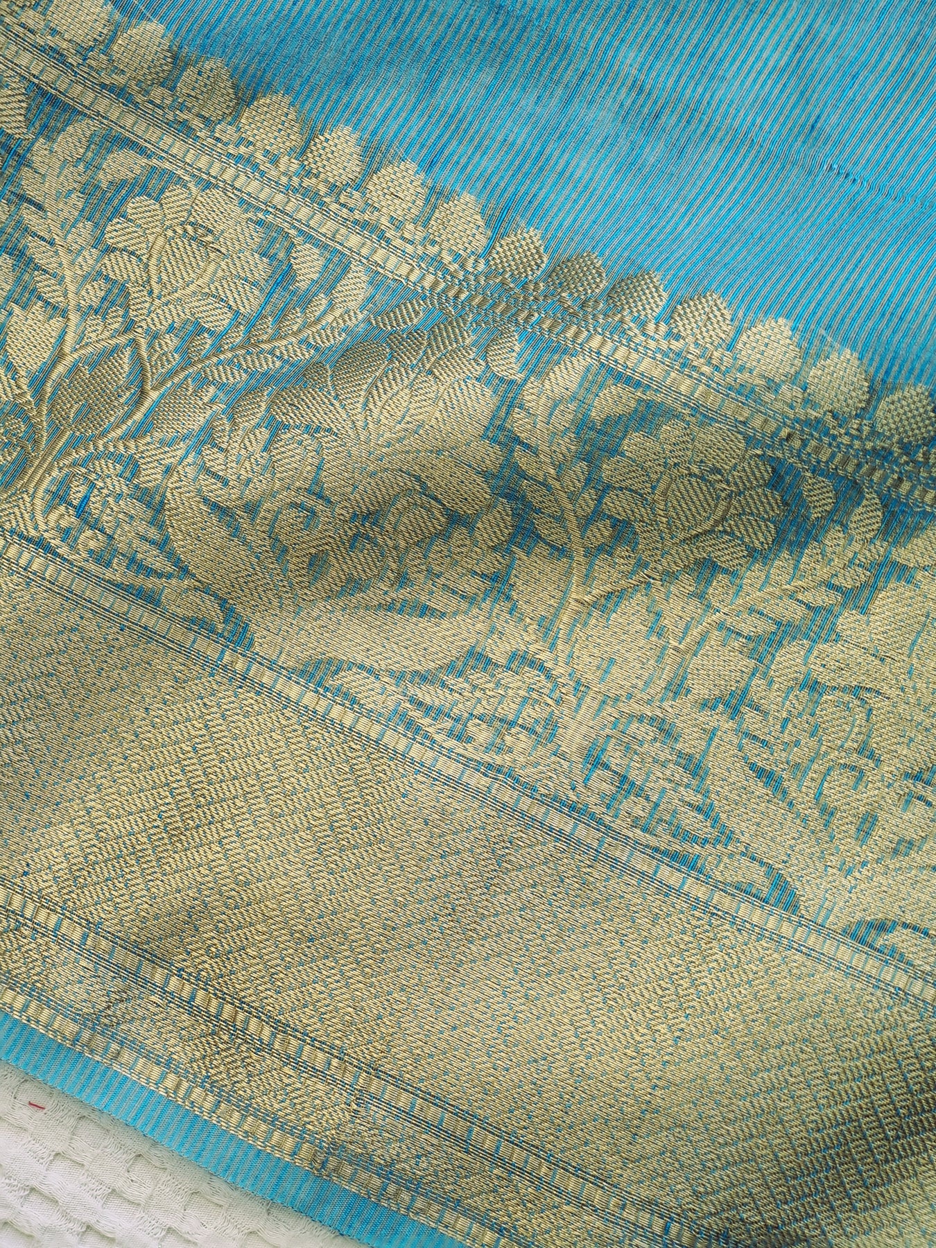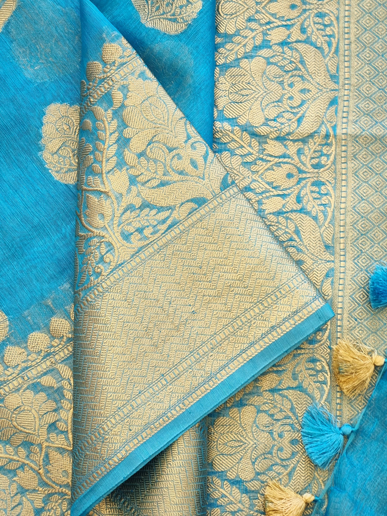 Handloom Blue Silk Linen Saree with Banarasi borders and Pallu
